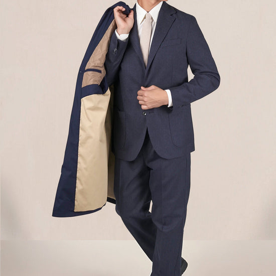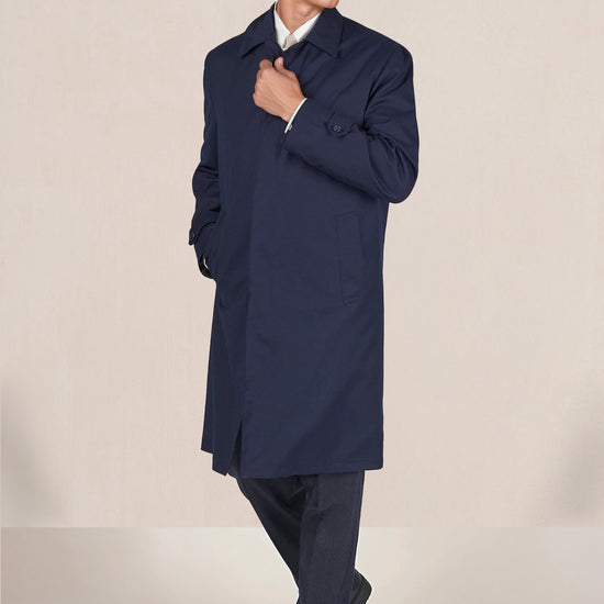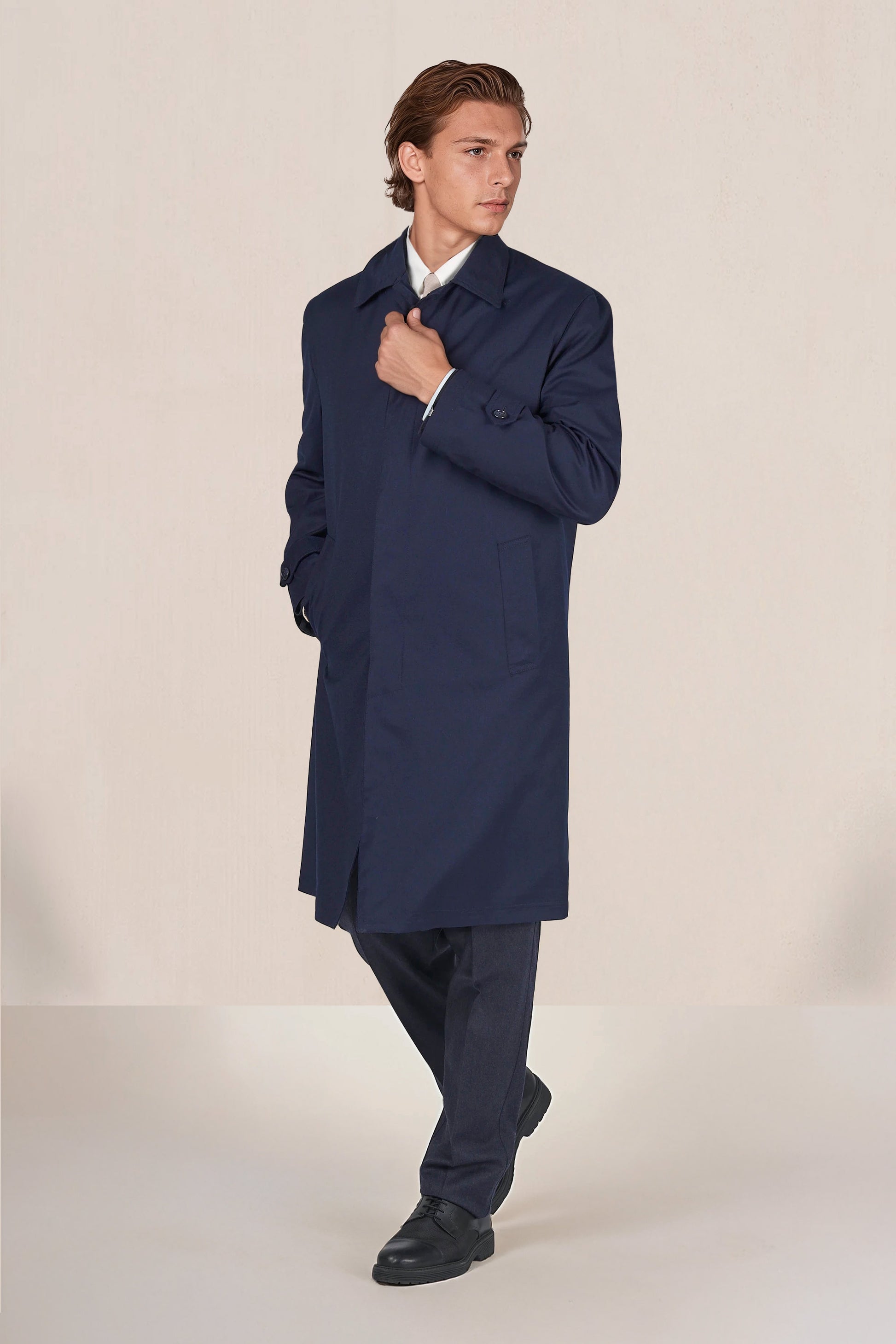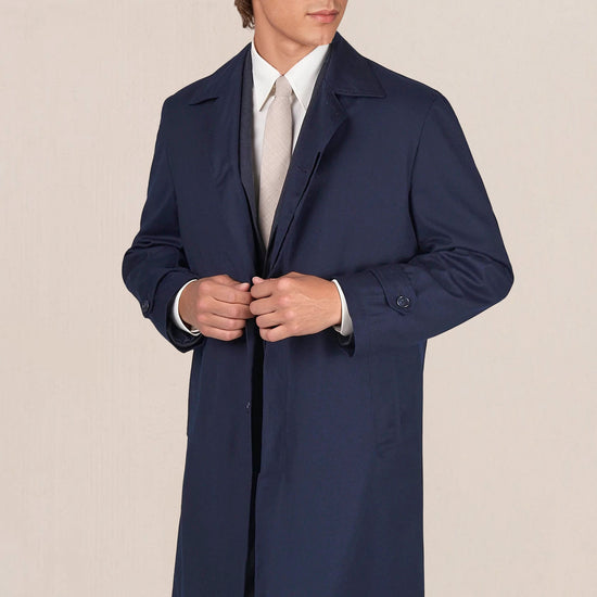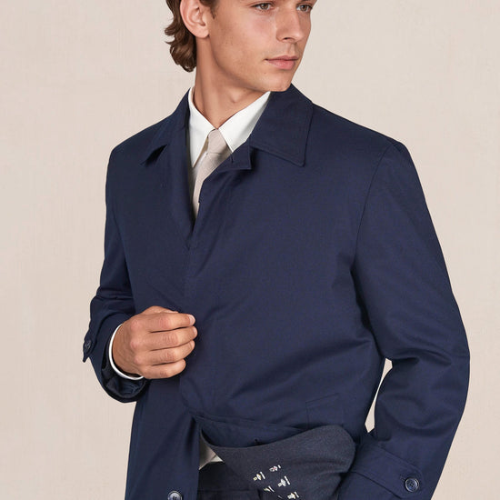 The design features a classic pointed collar, hidden front fastening with zipper and buttons, vertical welt pockets with concealed flaps, adjustable cuffs with tabs and tone-on-tone buttons. The hem is straight and slightly longer for added coverage. Inside, the contrast beige and navy lining with neatly finished technical trims underlines the smart, functional soul of the piece.