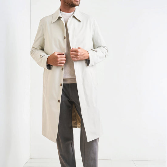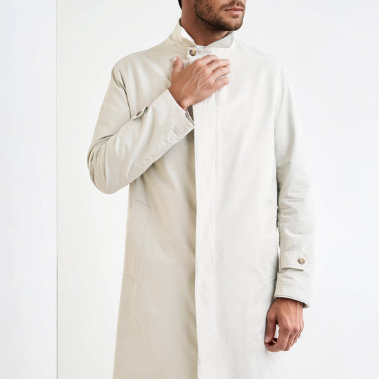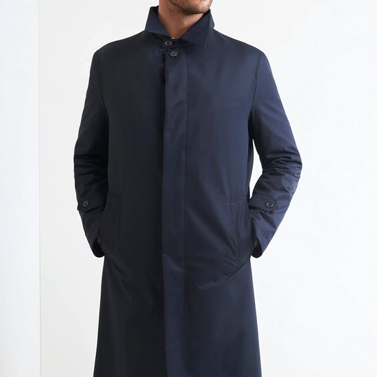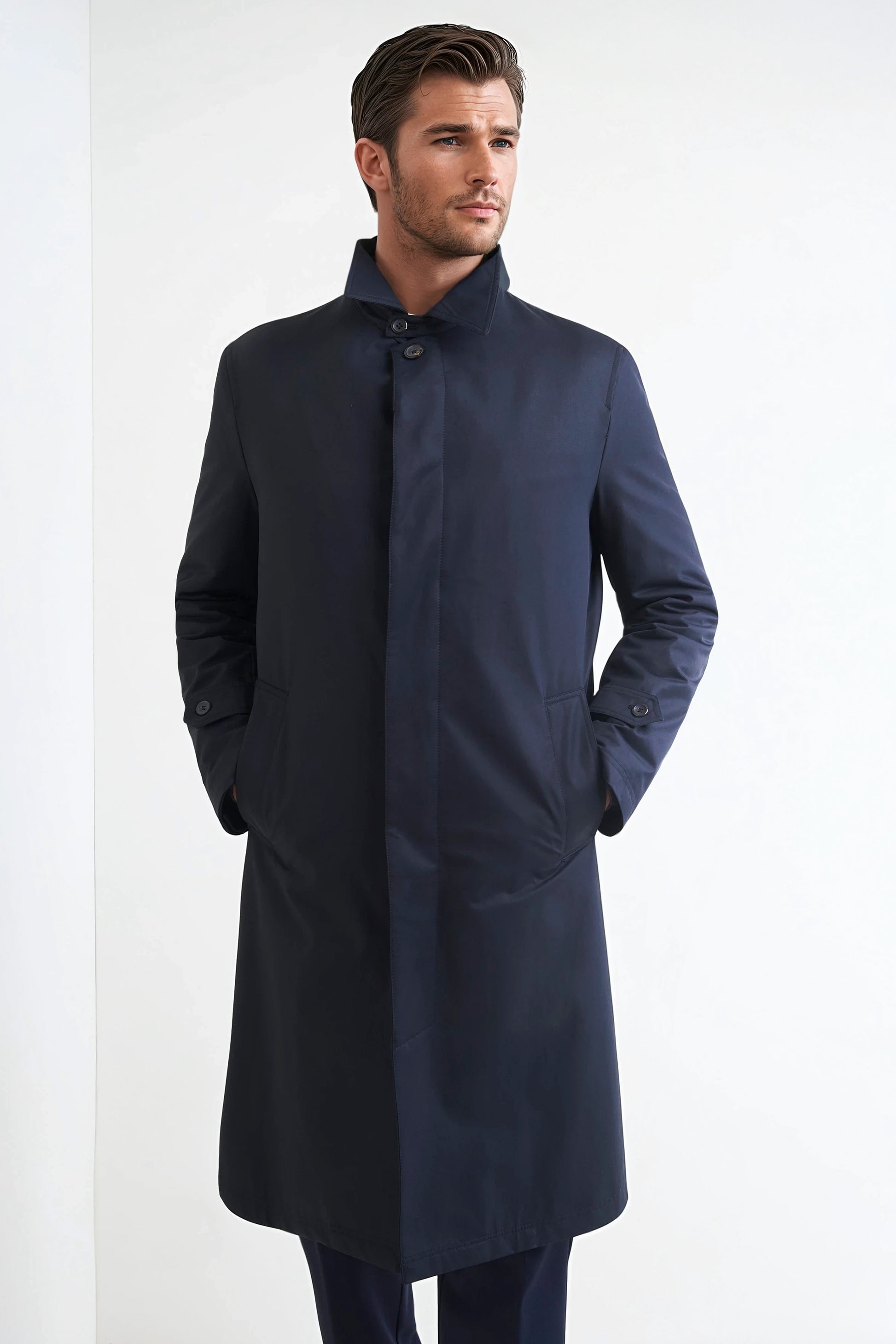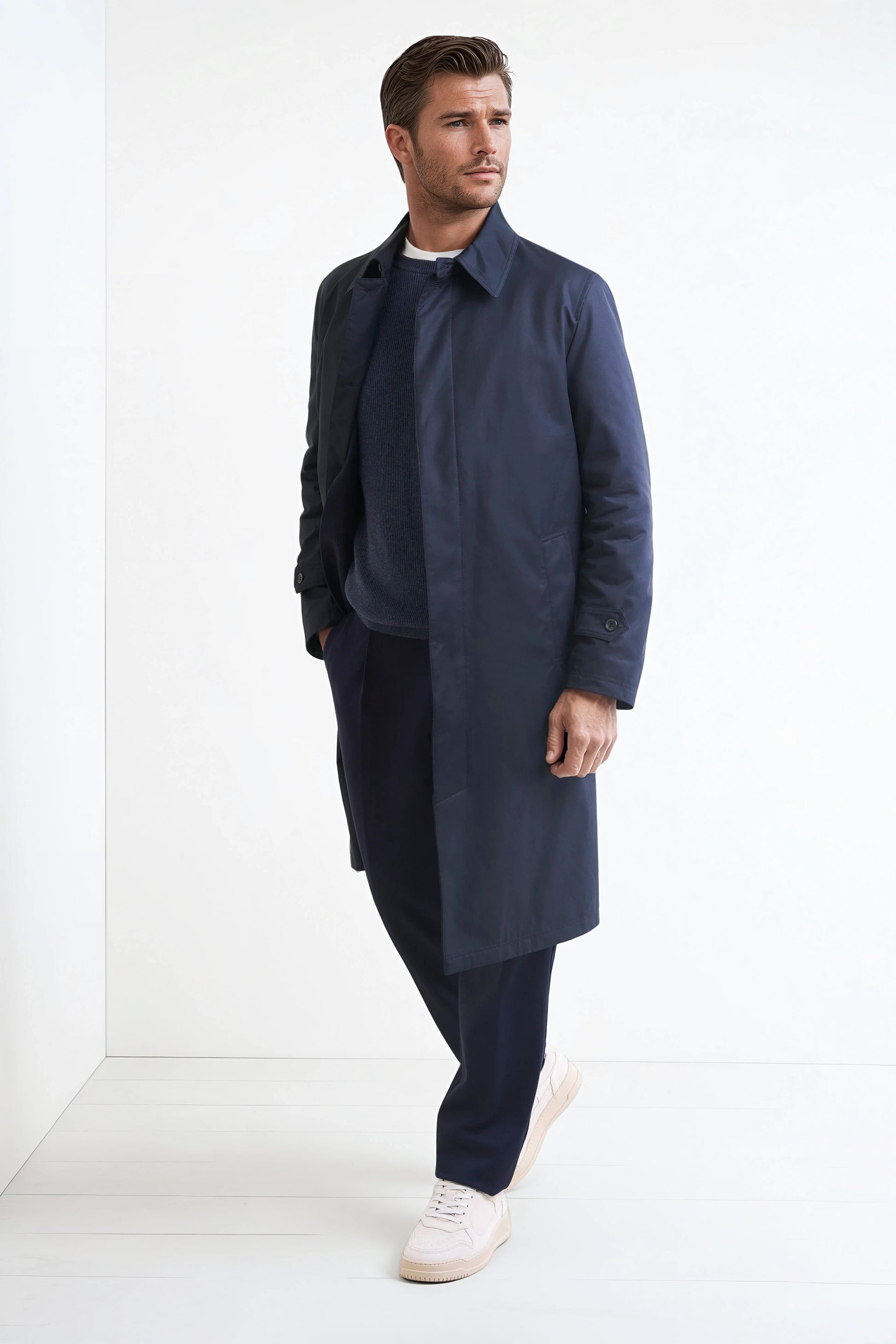 Timeless, clean-lined raincoat made from a water-resistant technical fabric cotton and polyamide with a compact hand and protection from light rain and wind. The front features a concealed button placket with a single visible top button so the collar can be worn up on breezy days. Slanted welt hand pockets keep the silhouette sharp, while adjustable buttoned tabs at the cuffs tighten the sleeves over tailoring or knitwear. Fully lined for comfort and an easy glide over a suit; a back vent ensures ease of movement. Knee-length proportions, neat stitching and reinforced finishing make it a versatile piece from office to off-duty.