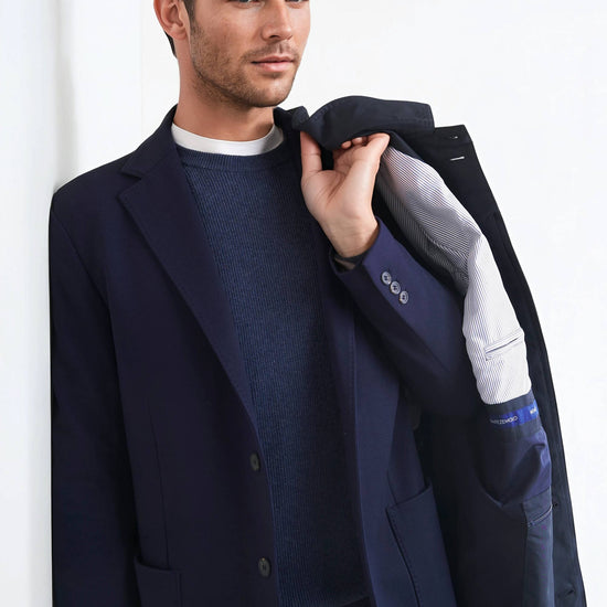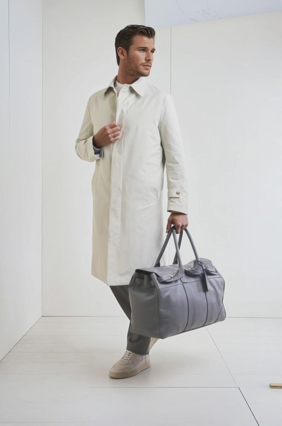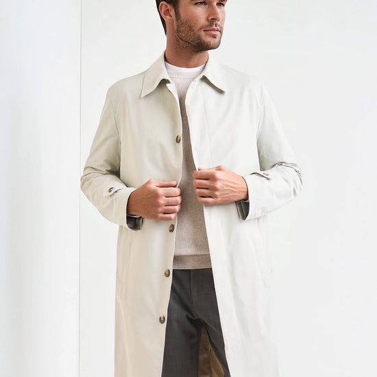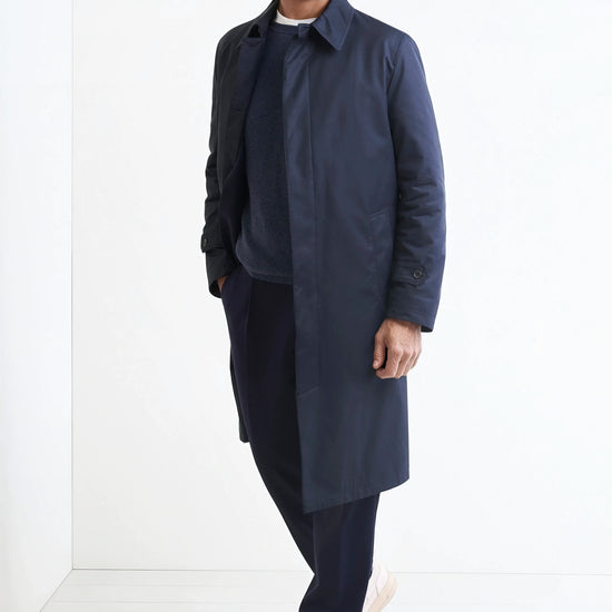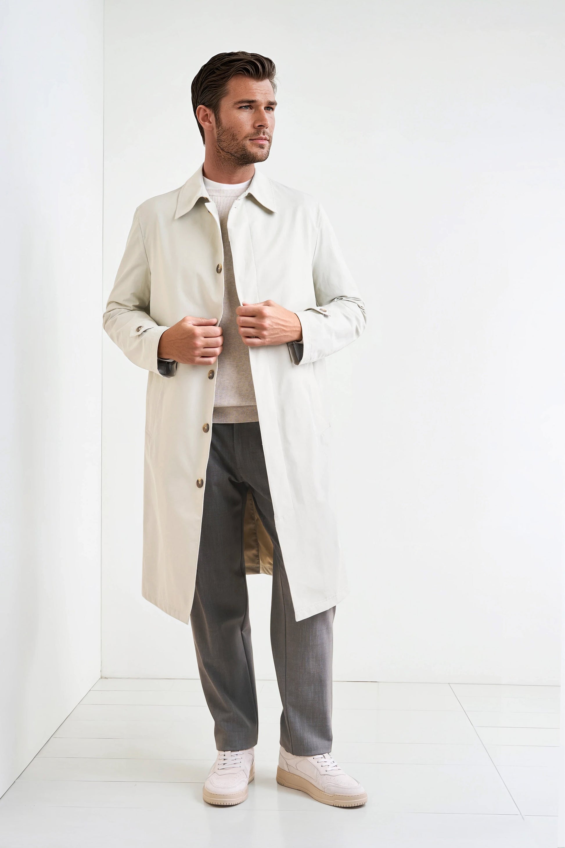 Timeless, clean-lined raincoat made from a water-resistant technical fabric cotton and polyamide with a compact hand and protection from light rain and wind. The front features a concealed button placket with a single visible top button so the collar can be worn up on breezy days. Slanted welt hand pockets keep the silhouette sharp, while adjustable buttoned tabs at the cuffs tighten the sleeves over tailoring or knitwear. Fully lined for comfort and an easy glide over a suit; a back vent ensures ease of movement. Knee-length proportions, neat stitching and reinforced finishing make it a versatile piece from office to off-duty.