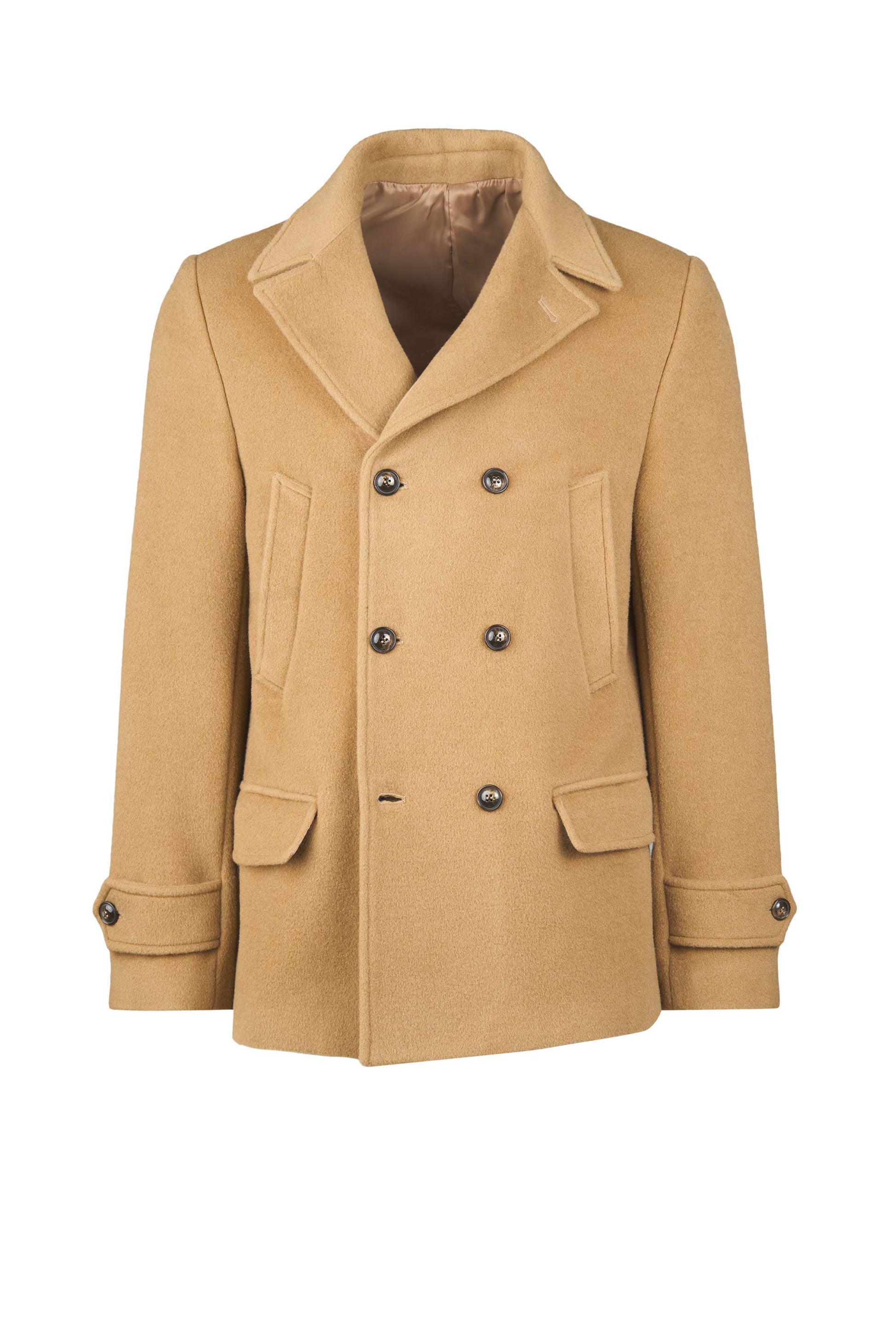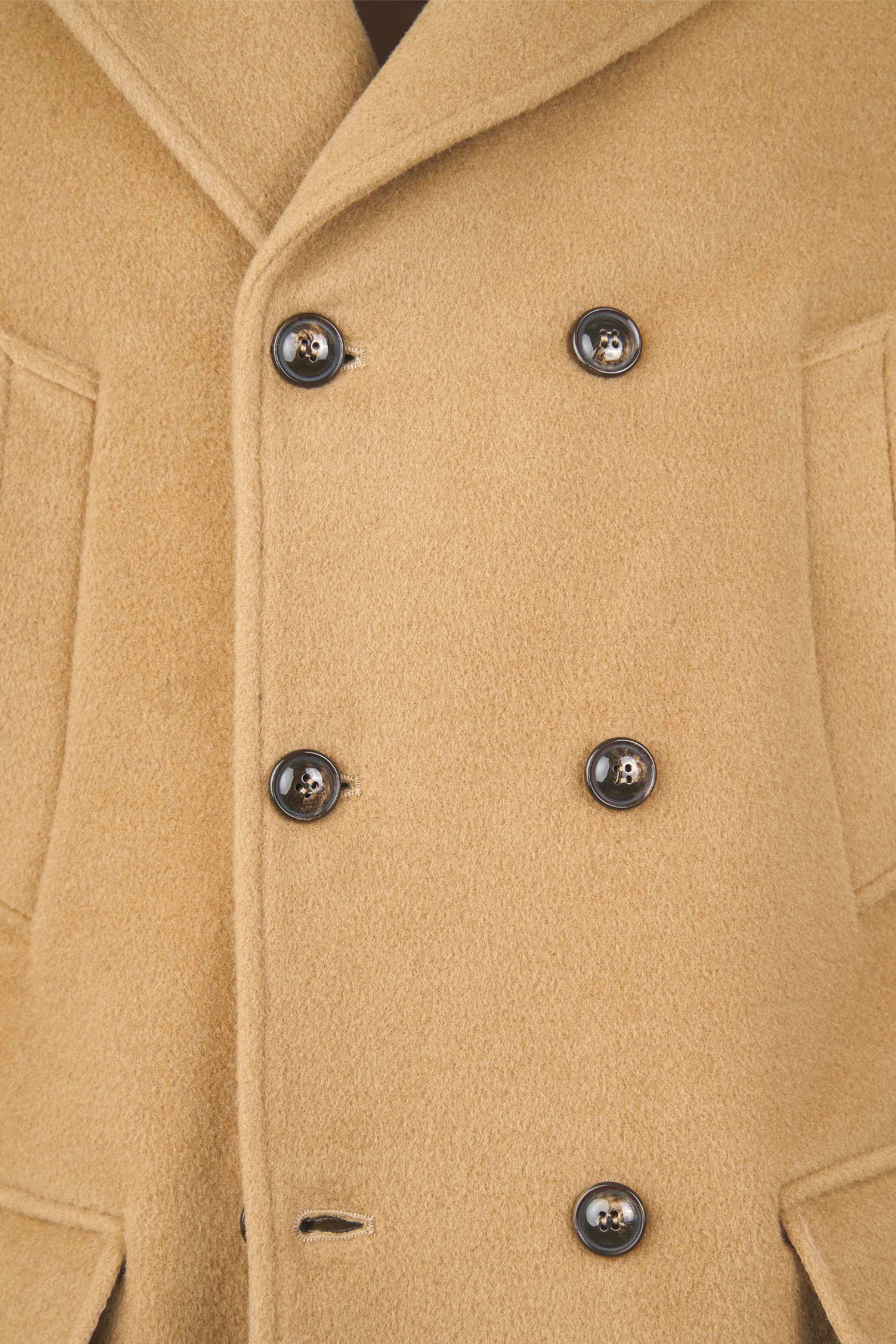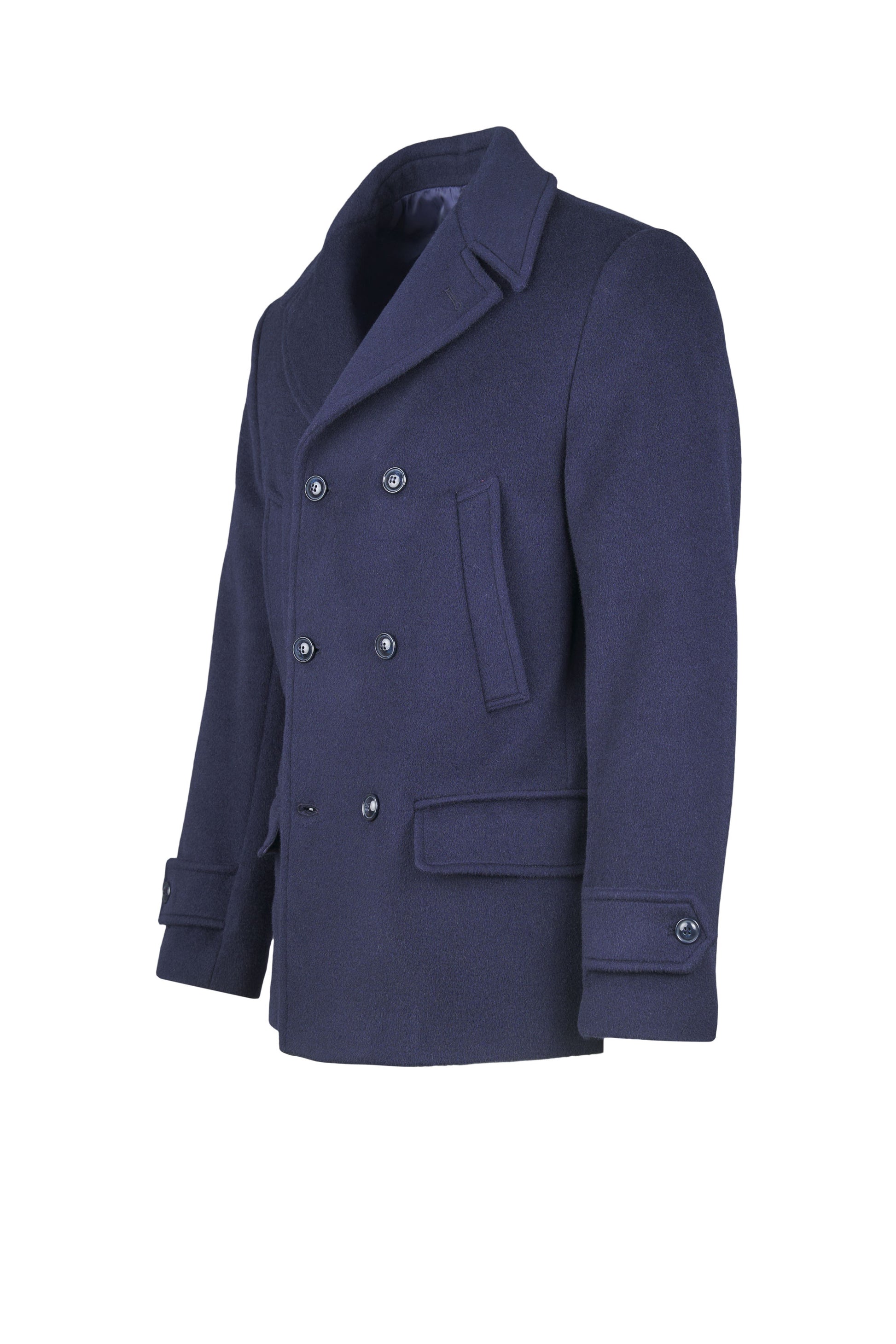 A timeless naval-inspired peacoat, rebuilt with crisp, compact tailoring. The front features a 6×2 double-breasted closure with broad lapels that can be flipped up for extra protection; an internal jigger button keeps the front neatly anchored. Slanted hand-warmer welt pockets sit high on the chest, while two patch pockets with flaps at the hips add storage and structure. Clean side lines, a natural, comfortable shoulder, and cuff tabs with button adjusters refine the silhouette. The length covers the hips and a single center vent ensures ease of movement. It’s fully lined in satin with inner document pockets. Horn-effect resin buttons are lily-stitched for strength. The wool cloth enriched with mohair provides body, shape retention and warmth, with the subtly furry surface that defines an authentic peacoat. Regular fit: sharp over tailoring, effortless with denim and boots.