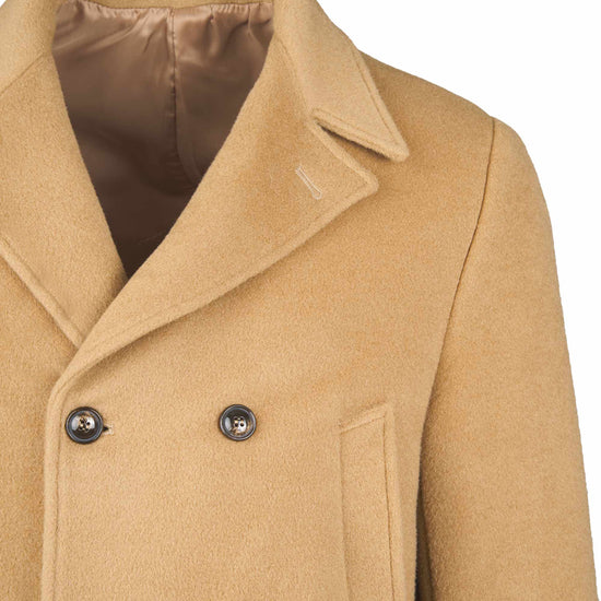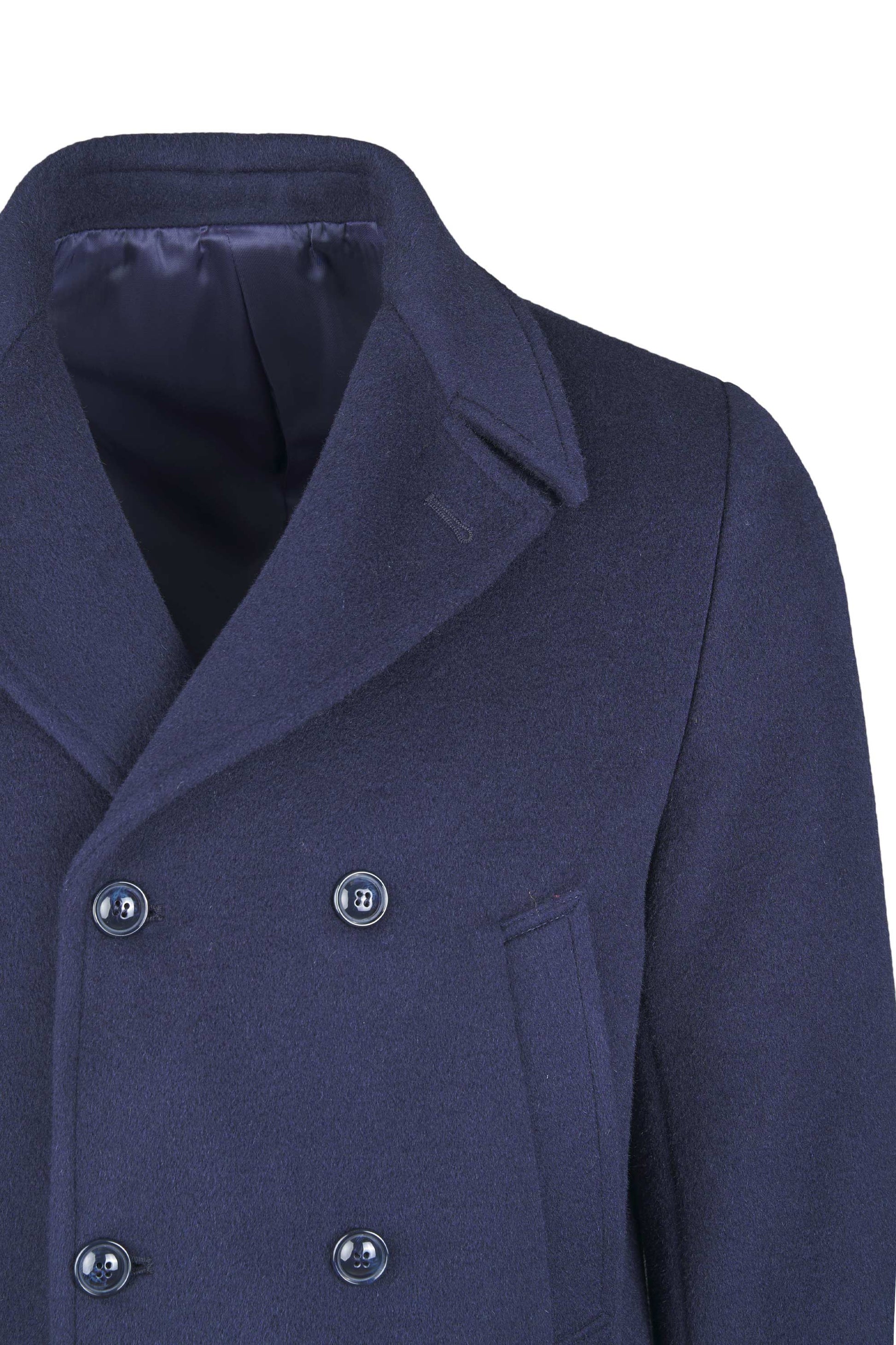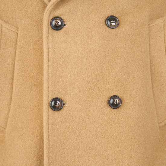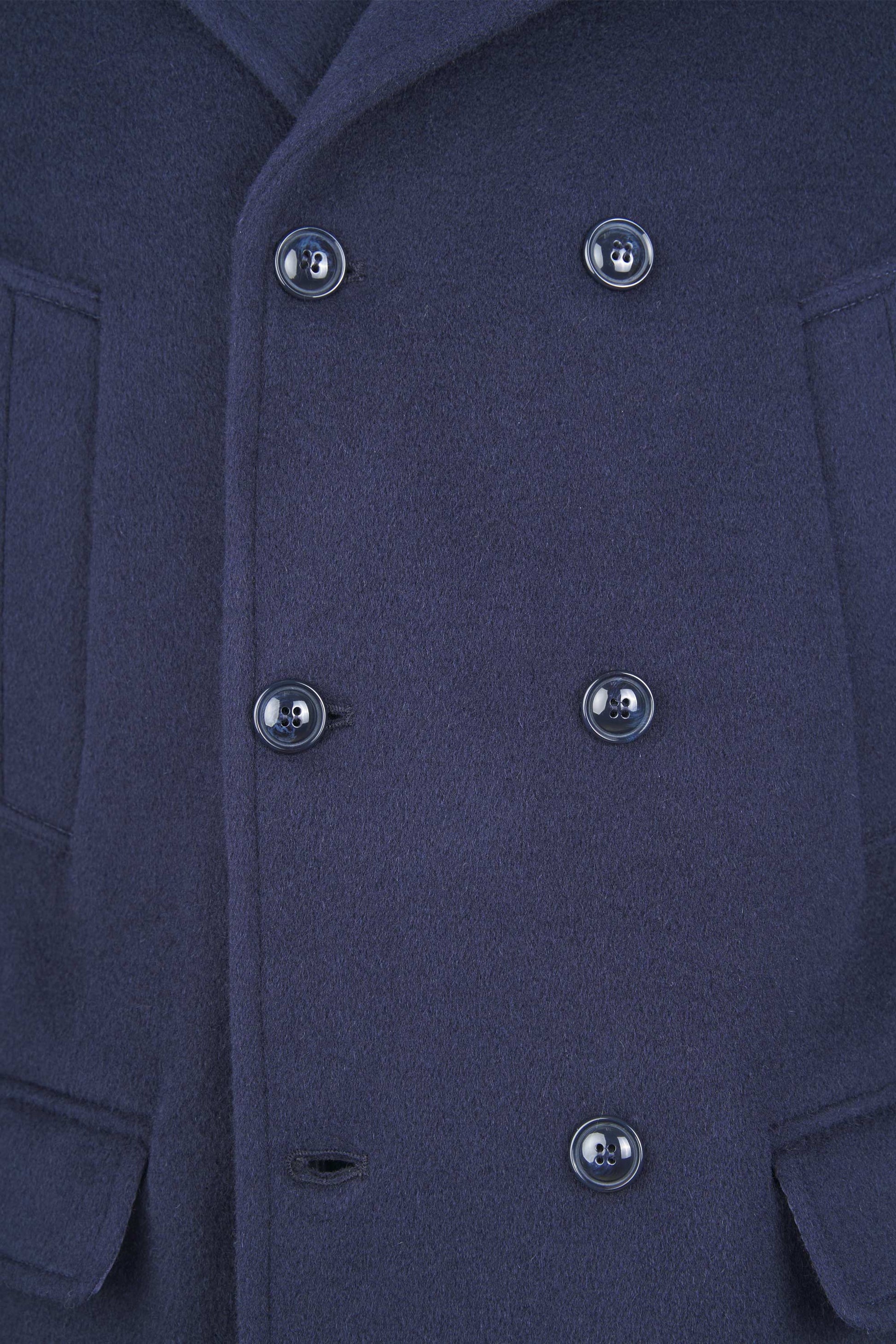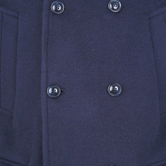 A timeless naval-inspired peacoat, rebuilt with crisp, compact tailoring. The front features a 6×2 double-breasted closure with broad lapels that can be flipped up for extra protection; an internal jigger button keeps the front neatly anchored. Slanted hand-warmer welt pockets sit high on the chest, while two patch pockets with flaps at the hips add storage and structure. Clean side lines, a natural, comfortable shoulder, and cuff tabs with button adjusters refine the silhouette. The length covers the hips and a single center vent ensures ease of movement. It’s fully lined in satin with inner document pockets. Horn-effect resin buttons are lily-stitched for strength. The wool cloth enriched with mohair provides body, shape retention and warmth, with the subtly furry surface that defines an authentic peacoat. Regular fit: sharp over tailoring, effortless with denim and boots.