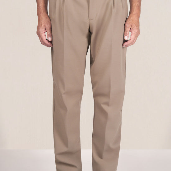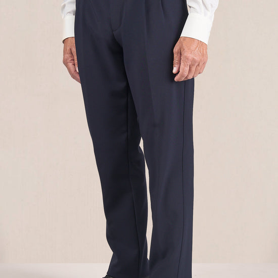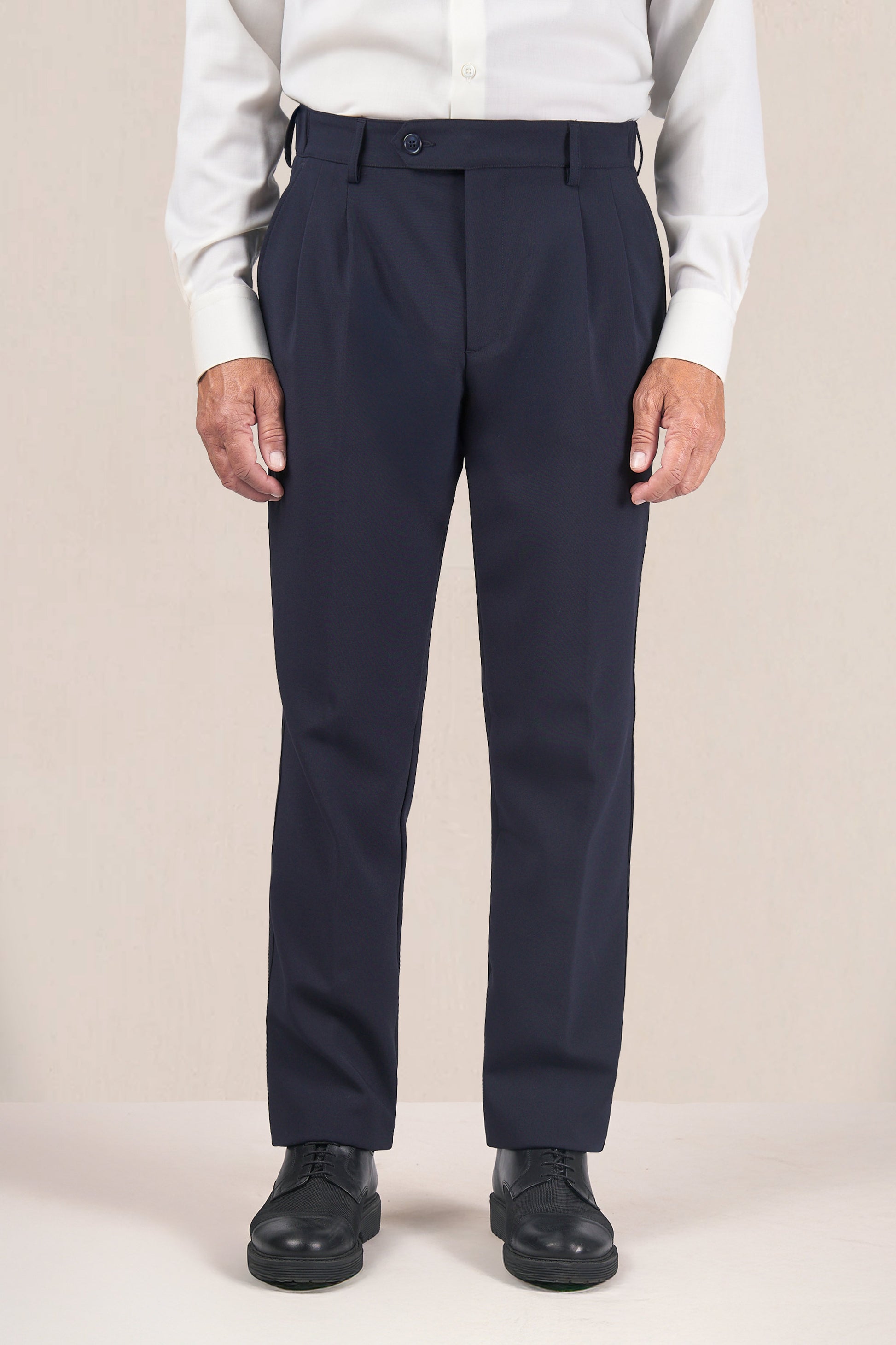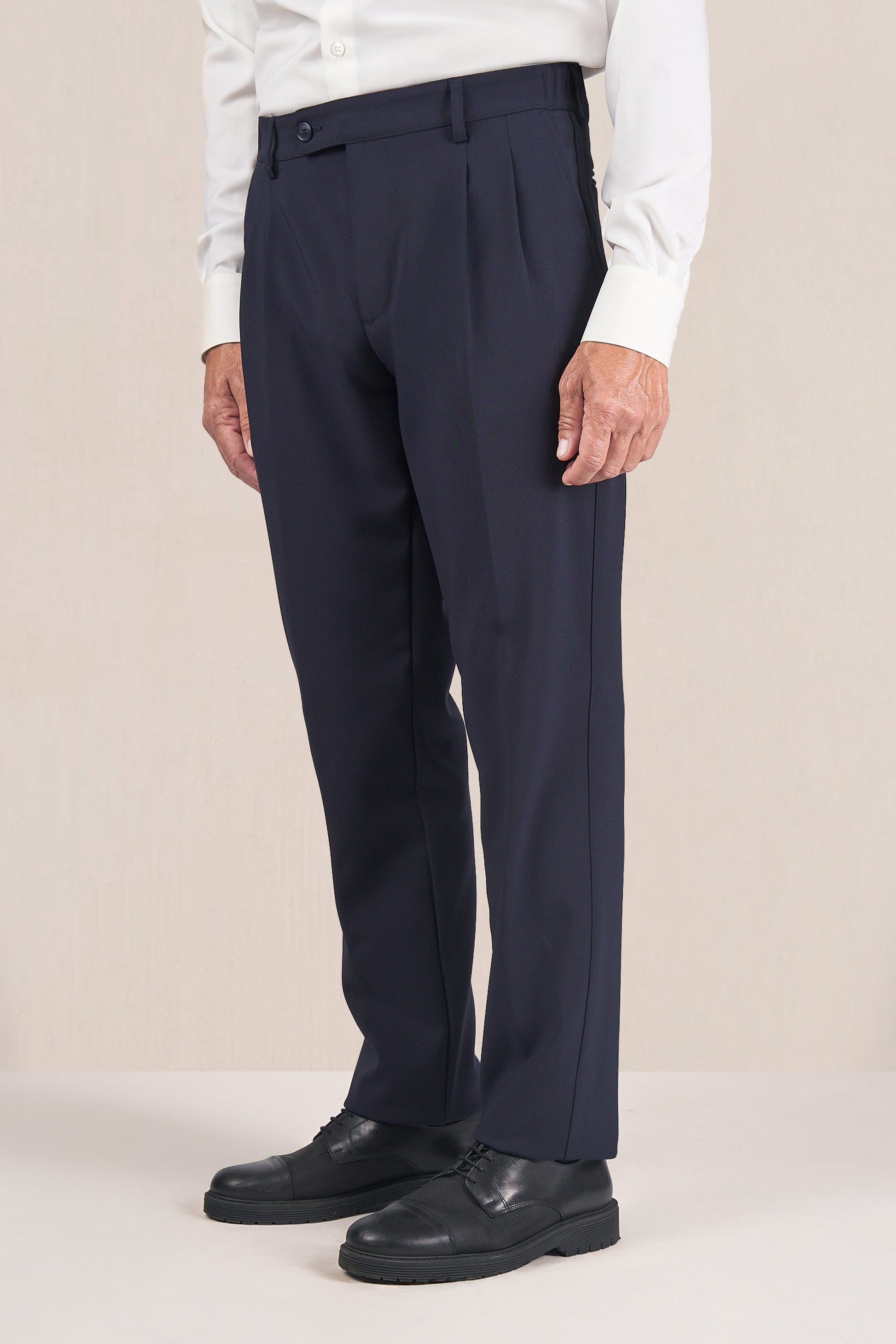 Formal trousers with double front pleats and waistband with elasticated side inserts that follow your movements and improve comfort. Regular fit with straight leg and crease ironed along the length for a clean profile. Mid-rise waist with belt loops, front closure with zip fly, internal hook and button on extended fly. Slanted American pockets at the front; welt pockets at the back. Clean finish at the bottom. The polyester-viscose blend fabric with a small percentage of elastane ensures a compact feel, neat drape, crease resistance, and comfortable elasticity: ideal for everyday use and travel.