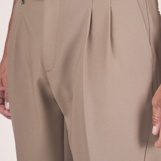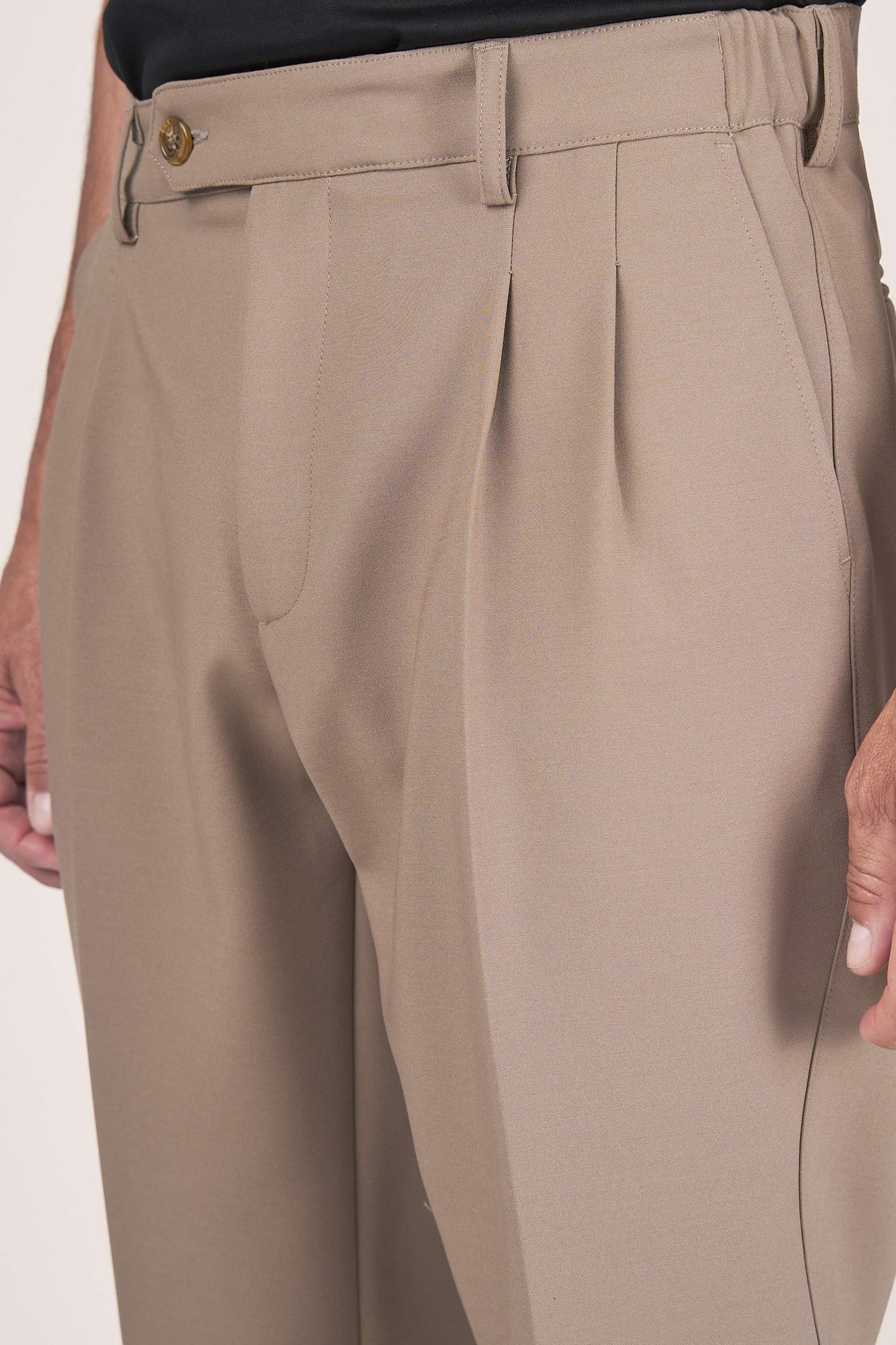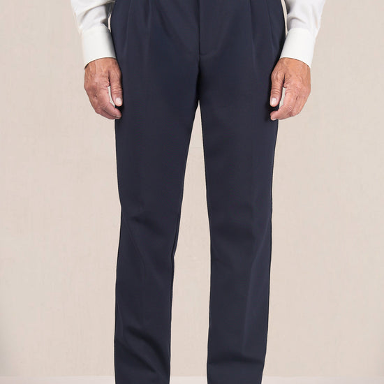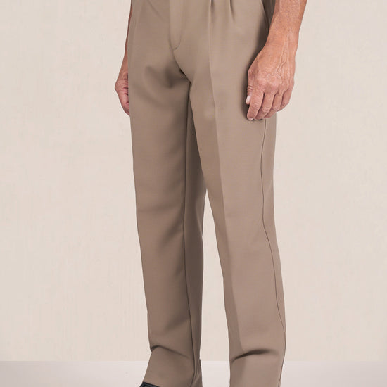 Double front pleats Side elastic at waistband Straight leg with pressed crease Front zip fly, hook & button Pockets: 2 slanted; 2 back welt; Belt loops
