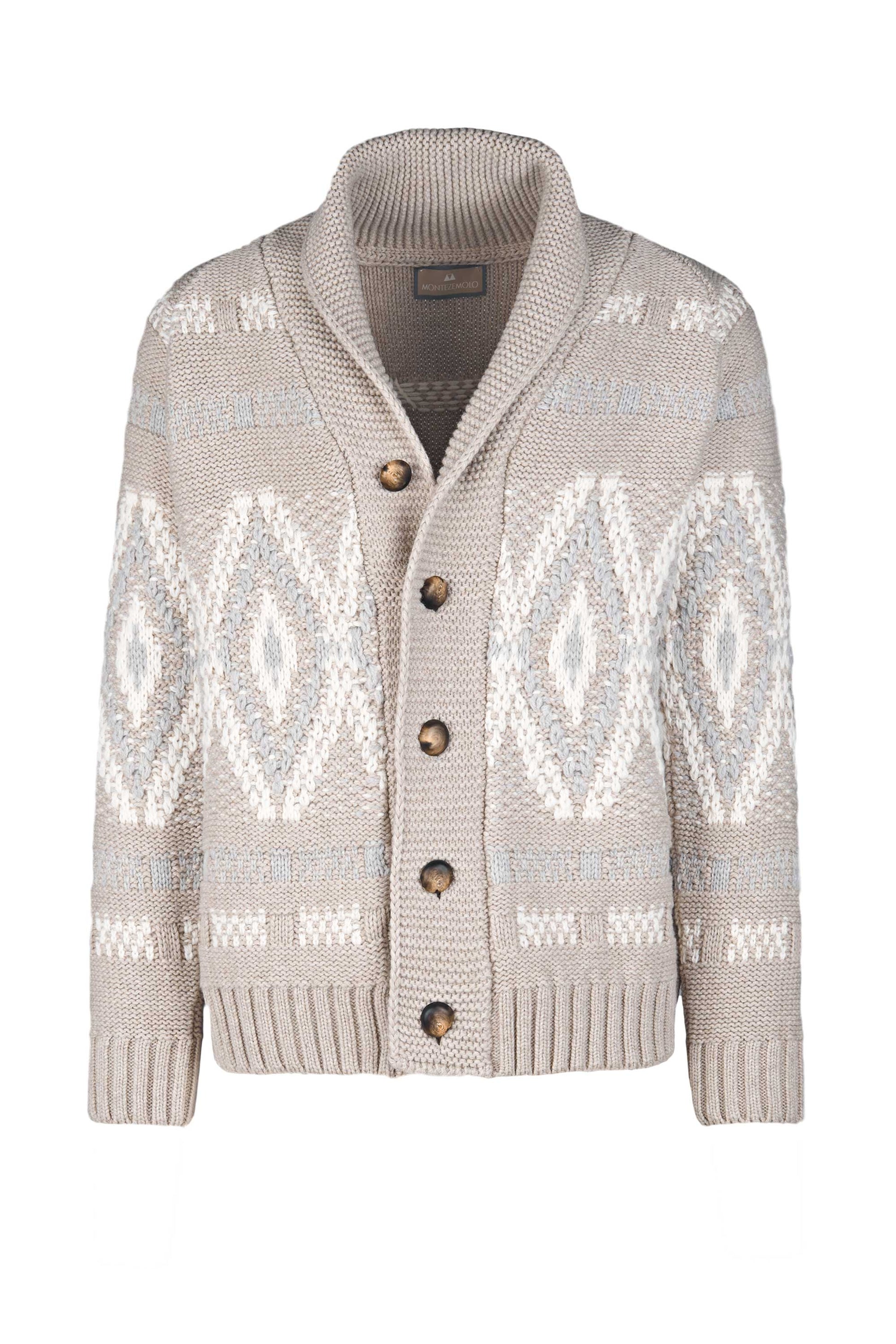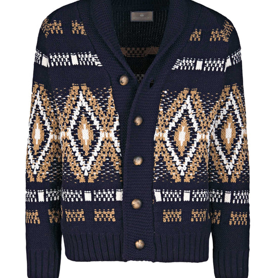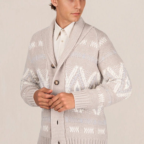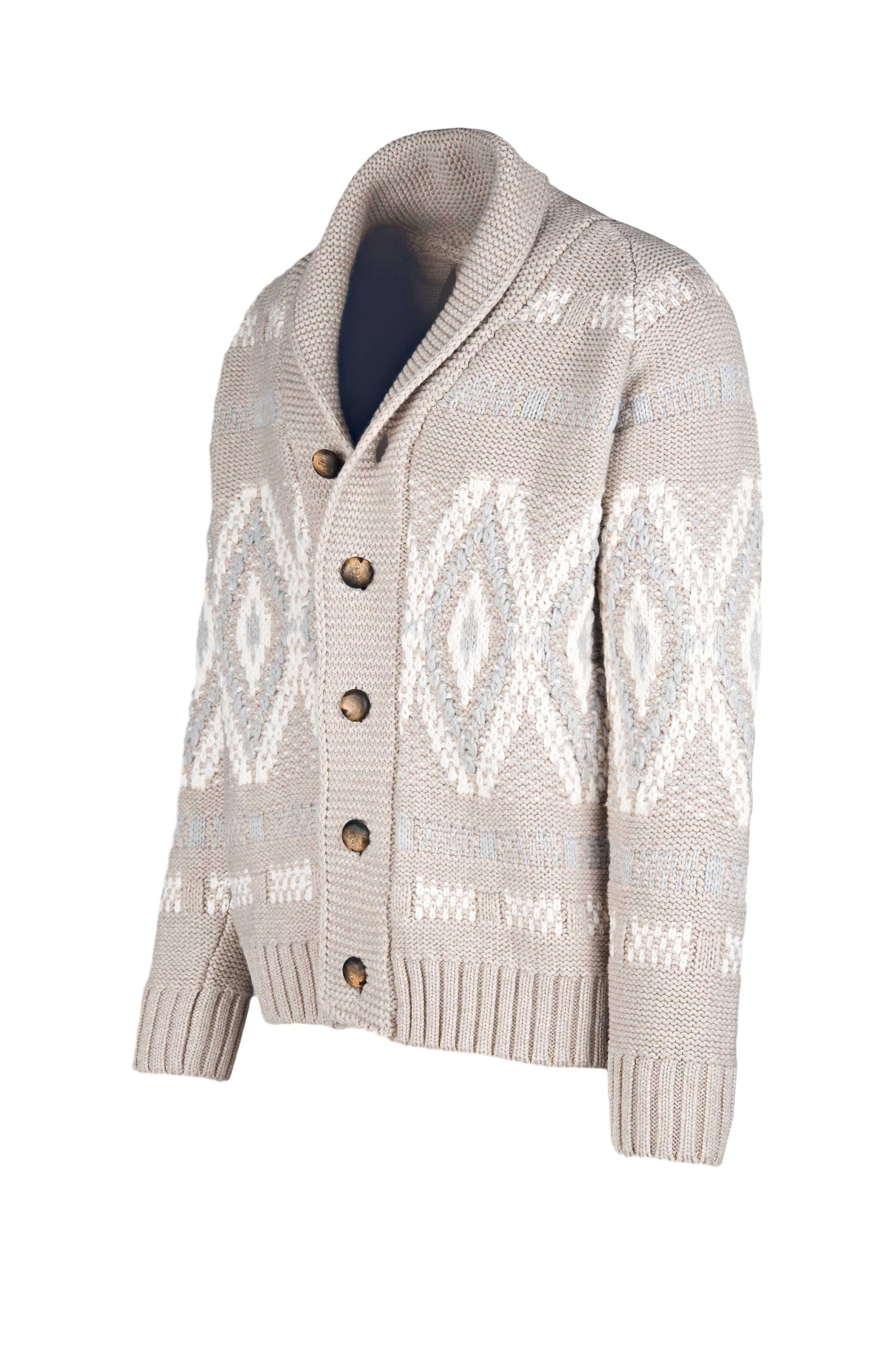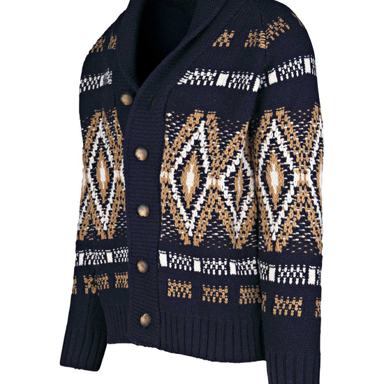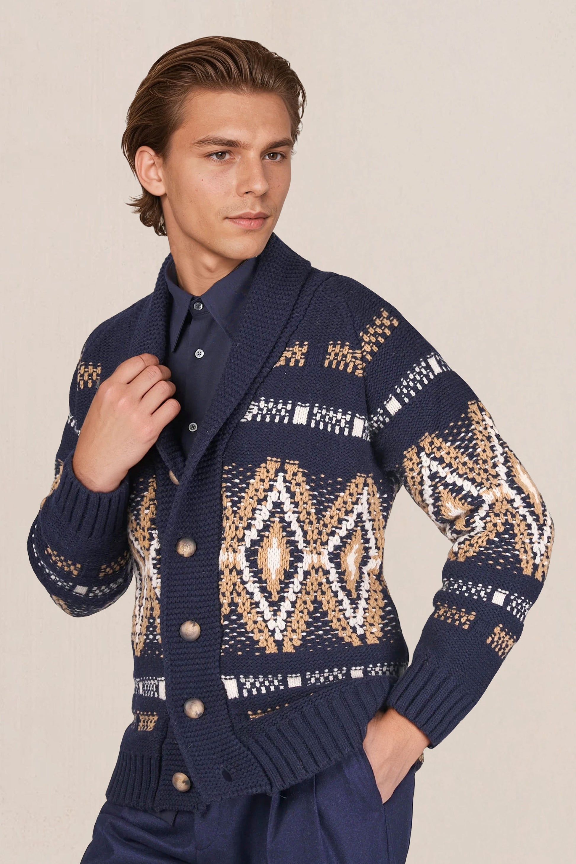 Cozy shawl collar. Five horn-effect buttons. All-over geometric jacquard pattern. Ribbed cuffs and hem. Regular fit. Two colorways: sand/ice/grey and navy/camel/white.