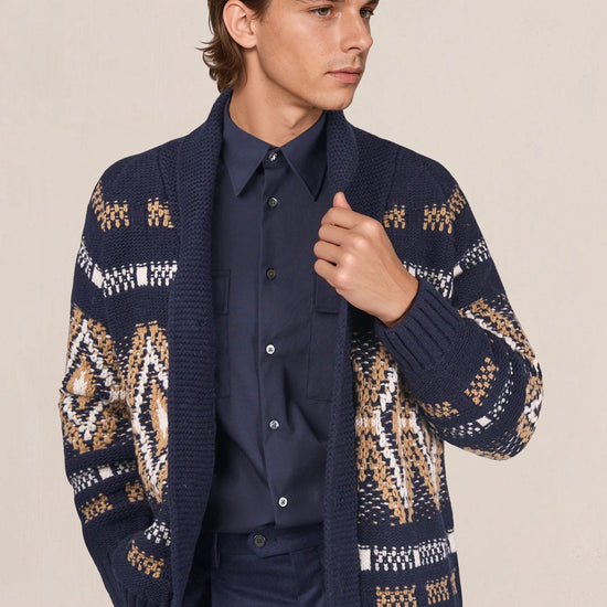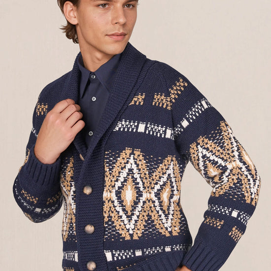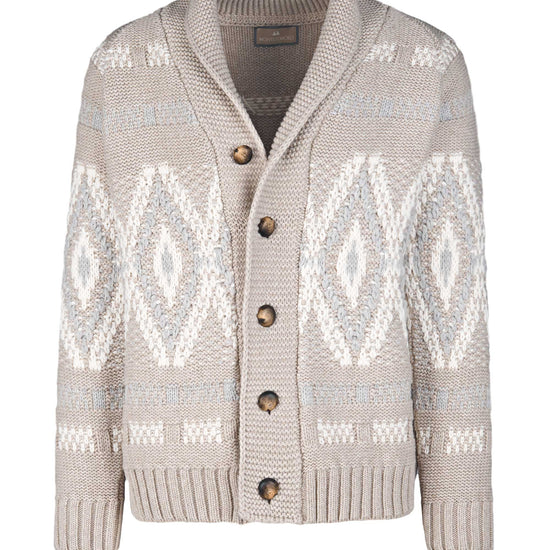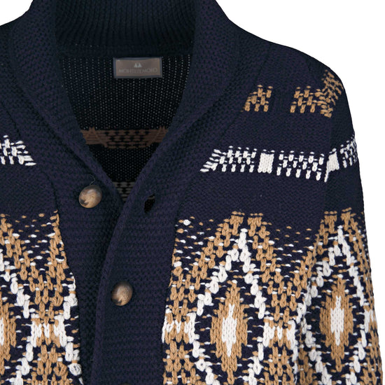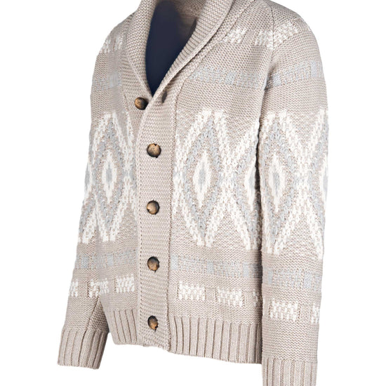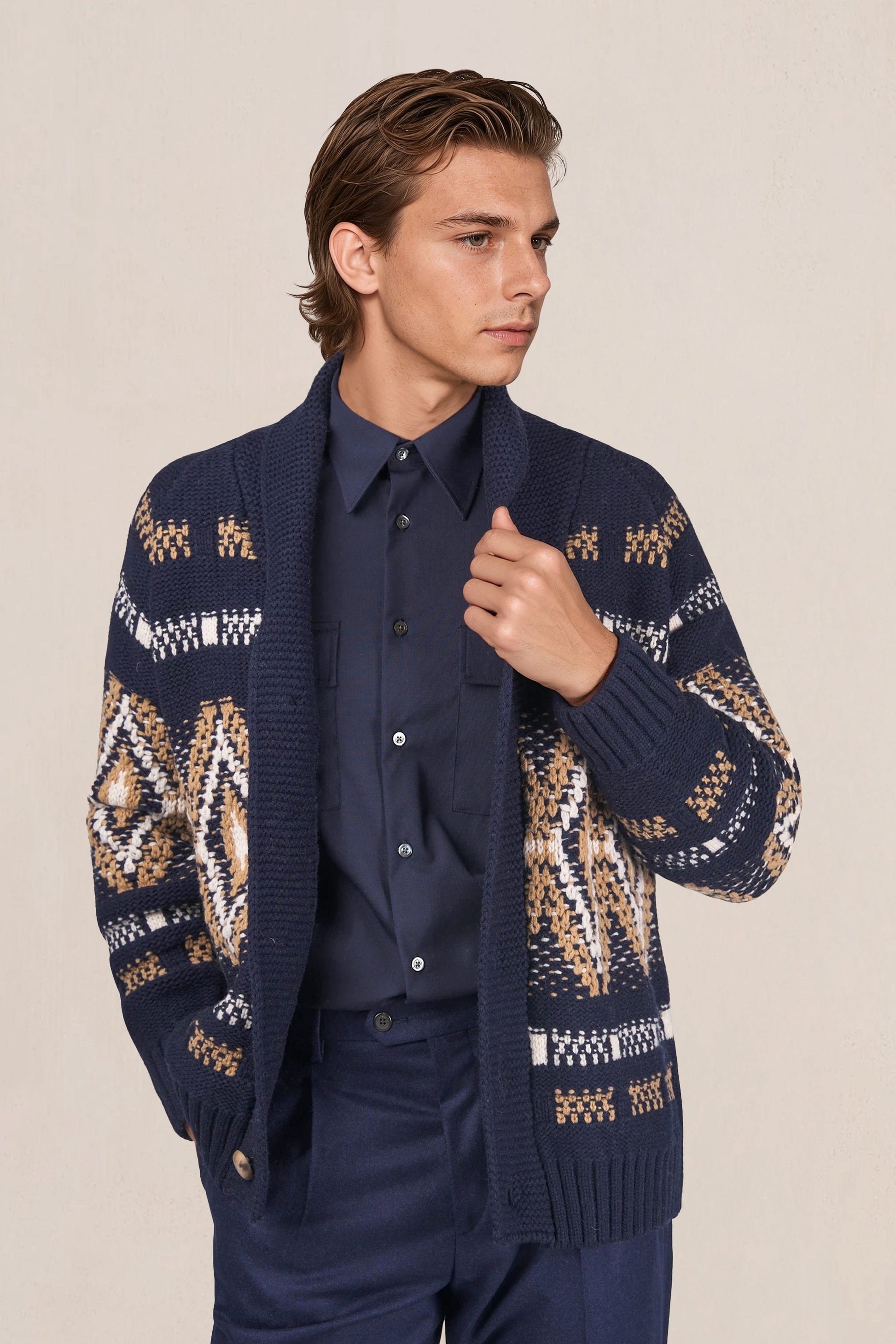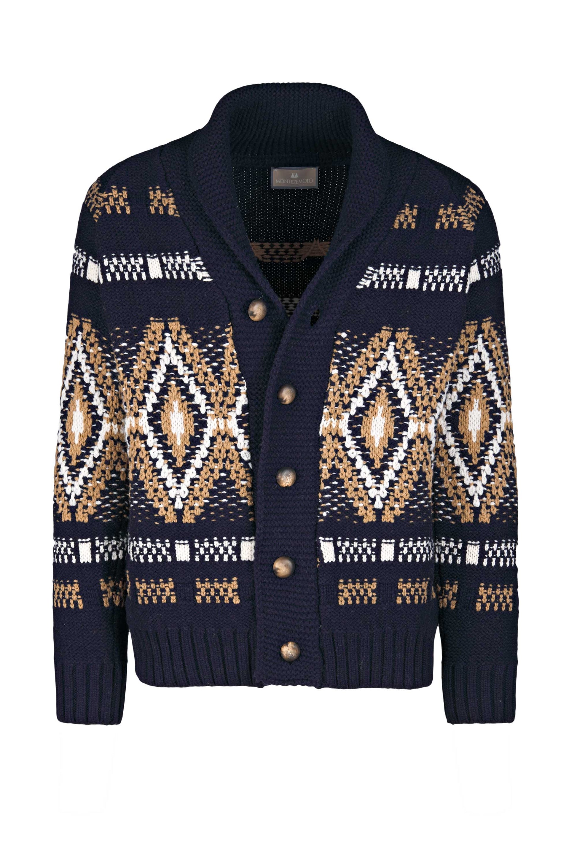 Cozy shawl collar. Five horn-effect buttons. All-over geometric jacquard pattern. Ribbed cuffs and hem. Regular fit. Two colorways: sand/ice/grey and navy/camel/white.