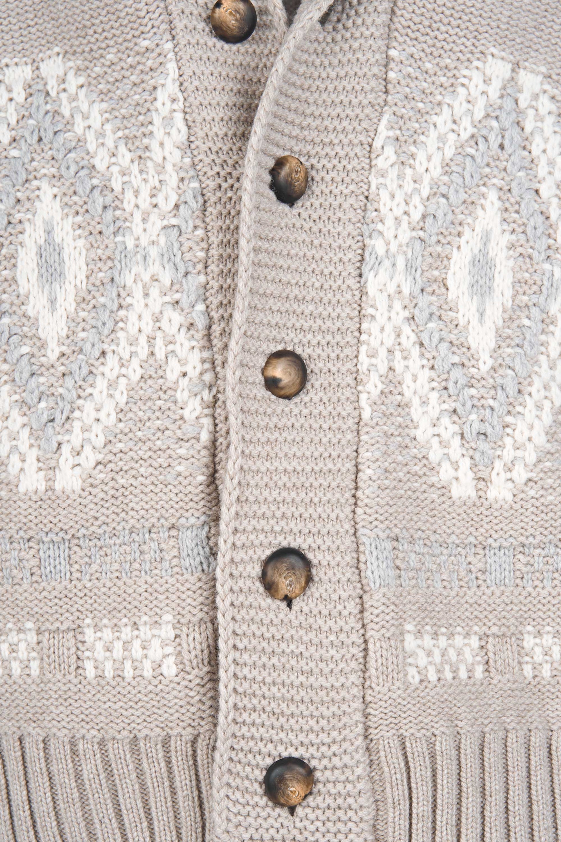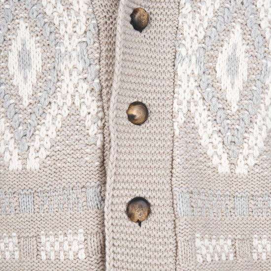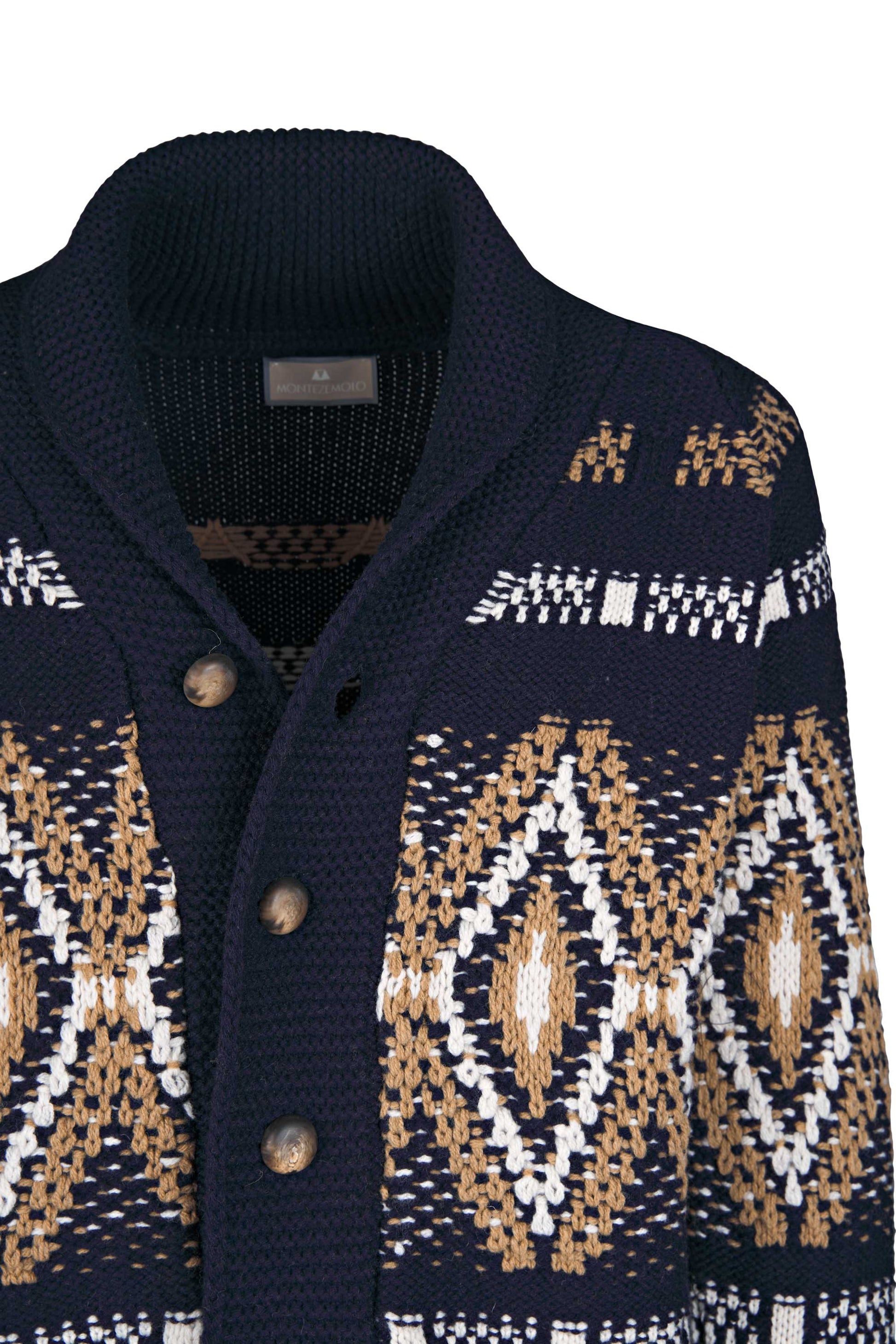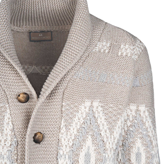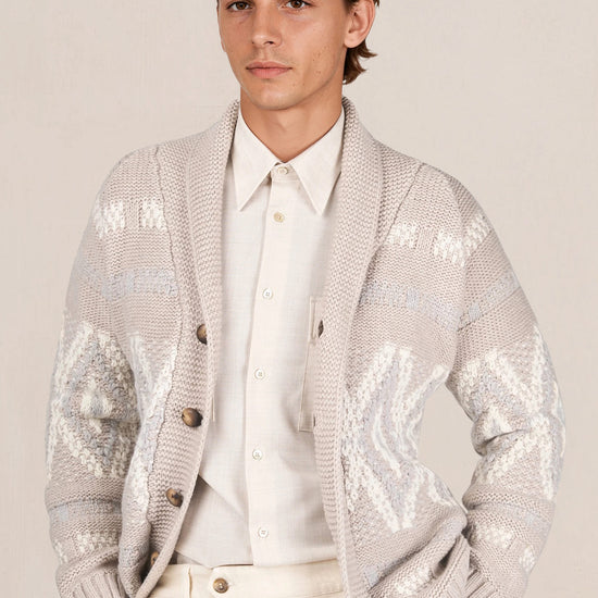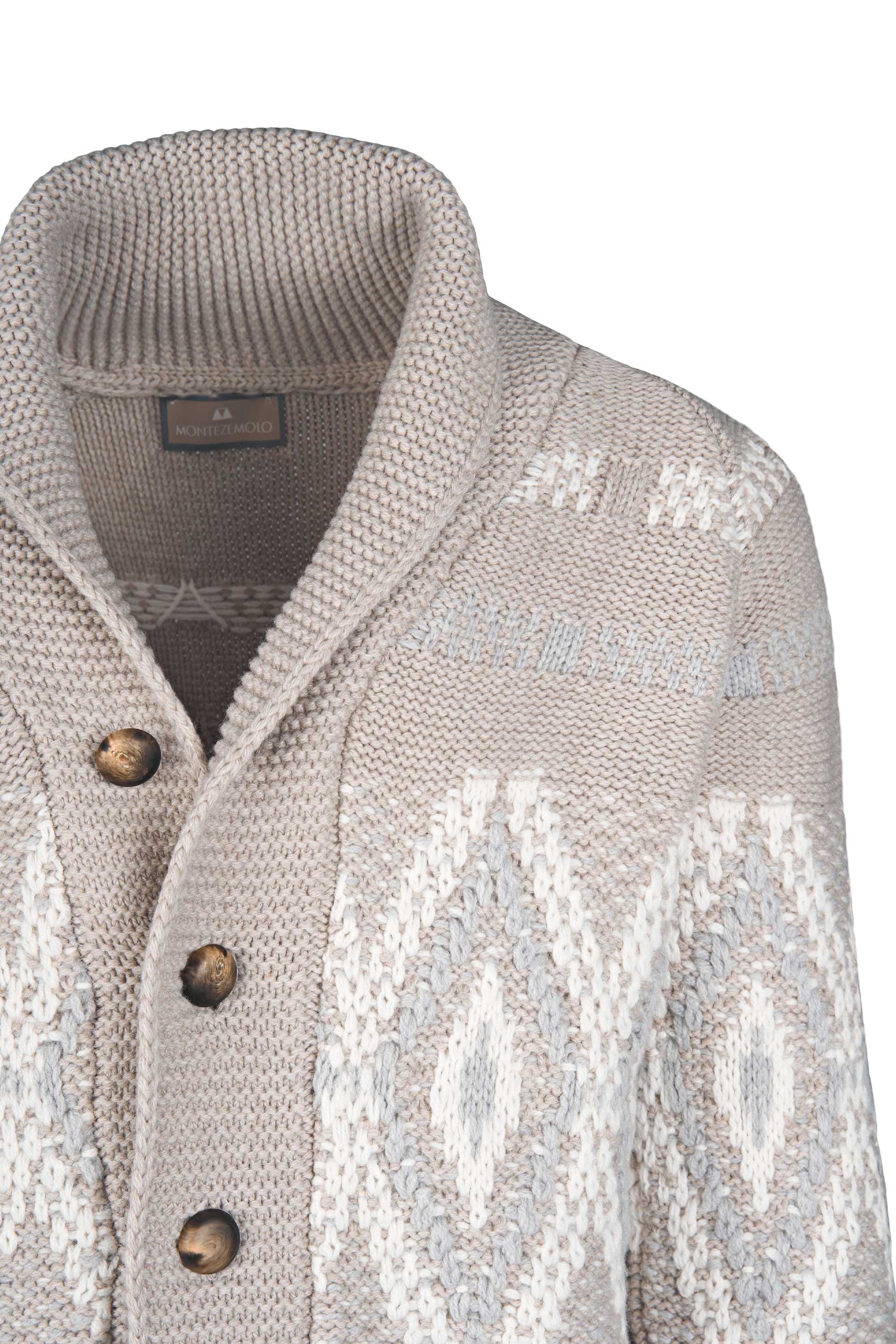 Cozy shawl collar. Five horn-effect buttons. All-over geometric jacquard pattern. Ribbed cuffs and hem. Regular fit. Two colorways: sand/ice/grey and navy/camel/white.