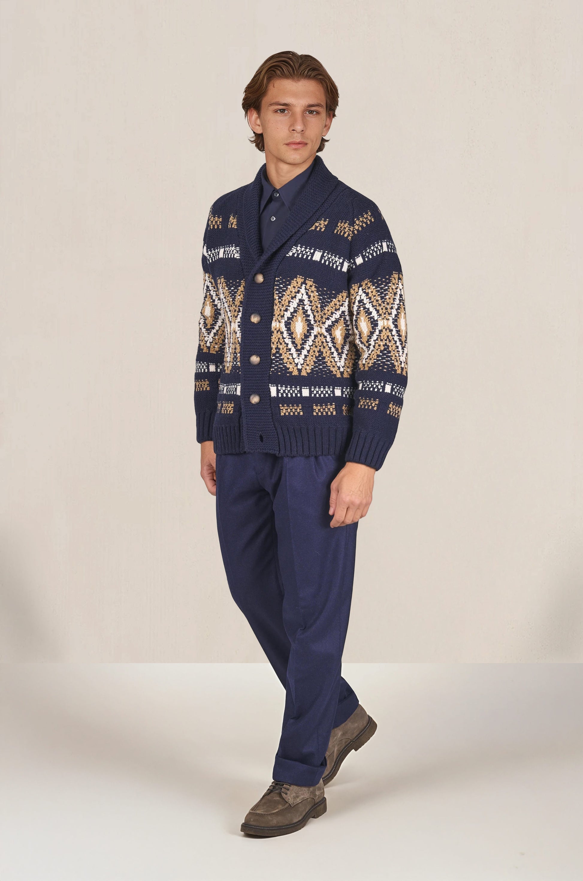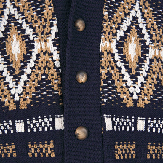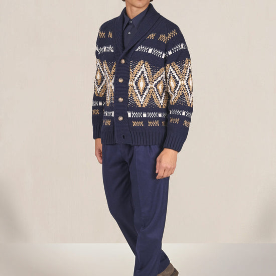 Heritage-inspired jacquard knit cardigan featuring a cozy shawl collar and a five-button front with horn-effect buttons. The geometric diamond pattern runs across the body and sleeves, while ribbed cuffs and hem ensure shape retention. Soft, substantial hand makes it perfect for colder days, with a comfortable regular fit to layer over shirts or tees. Available in two colorways: sand mélange with ice and light-grey accents, or navy with camel and white contrasts.