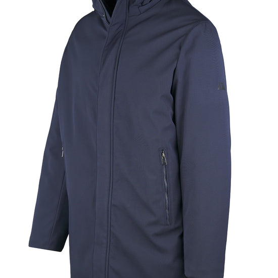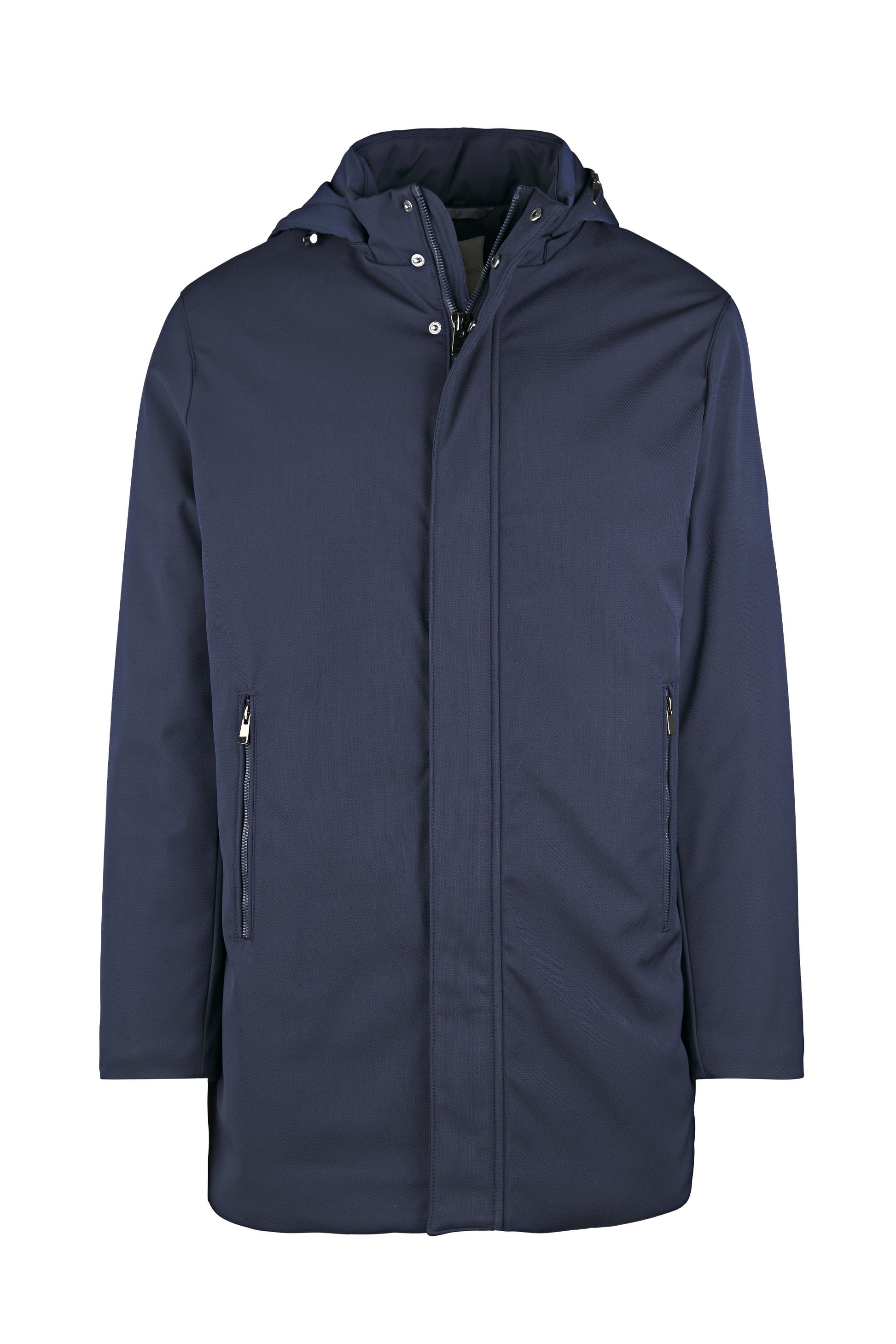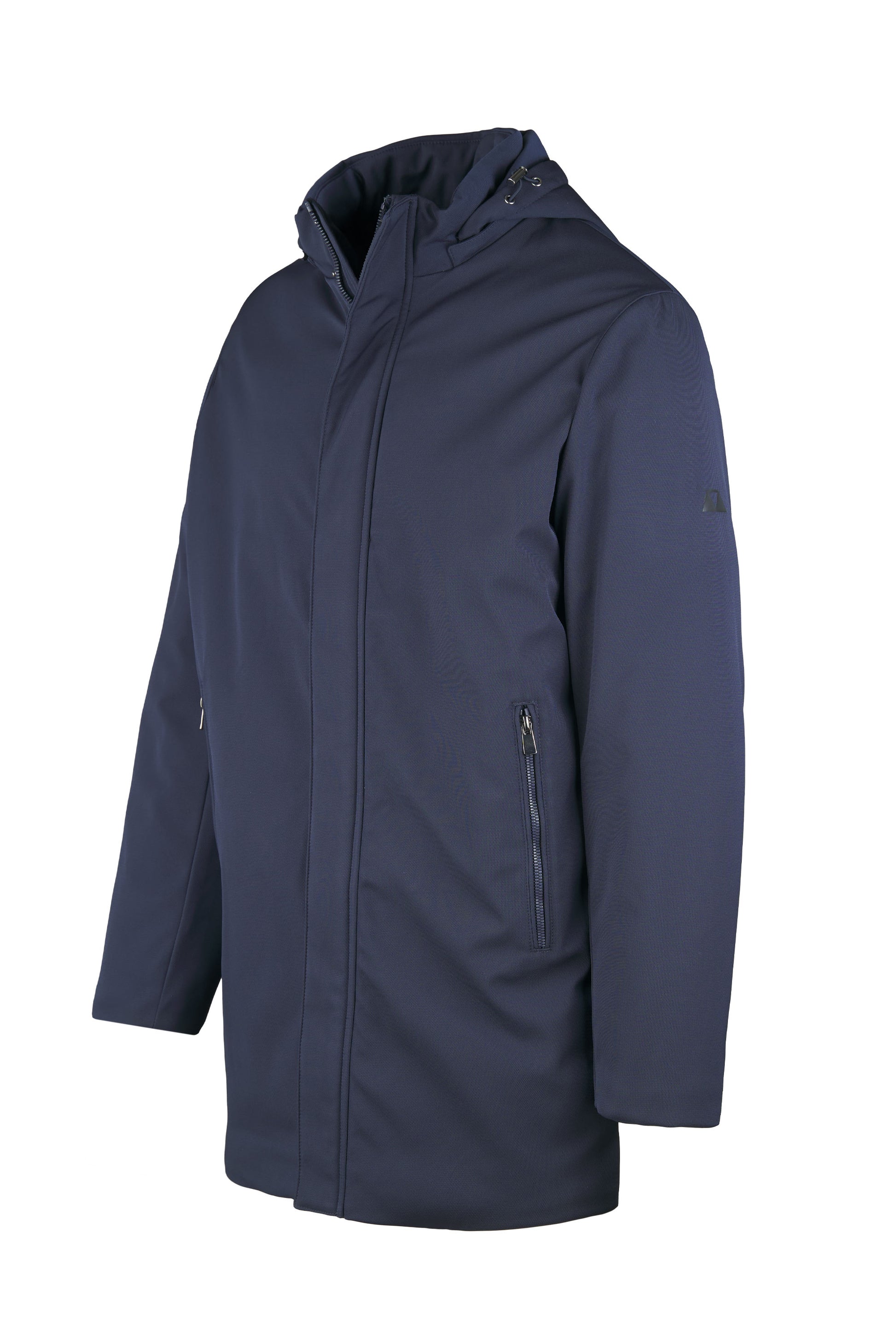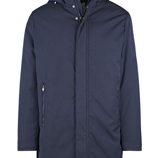 Regular fit and mid-thigh length; detachable hood with hidden snaps and drawcord adjustment; front zip closure with protective wind flap; vertical zip hand pockets; lightweight thermal padding for warmth without bulk; smooth inner lining for easy layering; clean detailing and refined finish.
