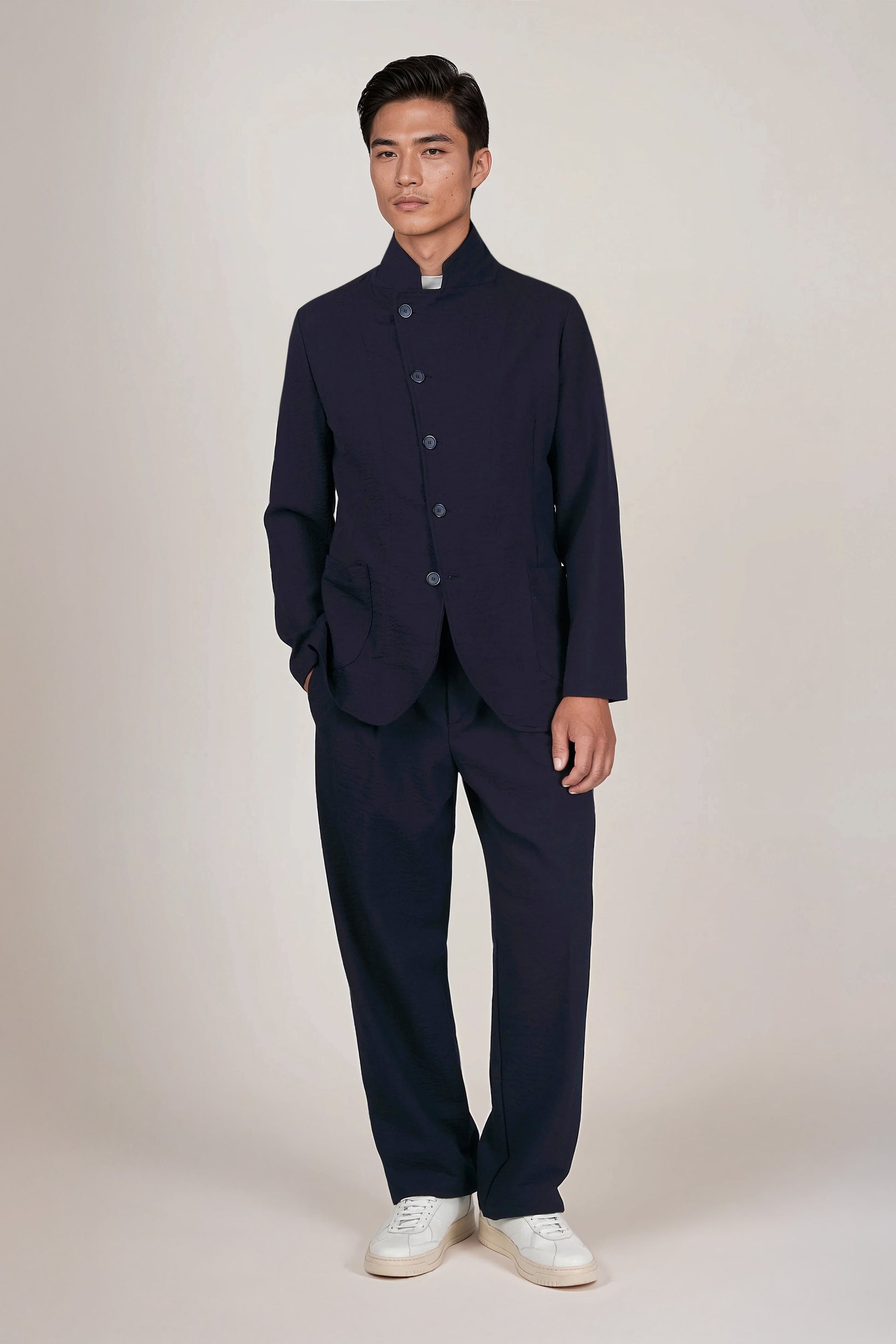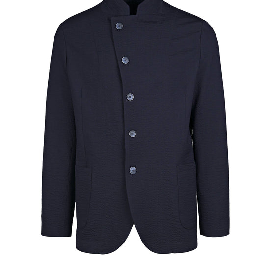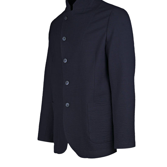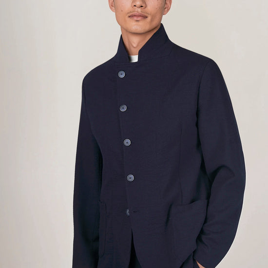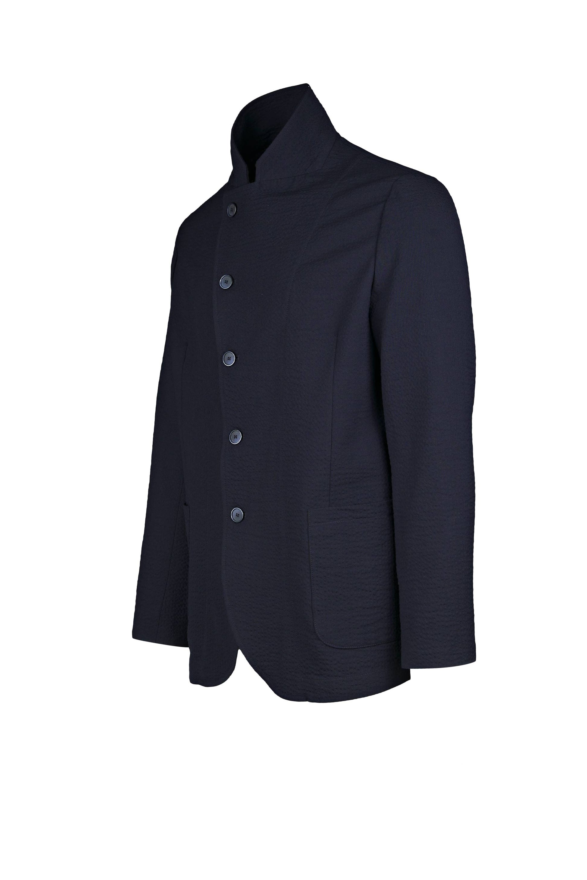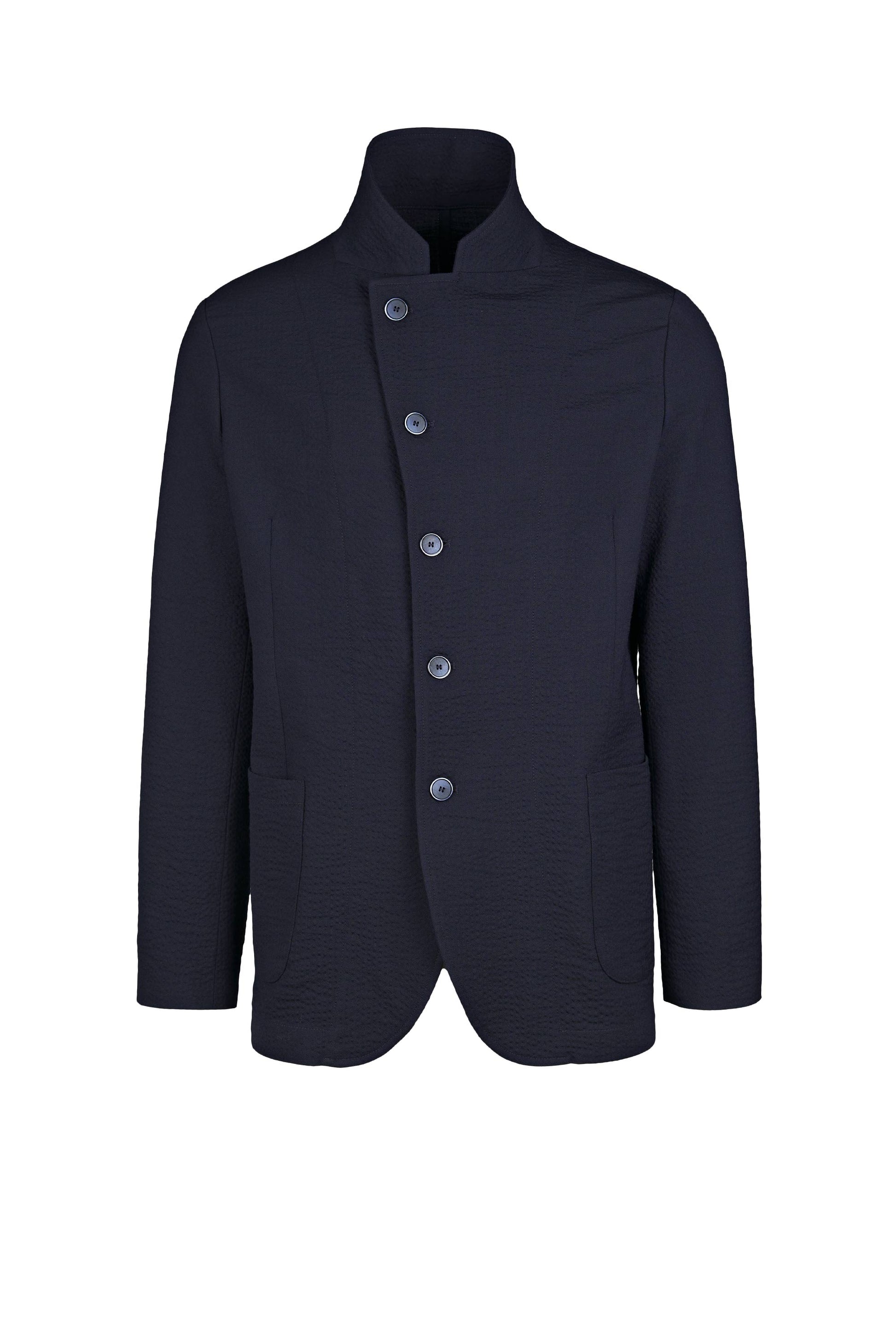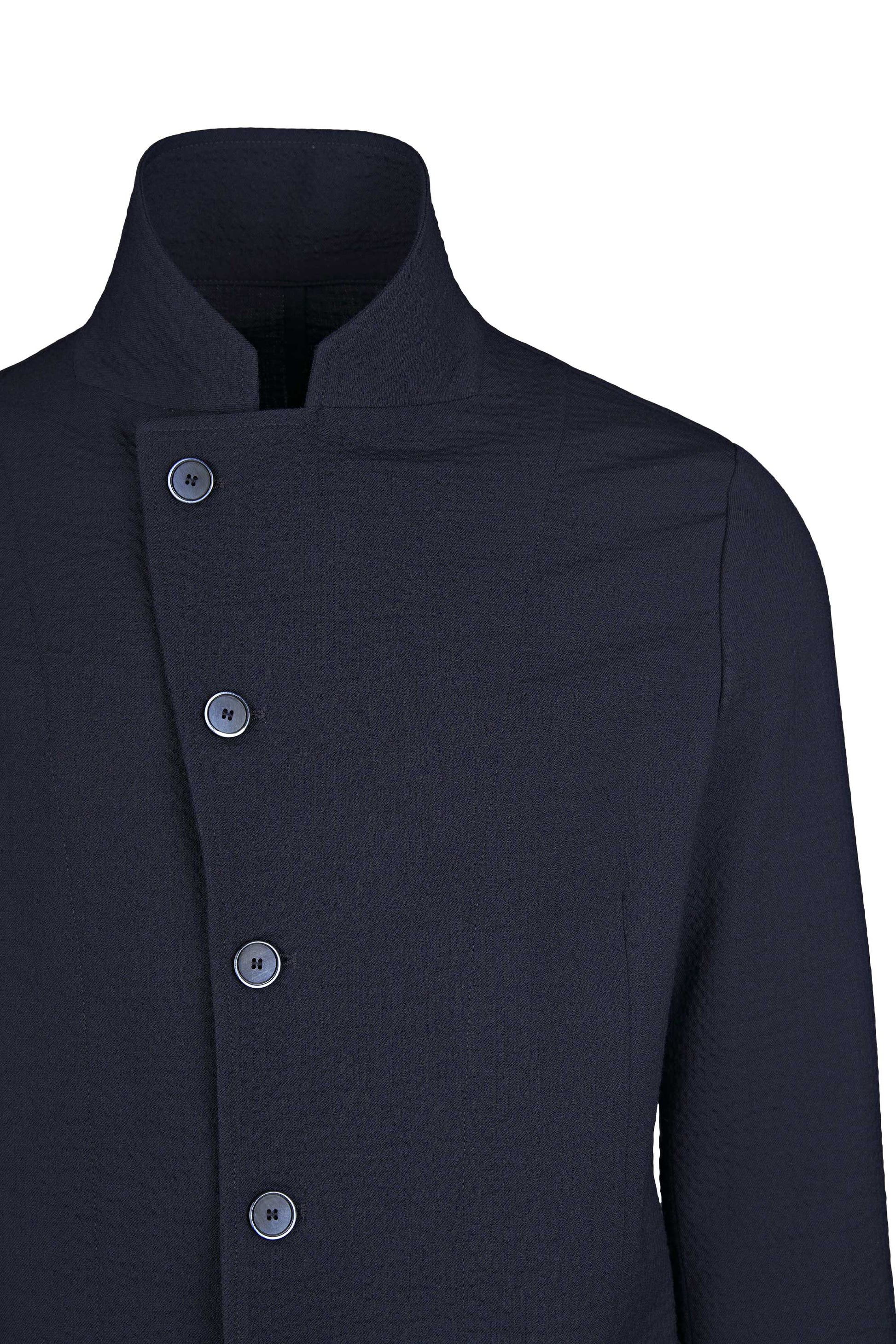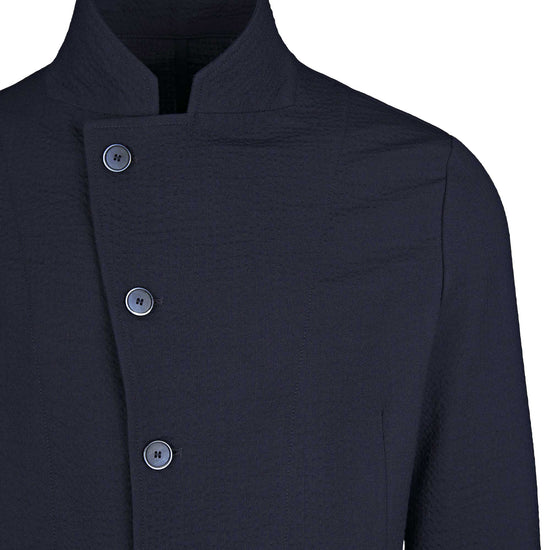 Signature stand “star” collar that elongates the neckline; offset five-button closure for a sleek wrap effect; textured wool seersucker that’s breathable, resilient and less prone to wrinkles; comfortable give thanks to stretch; soft construction with natural shoulder, rounded fronts and rounded patch hip pockets; tonal hardware and clean finishing for a cohesive, contemporary look.