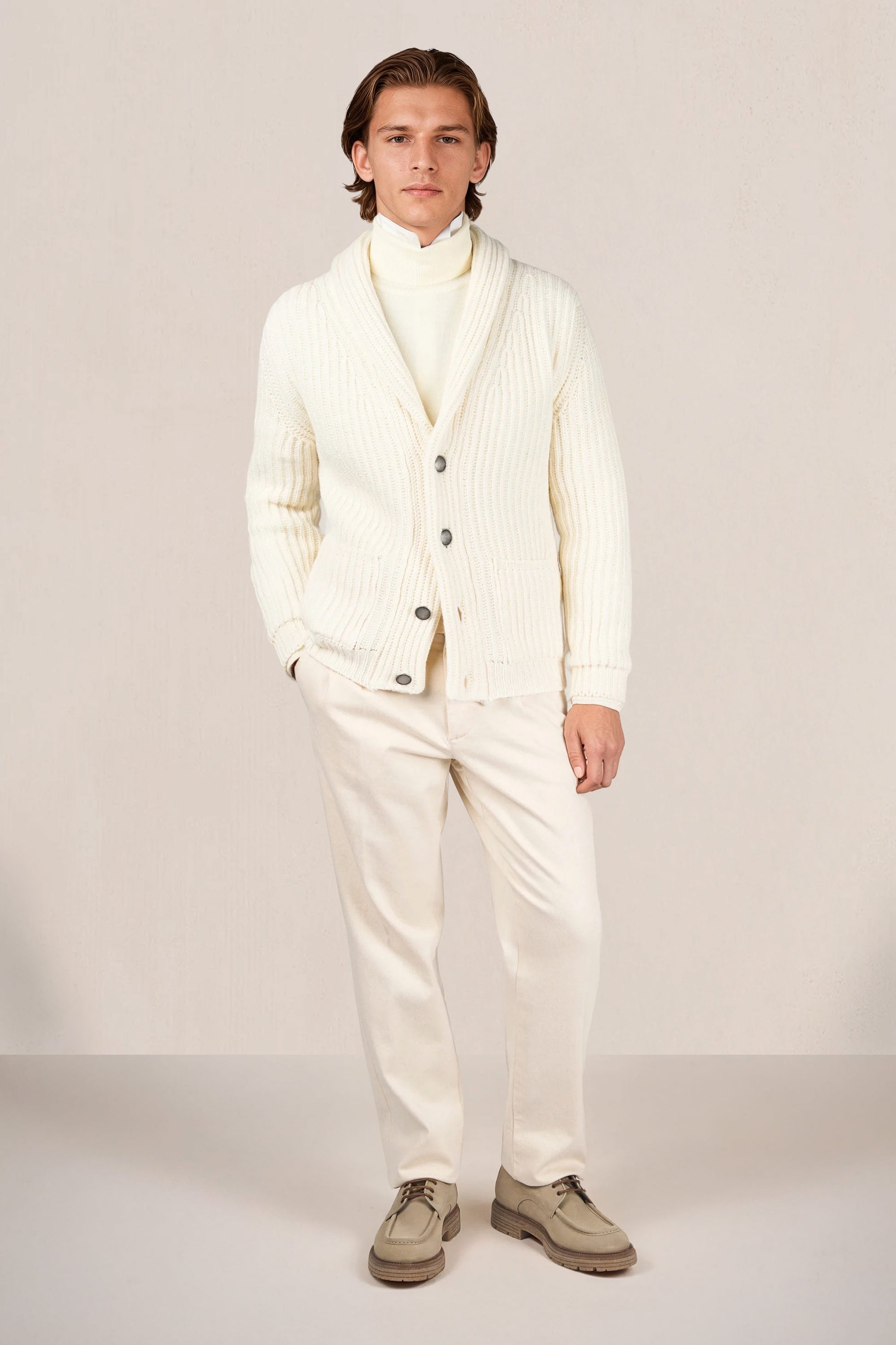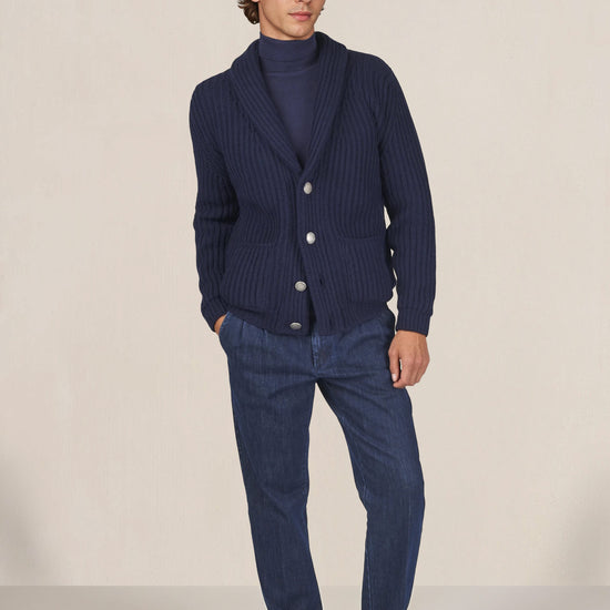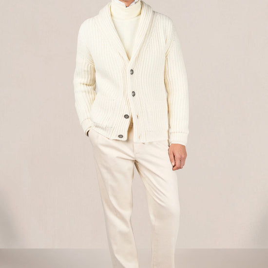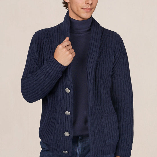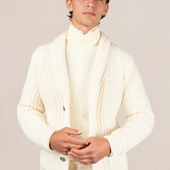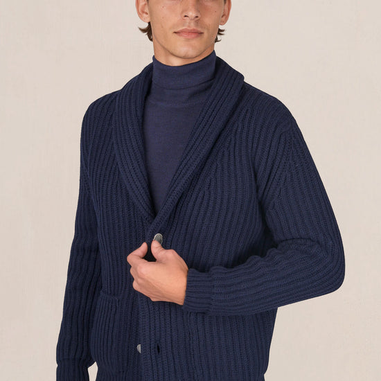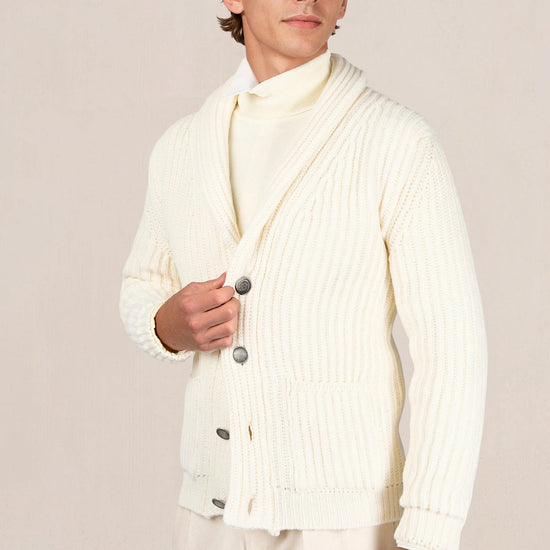 Compact English-rib knit; enveloping shawl collar; regular fit; 4-button closure with reinforced placket; front patch pockets; tighter-rib cuffs and hem; fully-fashioned construction with clean finishing.