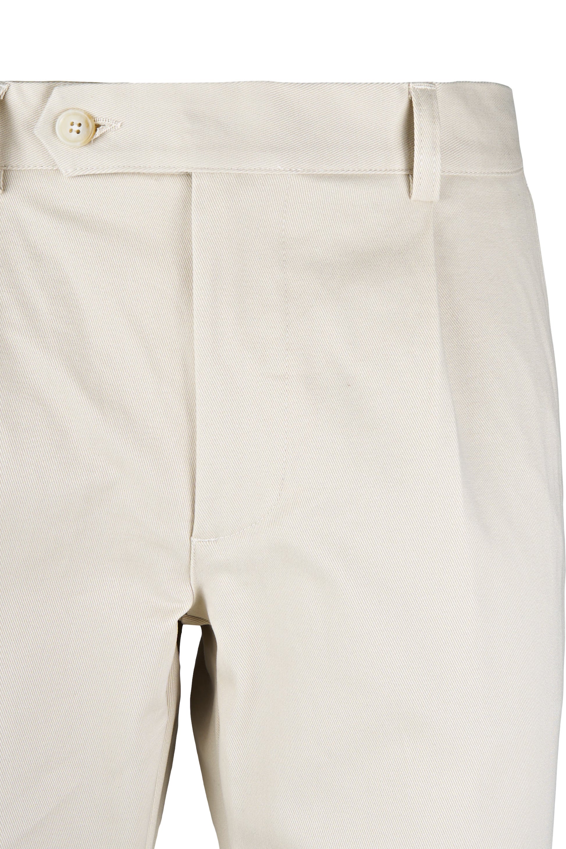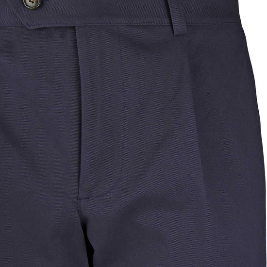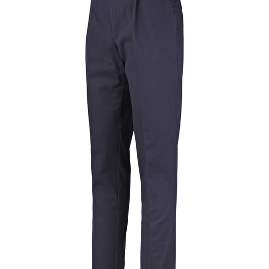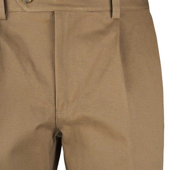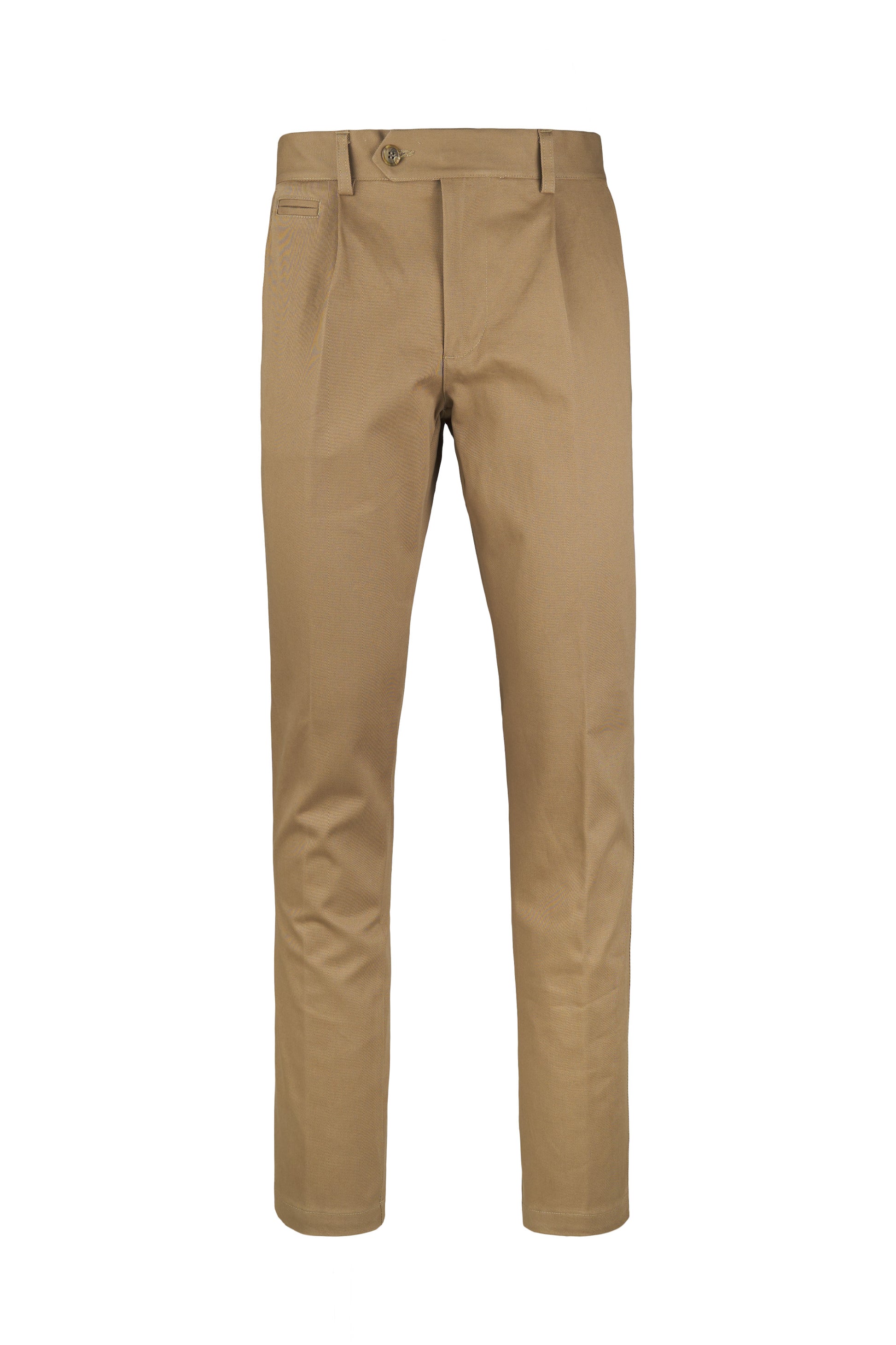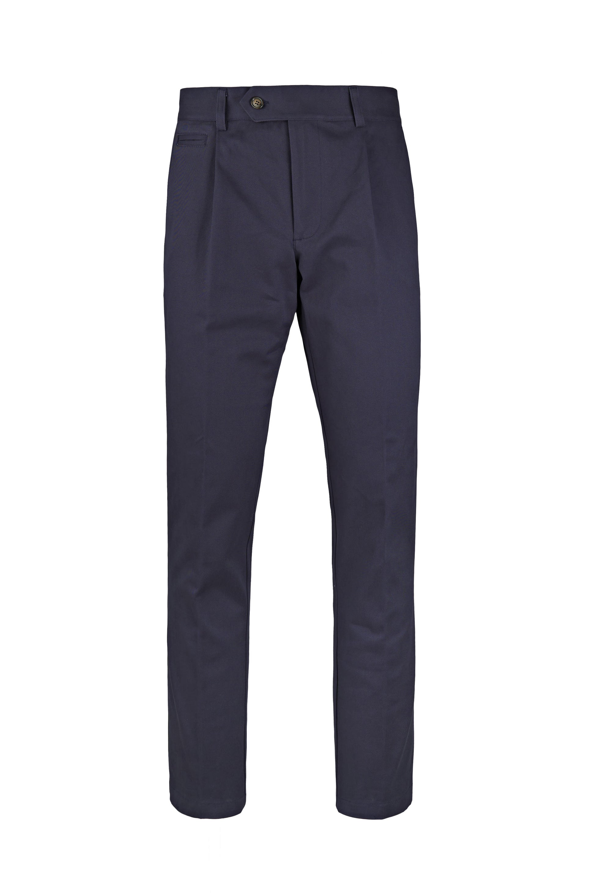 Comfortable compact twill; regular waist with single pleats; zip fly with button; belt loops and slanted side pockets plus coin pocket; regular-tapered leg with clean hem; tone-on-tone stitching and neat inner finishing.
