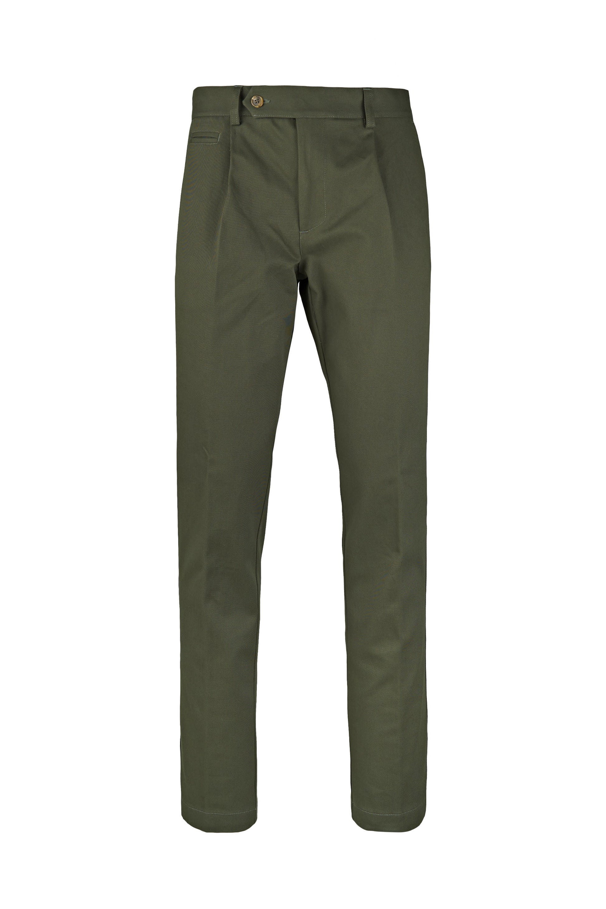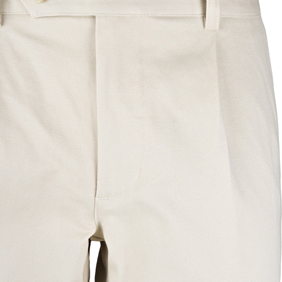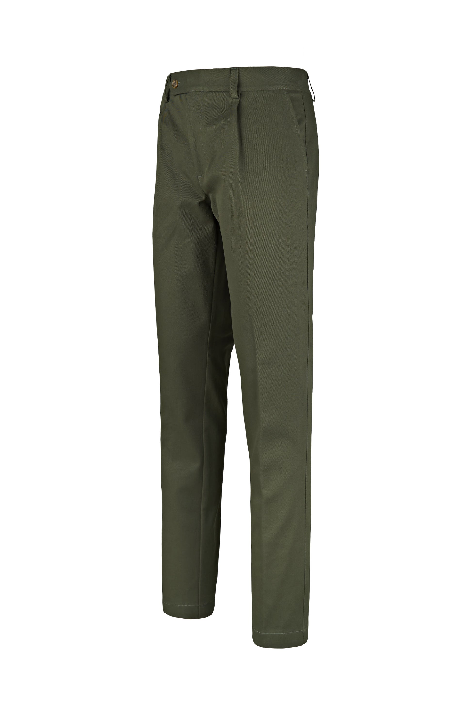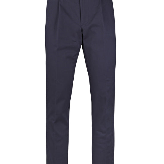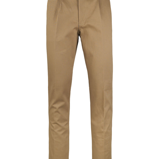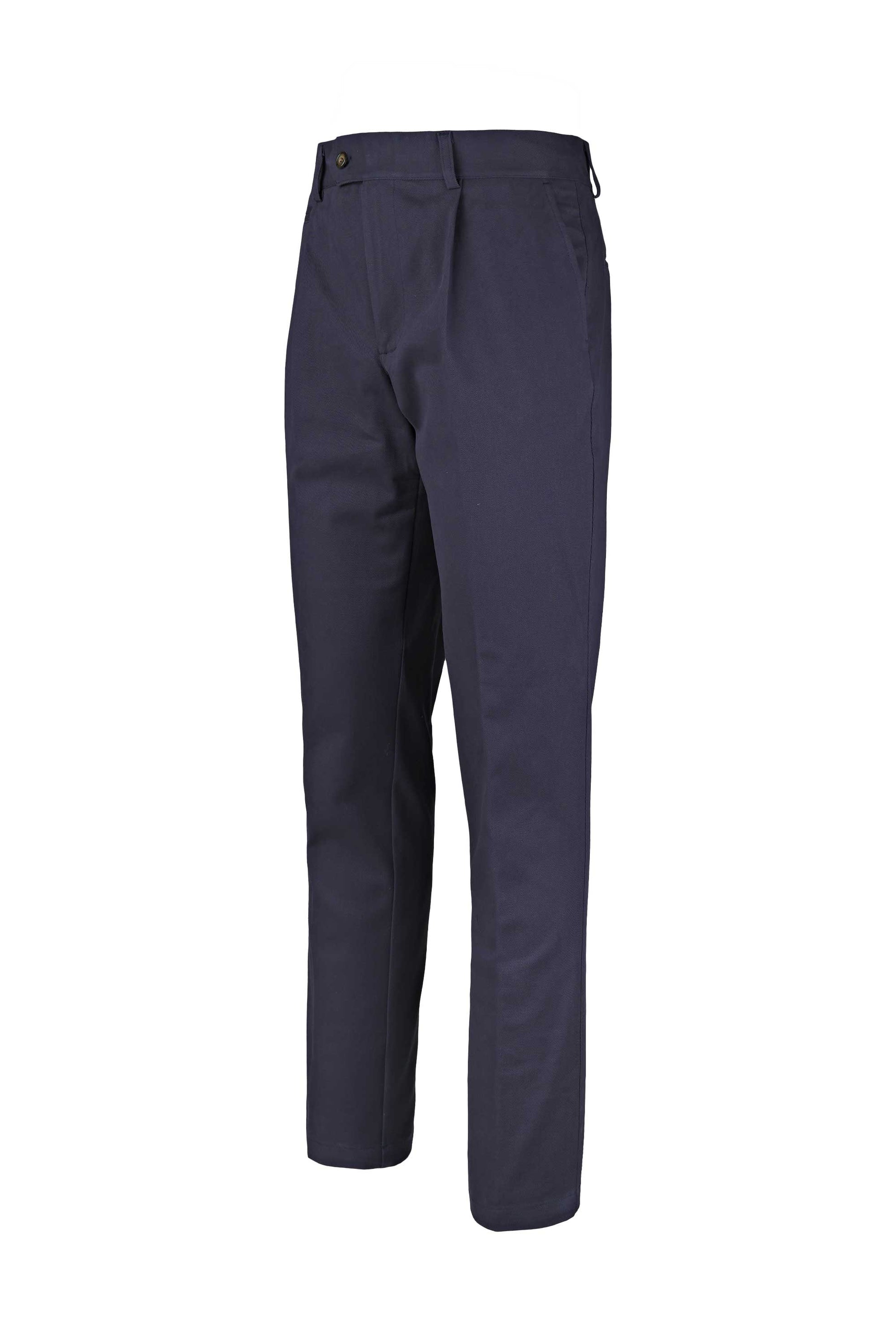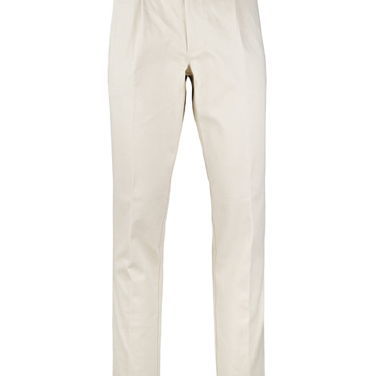 Comfortable compact twill; regular waist with single pleats; zip fly with button; belt loops and slanted side pockets plus coin pocket; regular-tapered leg with clean hem; tone-on-tone stitching and neat inner finishing.