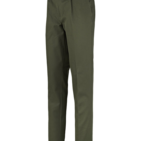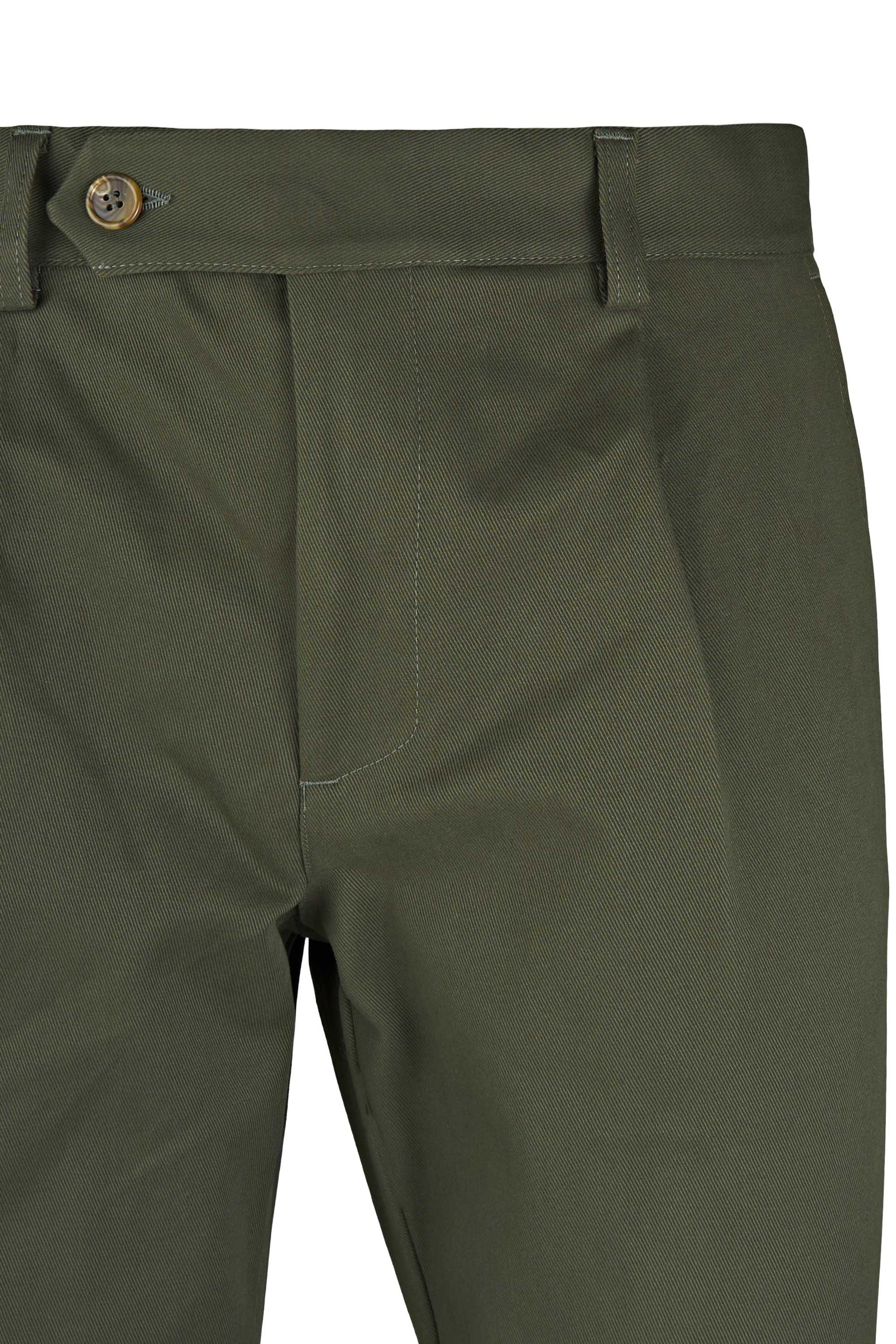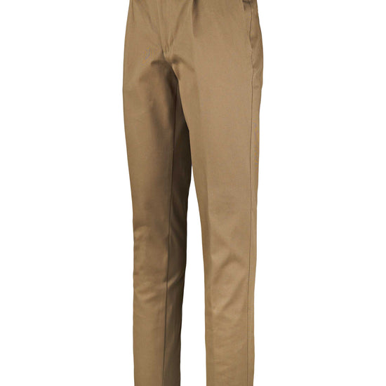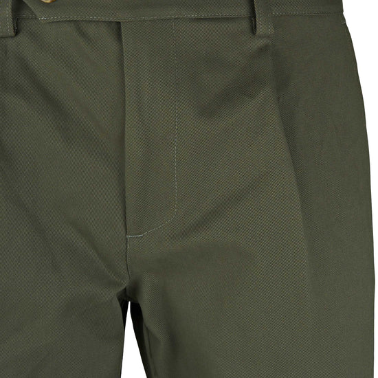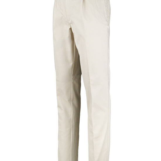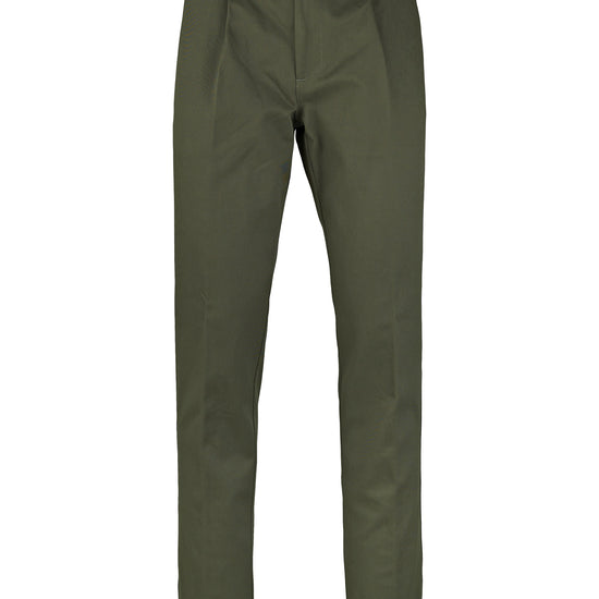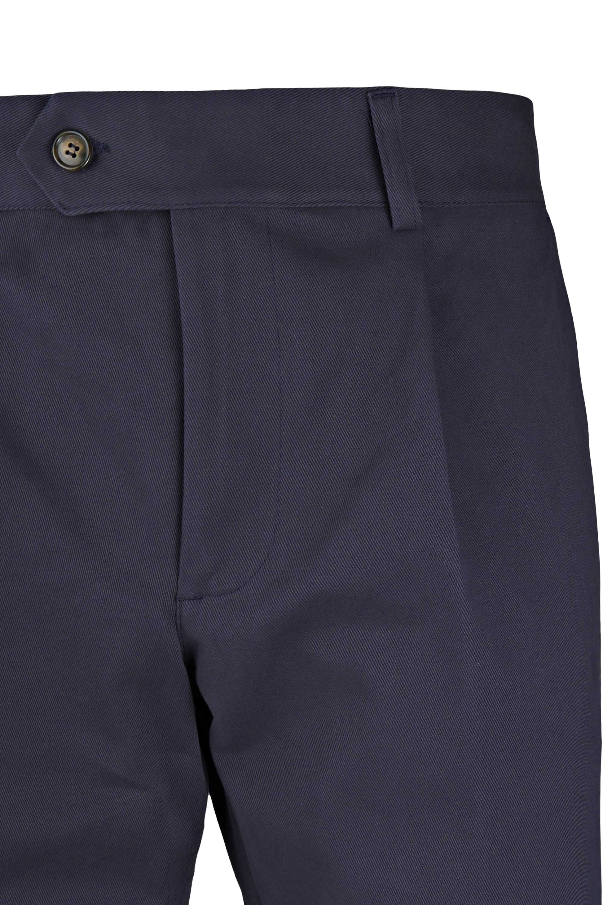 Comfortable compact twill; regular waist with single pleats; zip fly with button; belt loops and slanted side pockets plus coin pocket; regular-tapered leg with clean hem; tone-on-tone stitching and neat inner finishing.
