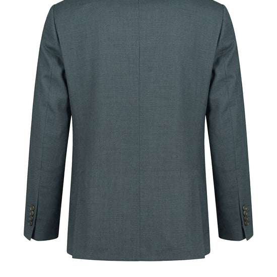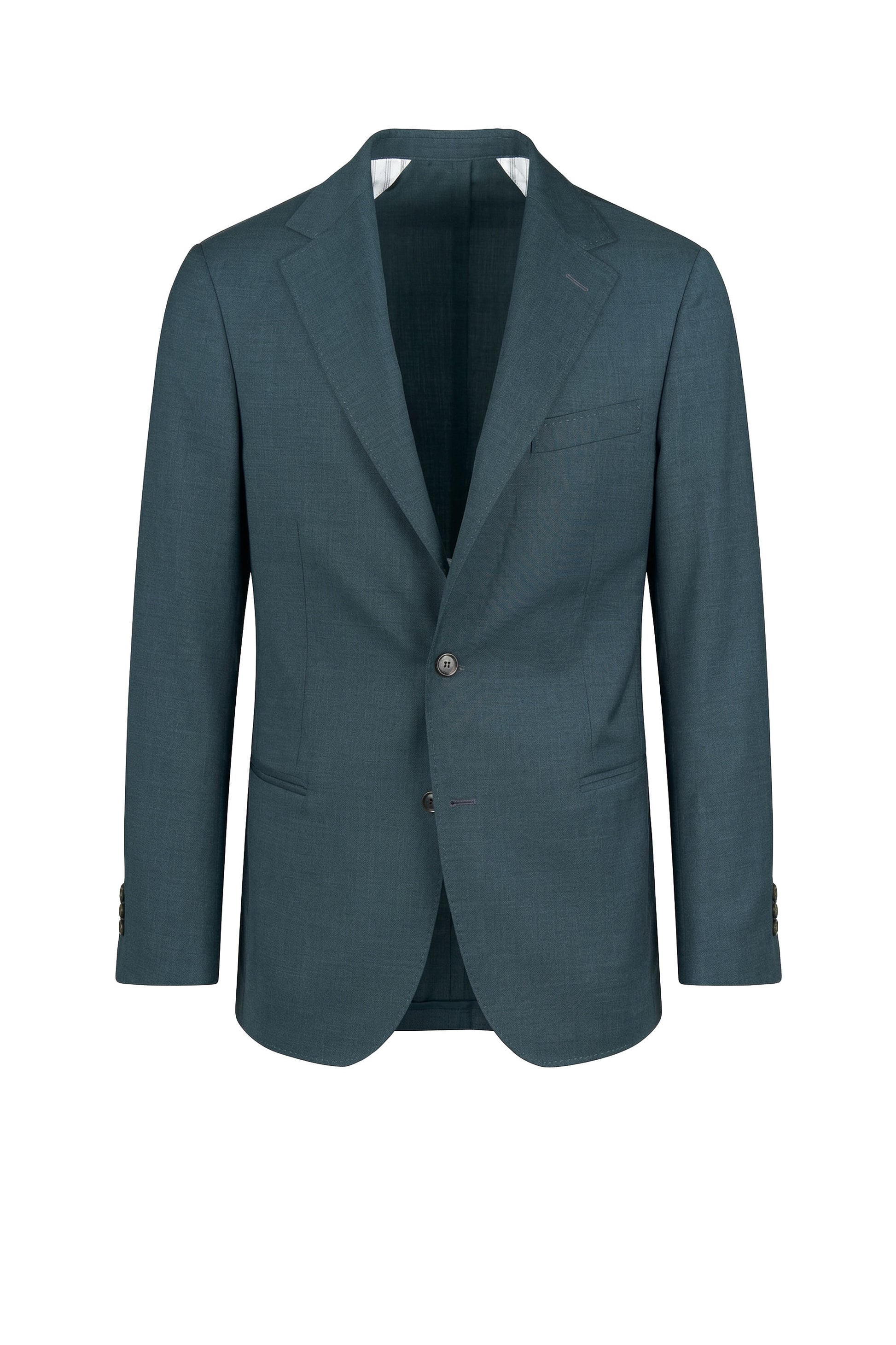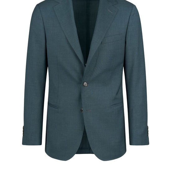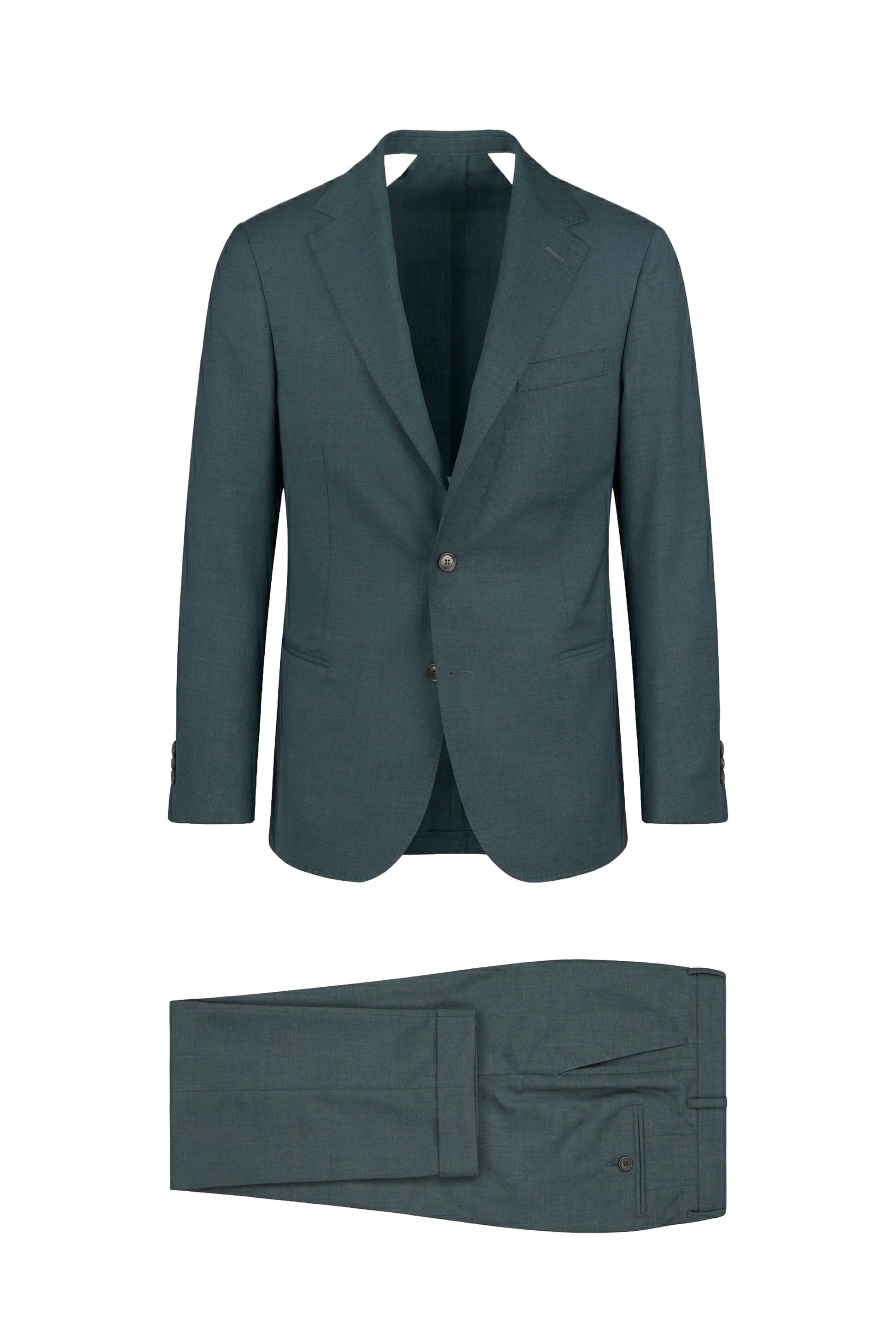 Super 150’s merino wool; refined compact weave with subtle micro texture; single-breasted two-button jacket; unlined chest construction; partial AMF stitching; chest welt pocket; welt pockets; trousers with double front pleats; slanted side pockets; rear welt pockets with button closure.
