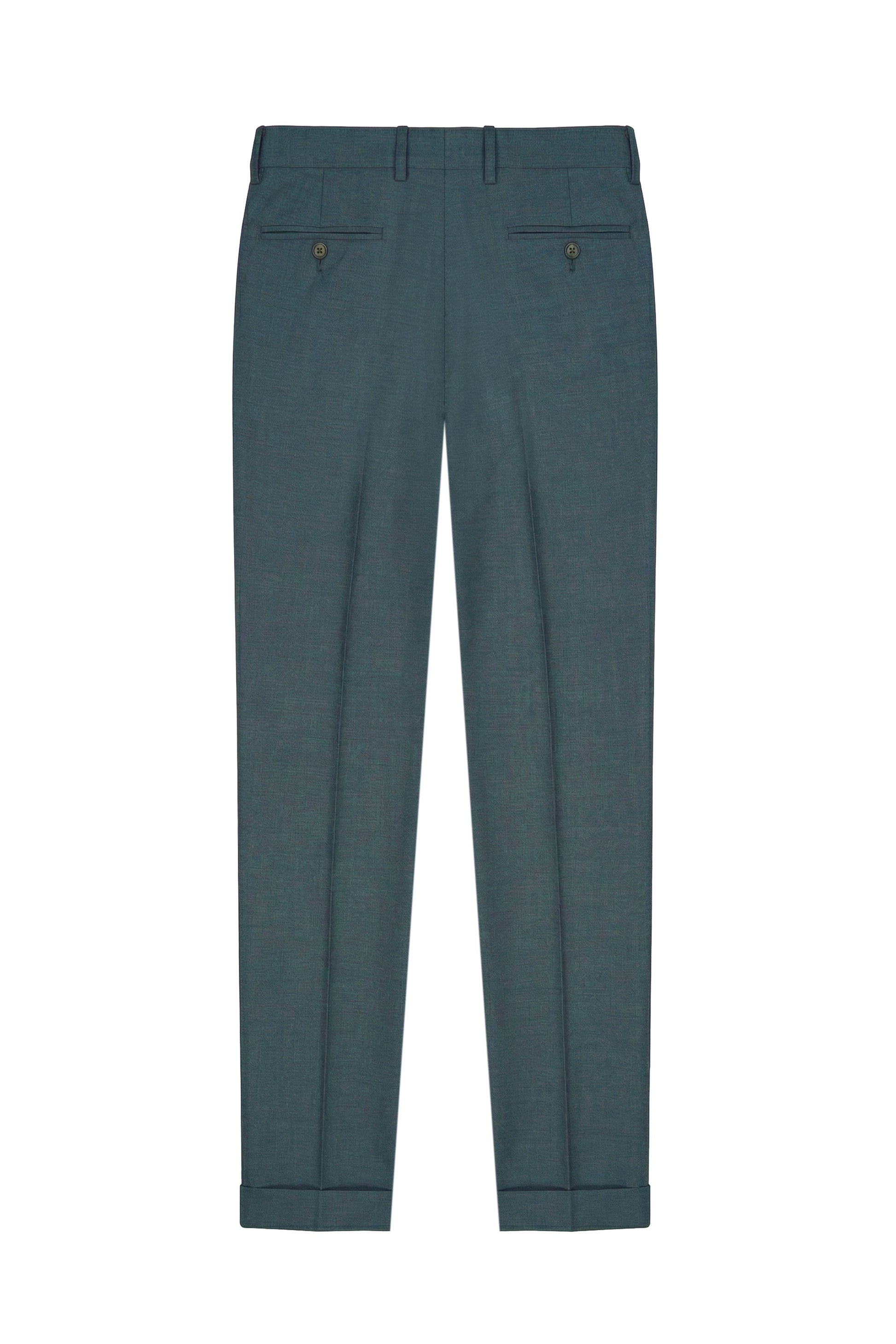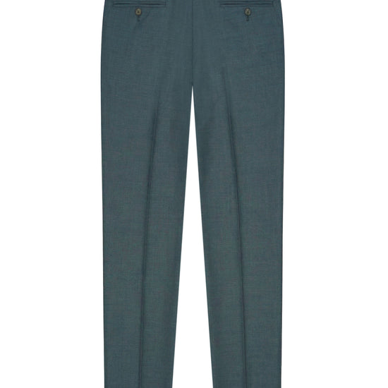 The jacket features a single-breasted construction with a two-button closure and classic lapels that enhance the garment’s tailored silhouette. The unlined chest construction reduces internal weight and allows the fabric to follow the body’s natural movements, improving comfort and wearability. The front includes a classic welt chest pocket and welt pockets at the waist, maintaining a clean and refined aesthetic. The garment is enhanced by partial AMF stitching along the lapels and key structural points, highlighting the quality and craftsmanship of the tailoring. The back of the jacket features a clean design with a central seam that supports the garment’s structure and contributes to a balanced silhouette. The cuffs are finished with matching buttons that complete the elegant design. The trousers are crafted from the same fabric and feature a sartorial construction with double front pleats, offering additional comfort through the waist and hip area while maintaining an elegant leg line. The design includes slanted side pockets and rear welt pockets with button closure. The leg falls cleanly and proportionally, combining classic tailoring elegance with modern comfort.