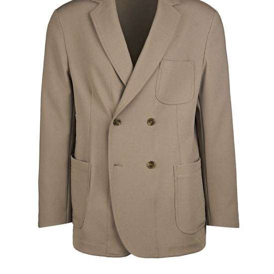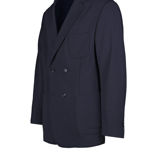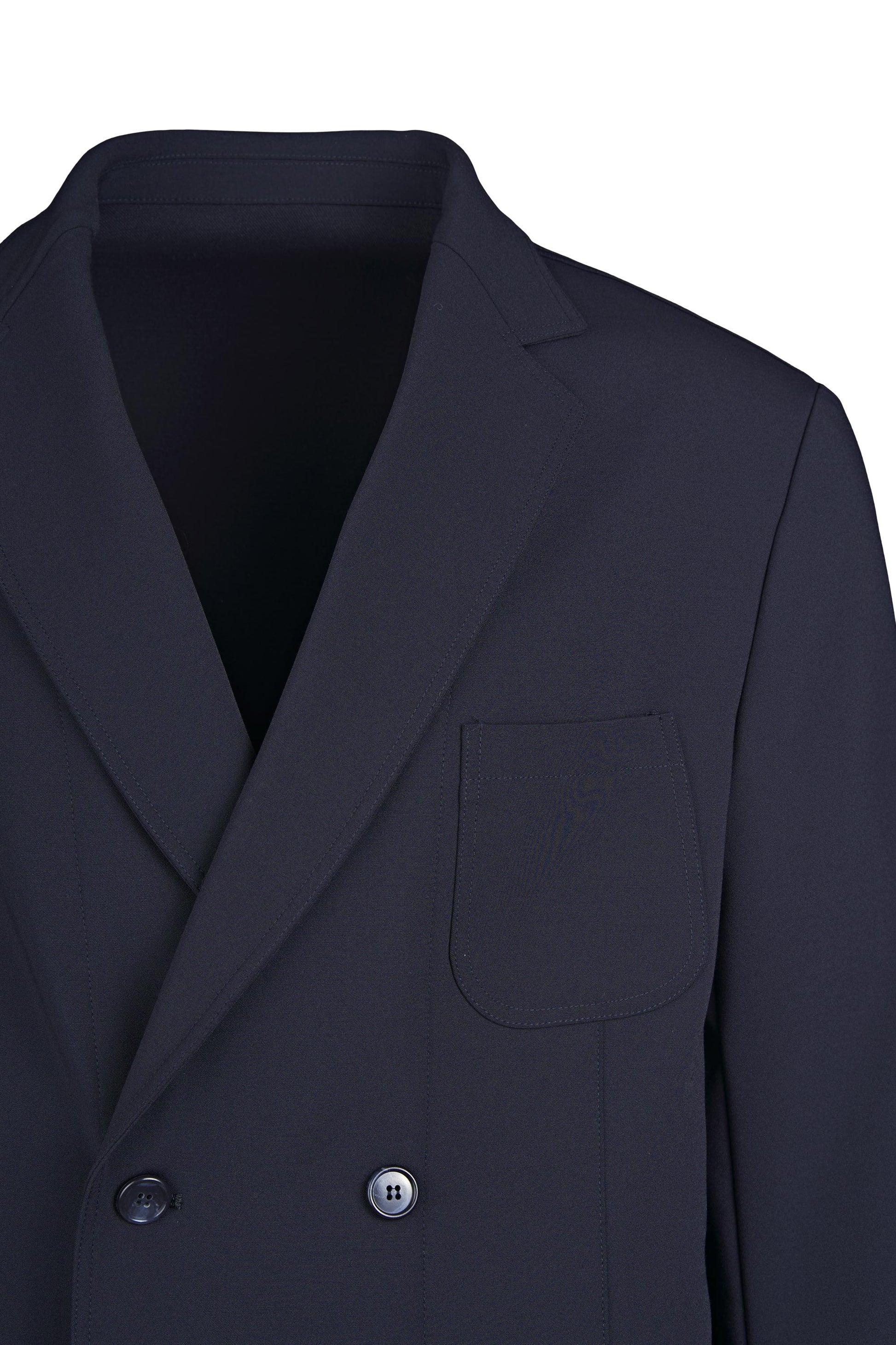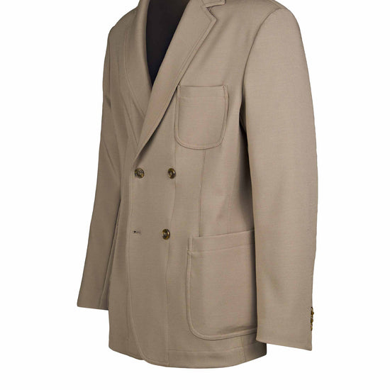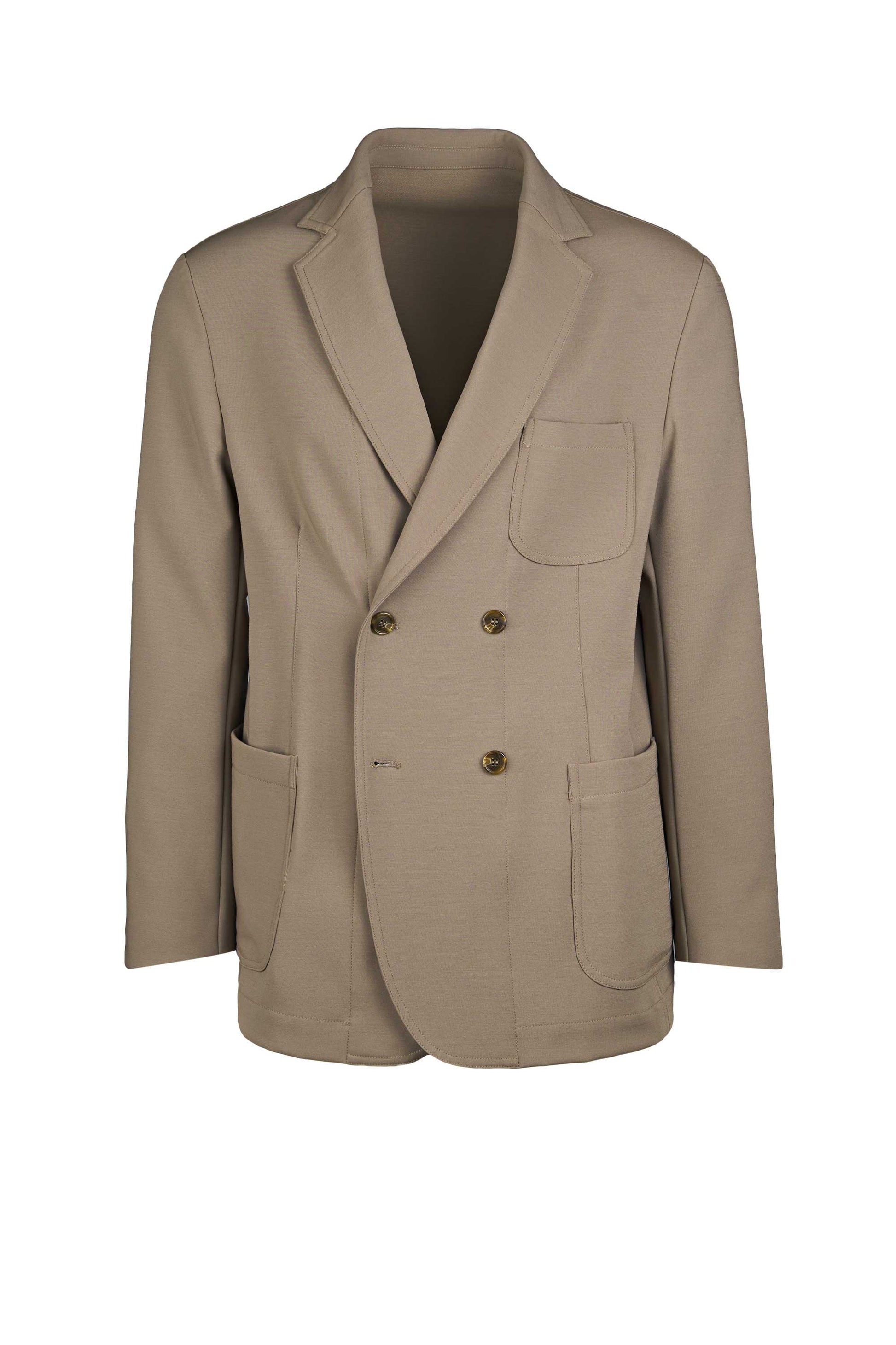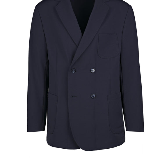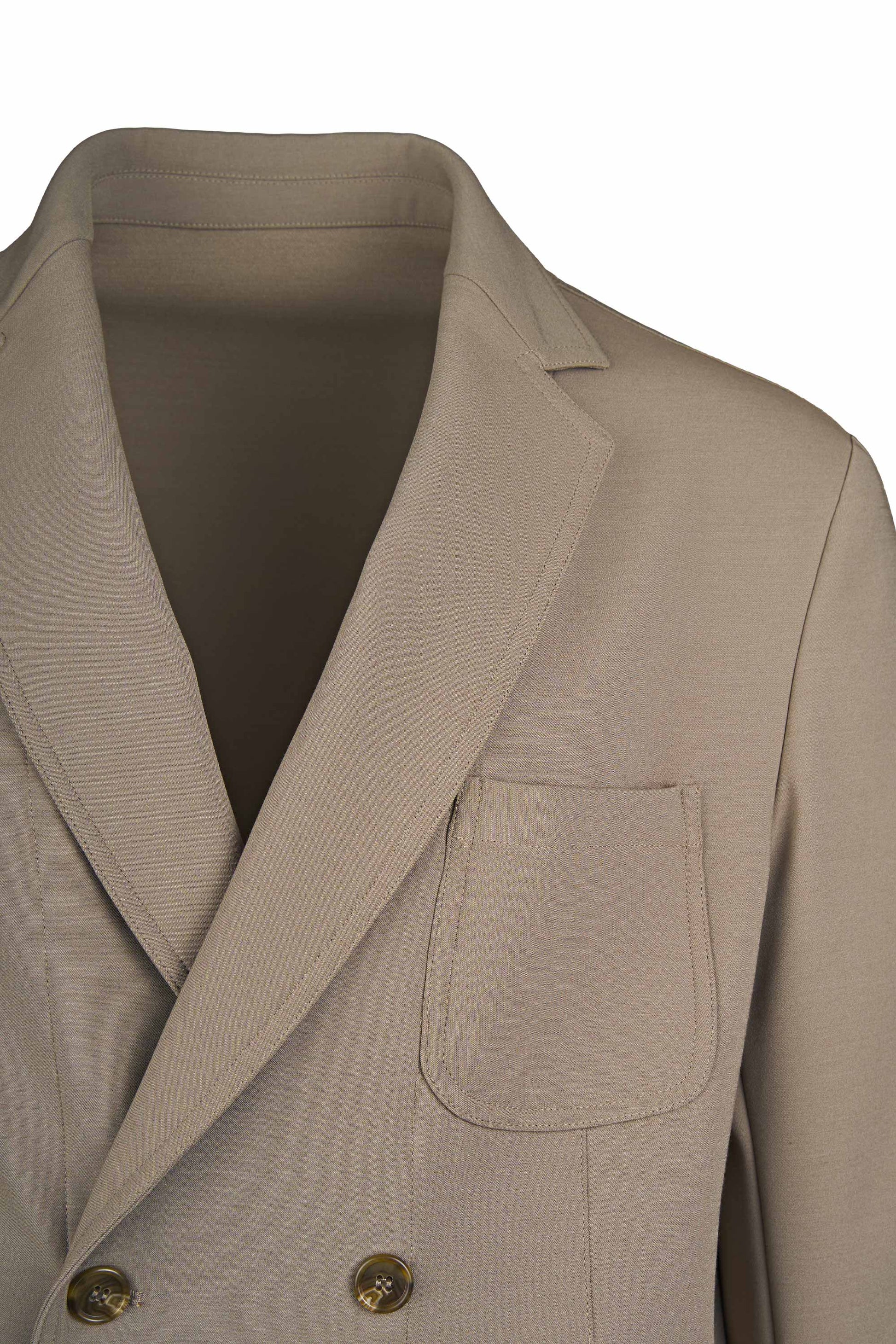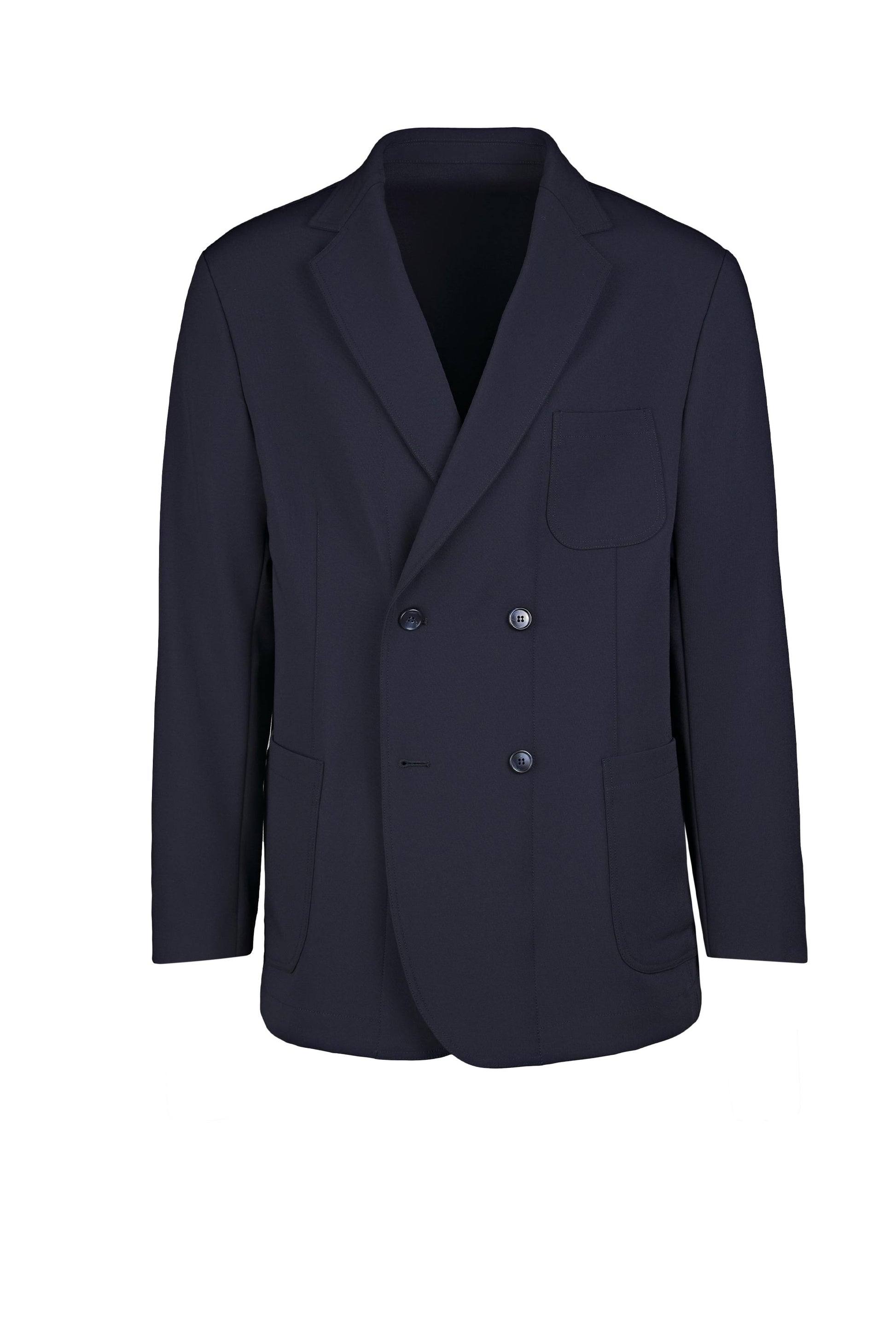 Unlined, softly constructed double-breasted cut; twin topstitching on lapels, front and pockets; clean no-vent back; three patch pockets; horn-effect buttons; technical jersey.