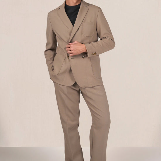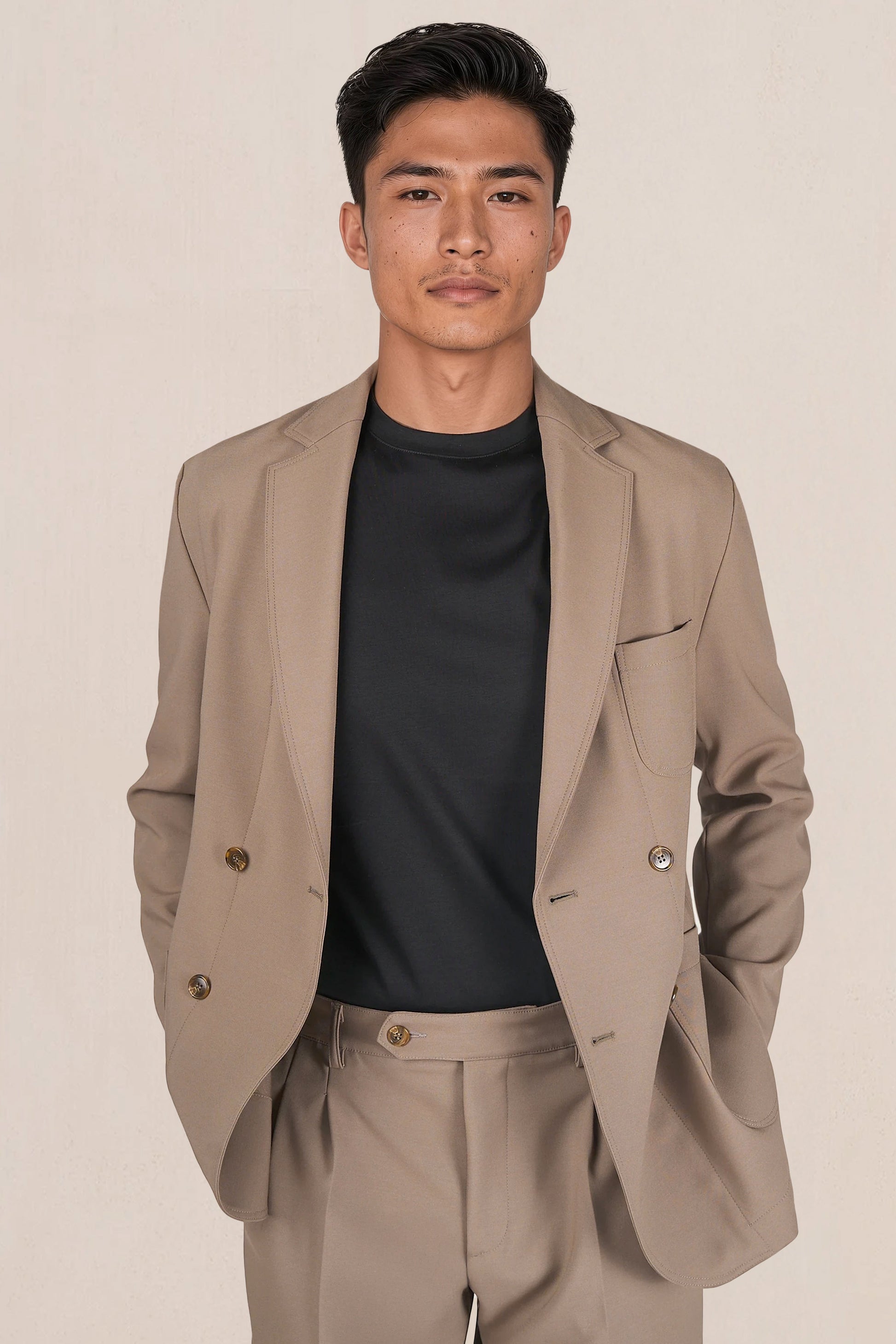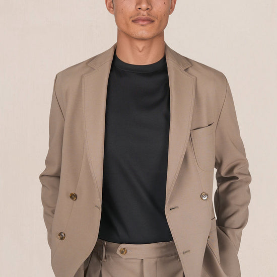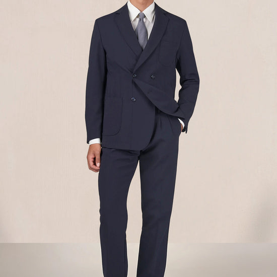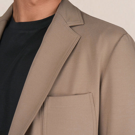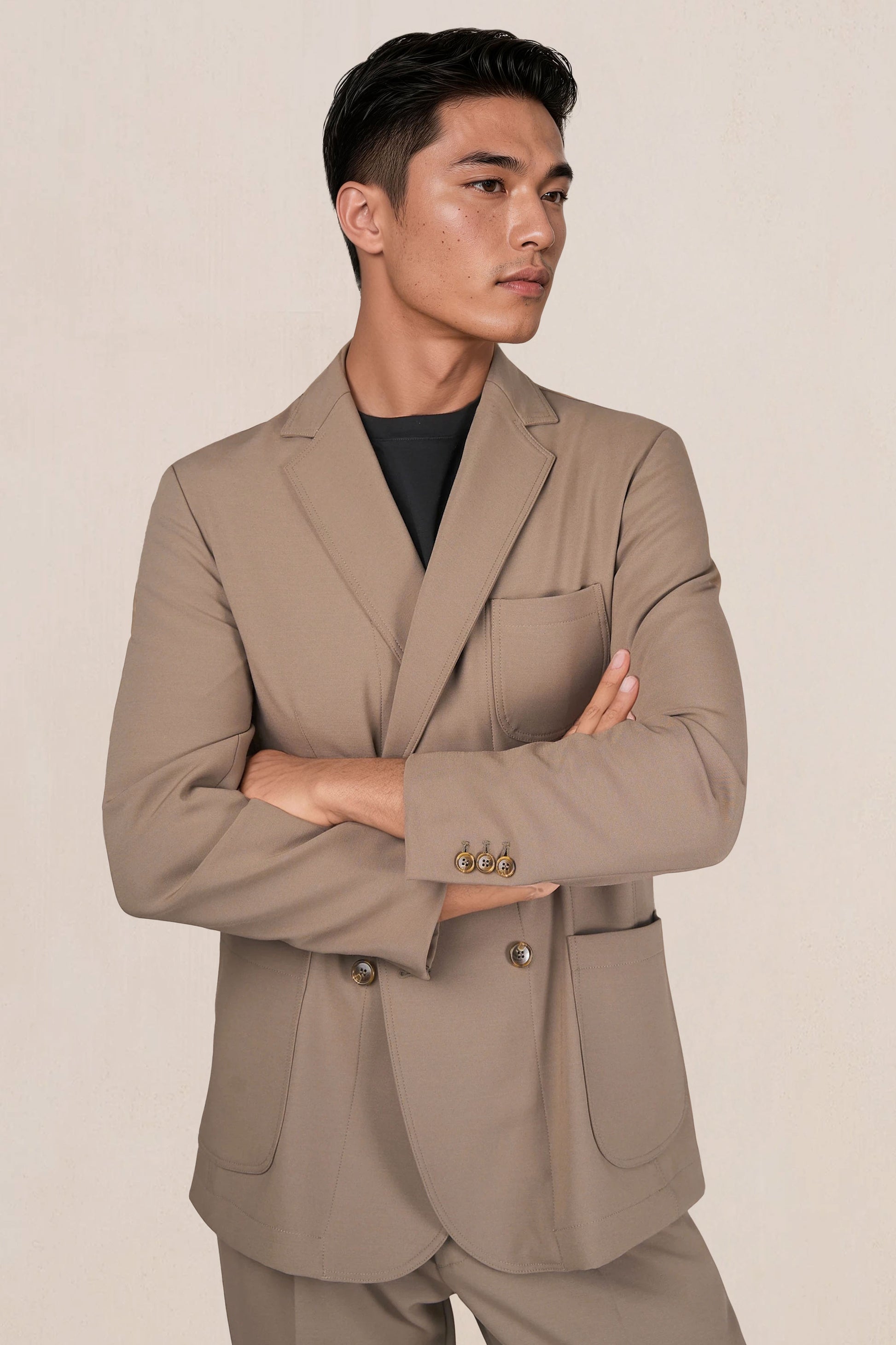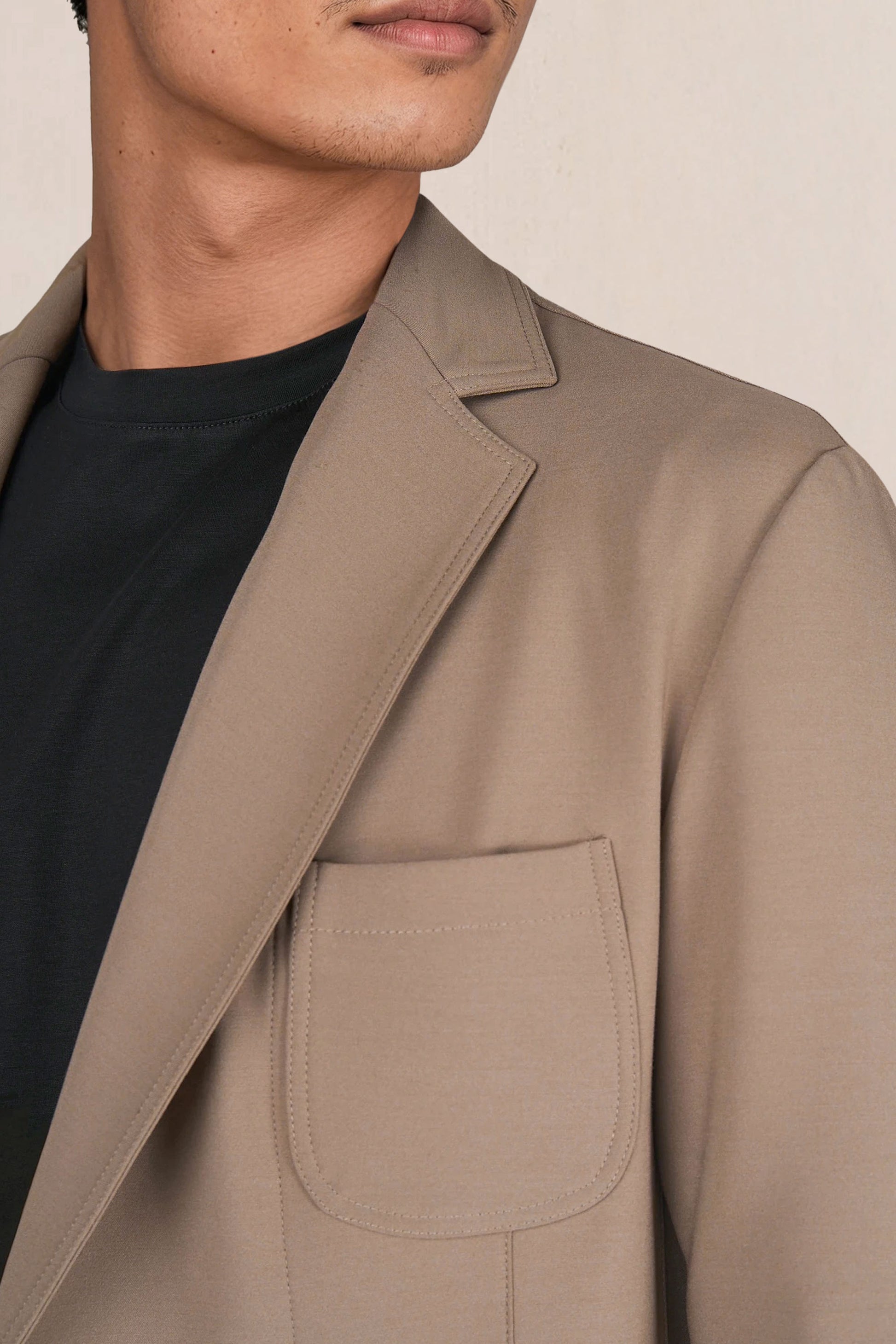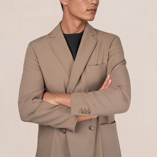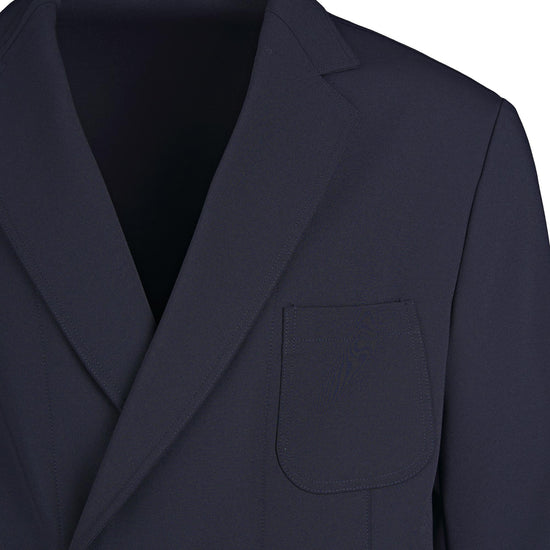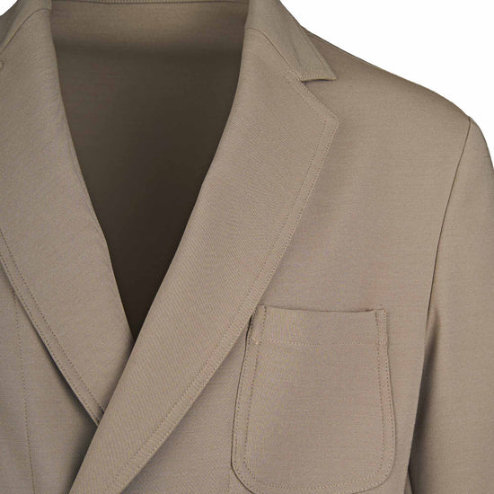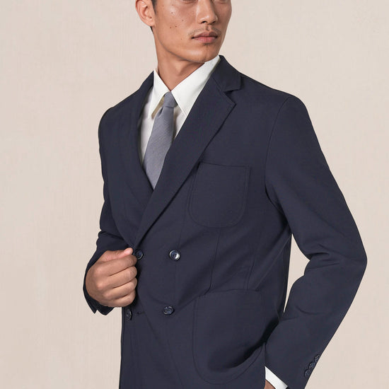 Unlined, softly constructed double-breasted cut; twin topstitching on lapels, front and pockets; clean no-vent back; three patch pockets; horn-effect buttons; technical jersey.