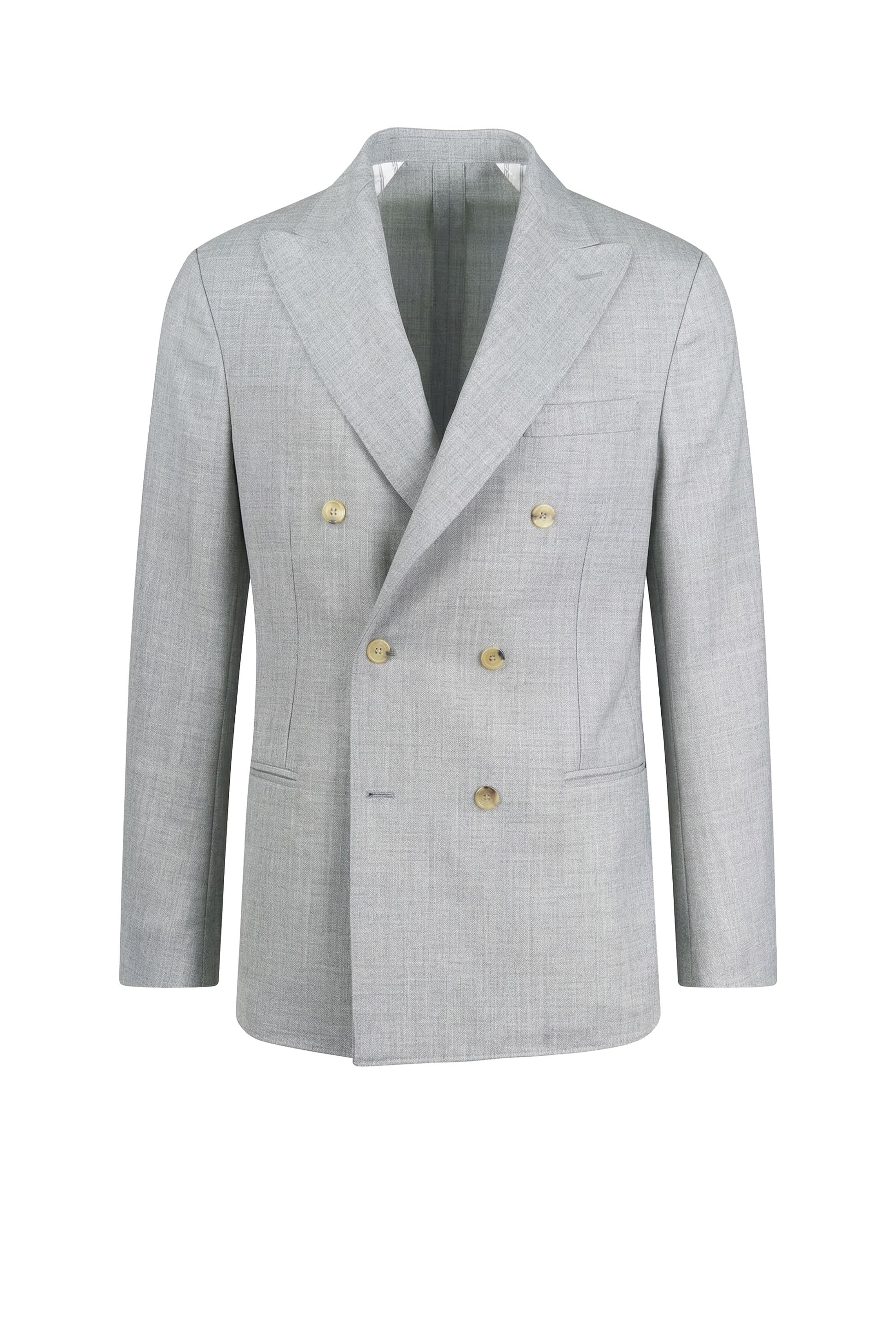 Unlined construction; double-breasted six-button jacket with two-button closure; wide lapels; full AMF stitching; chest welt pocket; welt pockets at the waist; cuffs with matching buttons; lightweight refined structure
