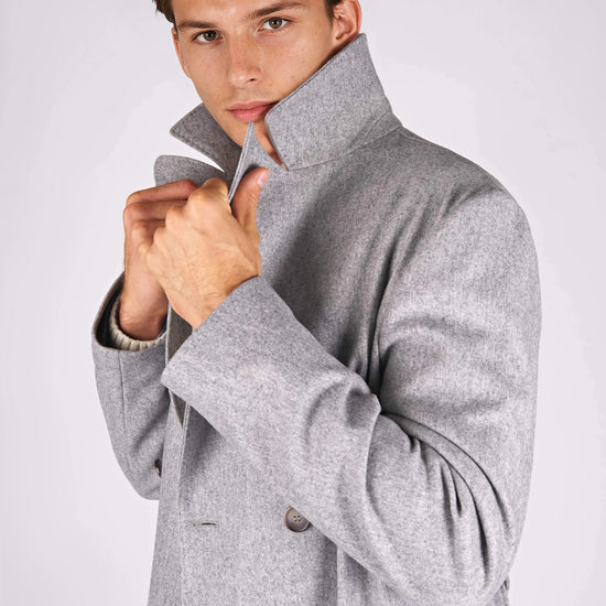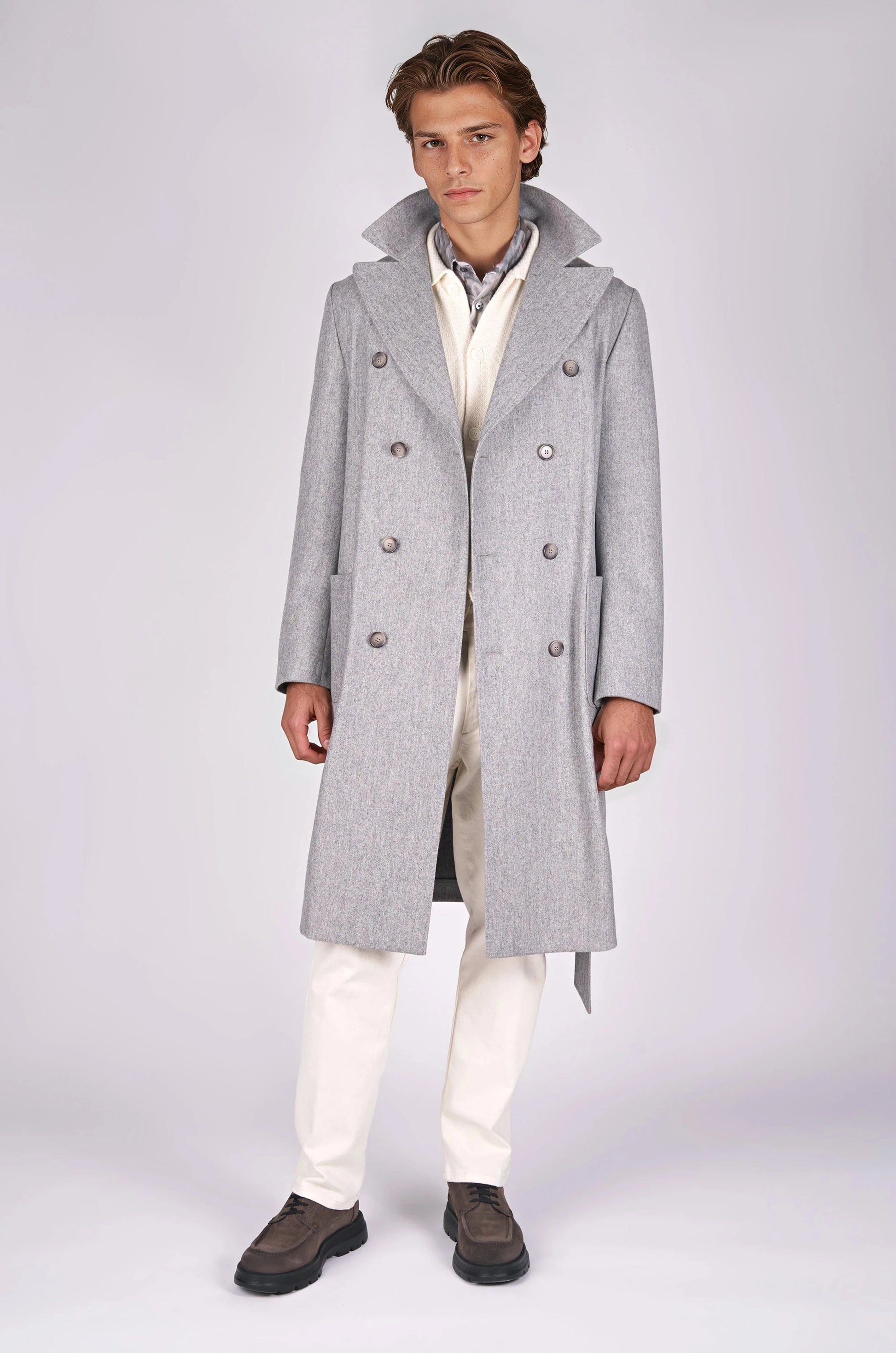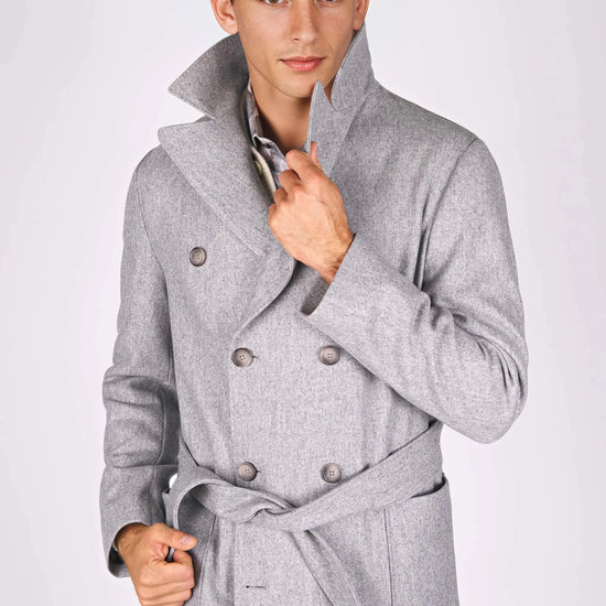 Double-breasted trench coat with four-button closure; Made from 100% Merino wool for warmth and softness; Unlined for a lightweight, breathable fit; Peaked lapels and belted waist for a tailored look; Patch pockets for practicality and style