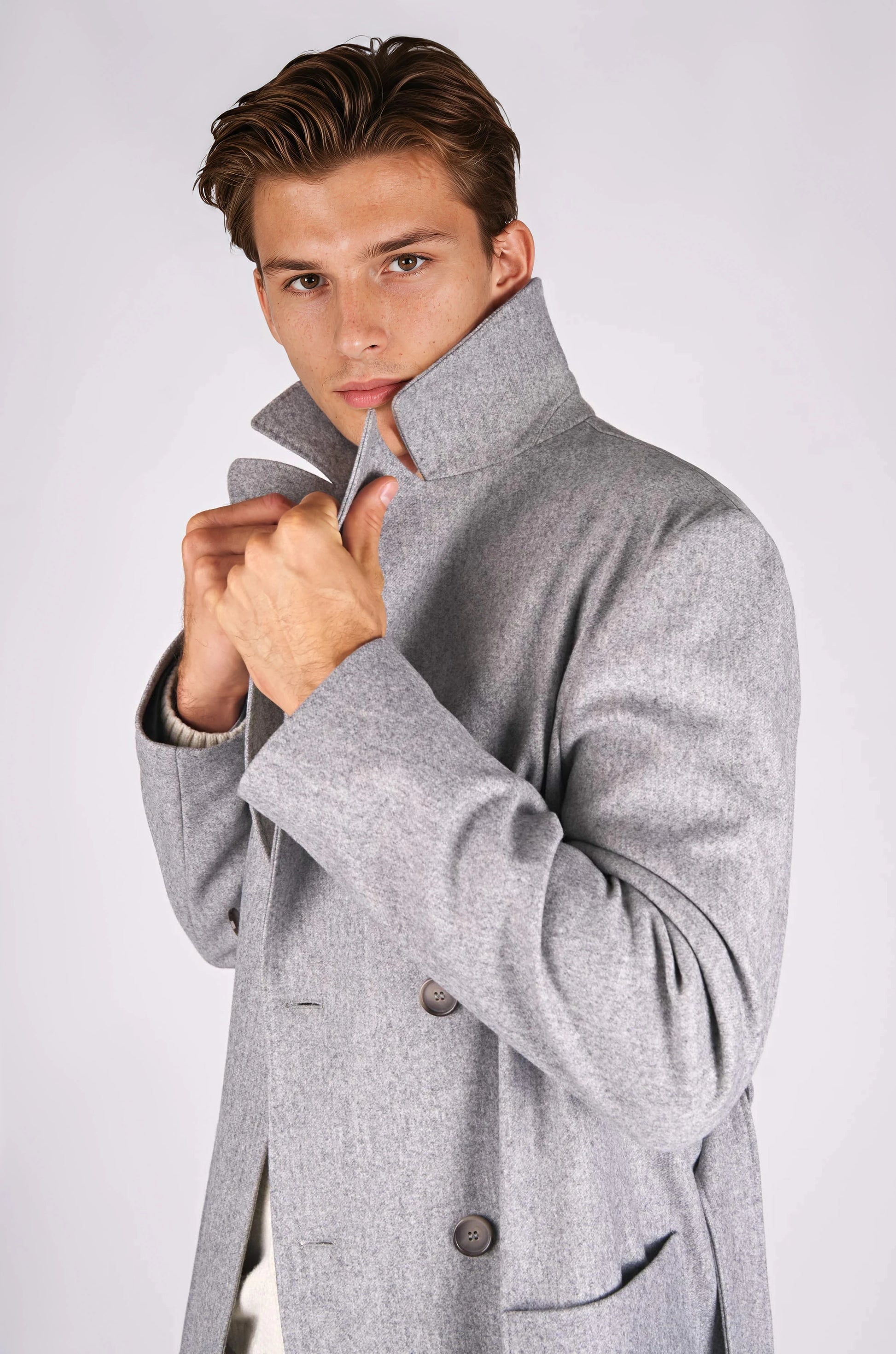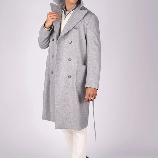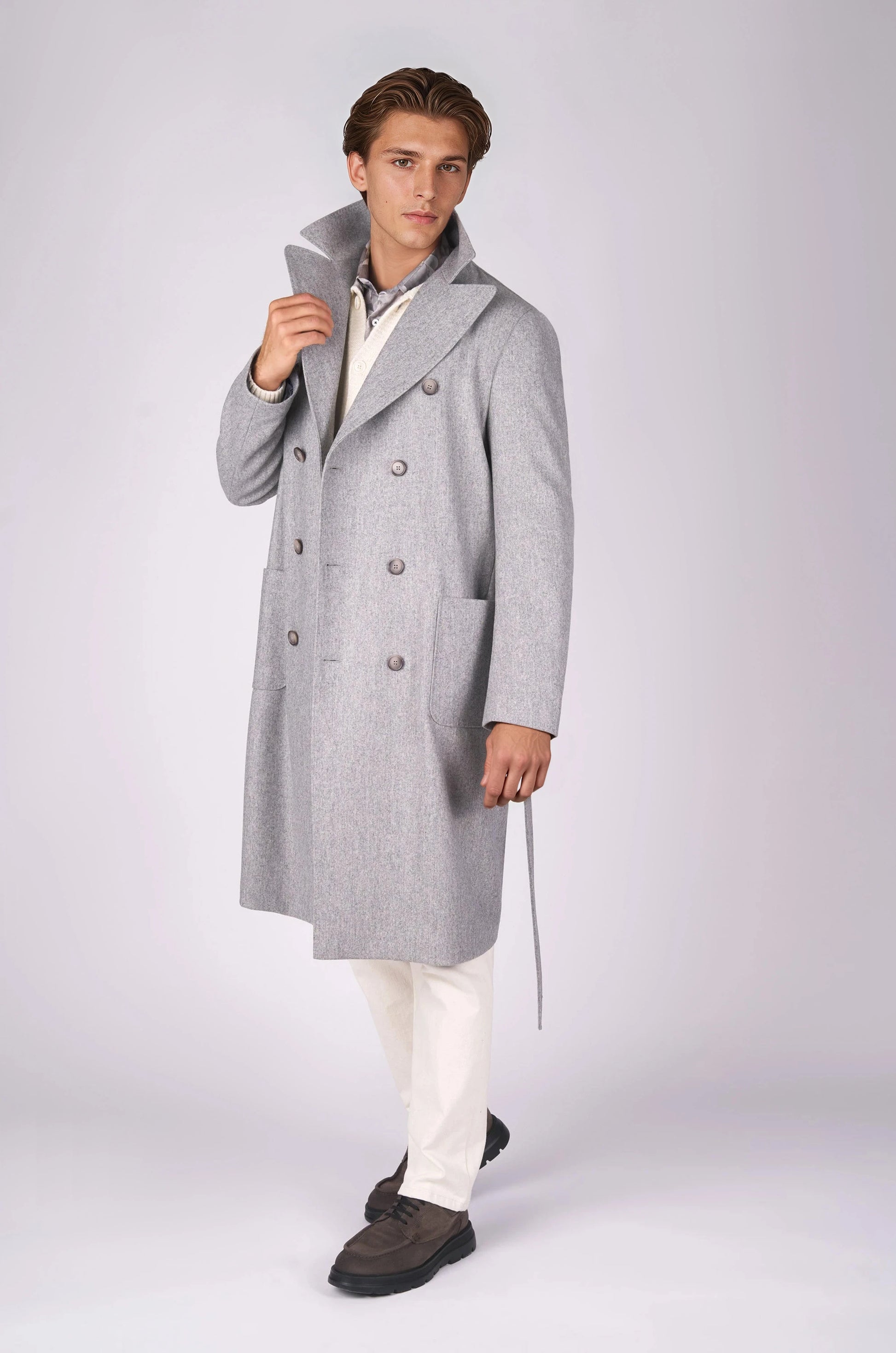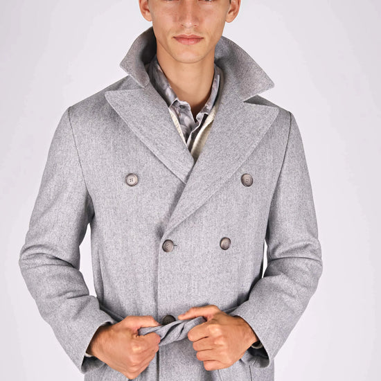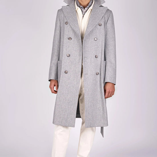 This long trench style coat, crafted from pure Merino wool, combines timeless sophistication with modern comfort. Featuring a double-breasted design with four buttons, peaked lapels, and a belted waist, this coat offers a sleek silhouette with a luxurious feel. The unlined construction ensures a lightweight, breathable fit, perfect for layering in transitional weather.