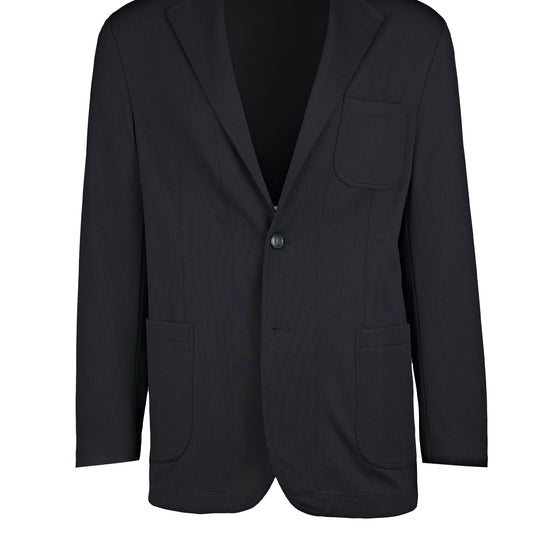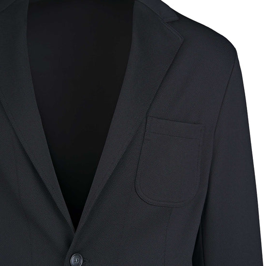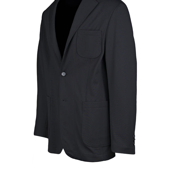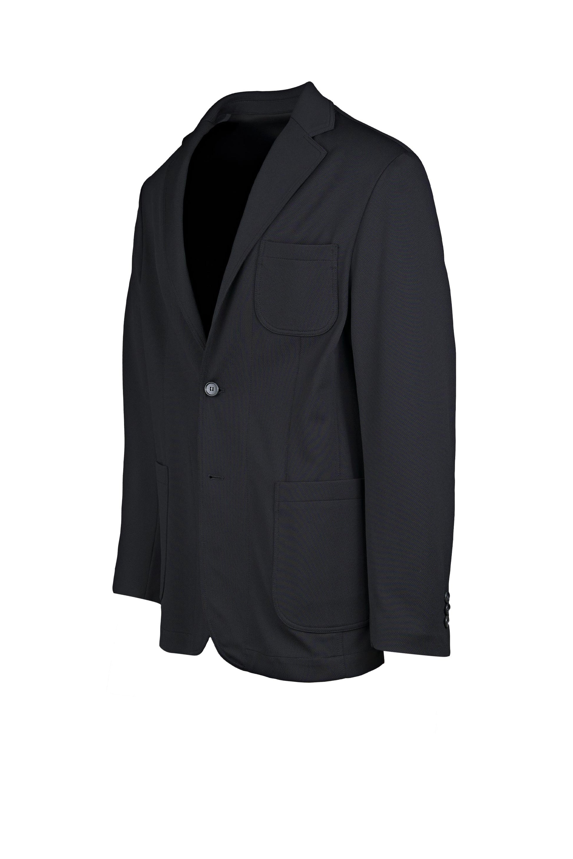 Stretchy, shape-retaining micro-piqué jacquard jersey that resists creasing; unlined, lightweight construction for breathability; single-breasted, 2-button front with notch lapels; practical patch pockets including a rounded chest pocket; no back vents for a clean profile