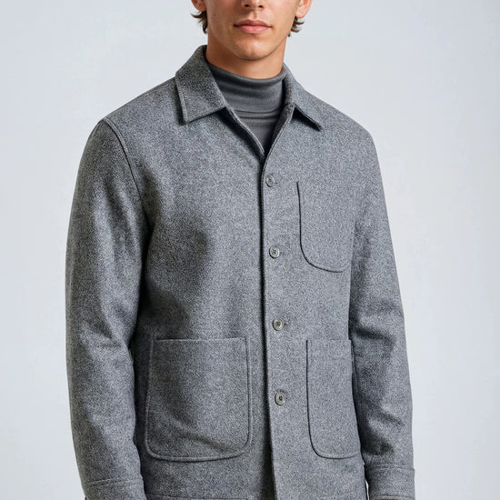 Inspired by classic work jackets, this chore jacket is cut from a soft, dense wool–cashmere cloth with a lightly brushed touch for warmth and a clean look. It is unlined for lightness and ease, featuring neat interiors with top-stitched seams. Front 5-button closure, shirt collar, and three patch pockets: a rounded chest pocket plus two generous hip pockets for daily carry. Regular shoulders with set-in sleeves, tidy stitched cuffs, and a straight hem. The fit is regular, slightly boxy to layer comfortably over knitwear while keeping a sharp silhouette. A versatile piece that blends minimal design with the natural comfort and warmth of wool–cashmere.