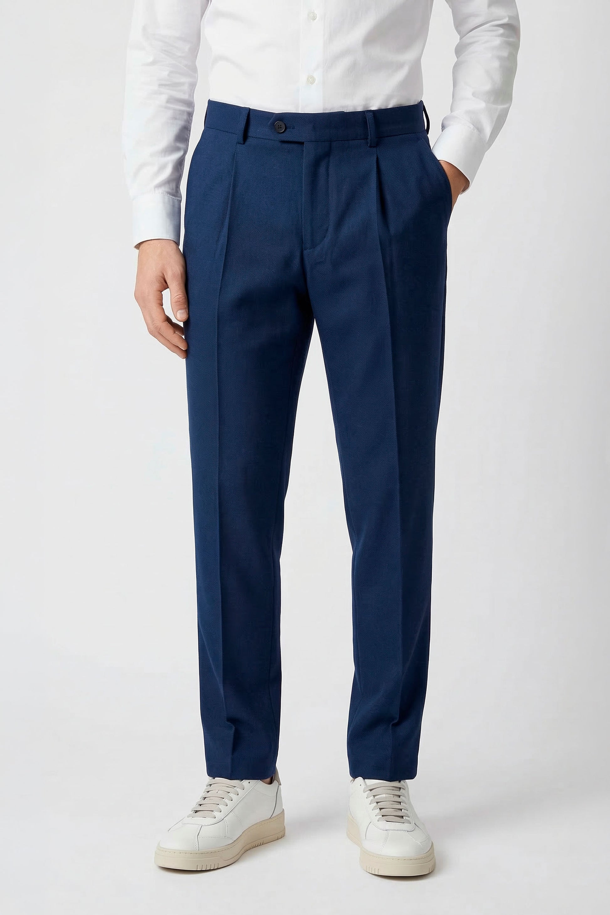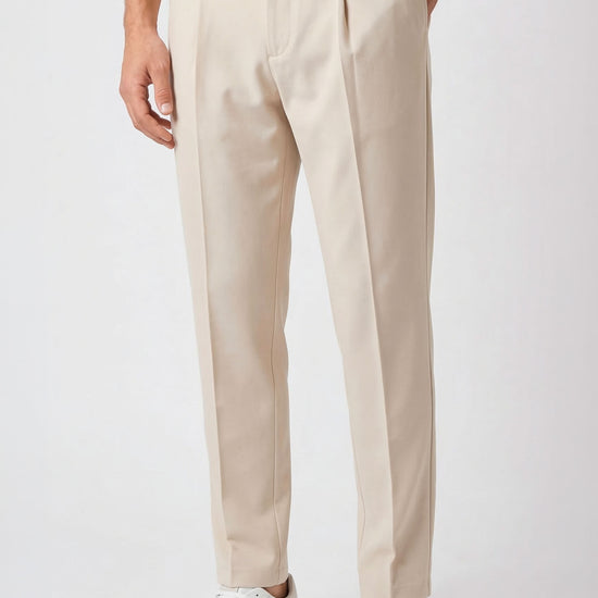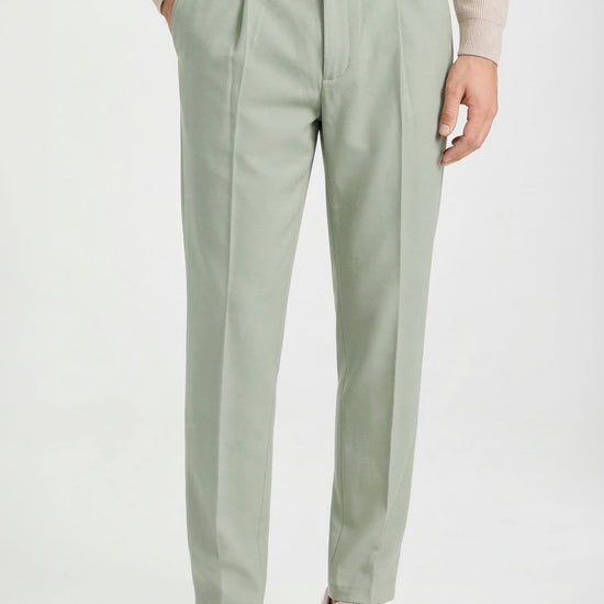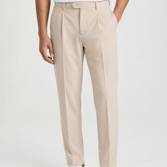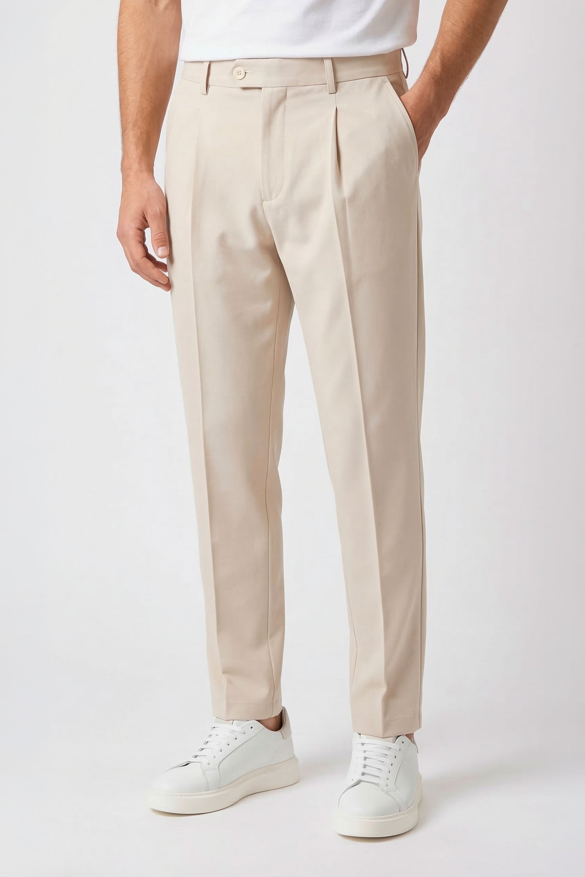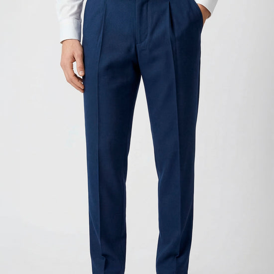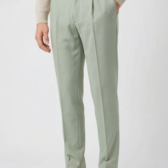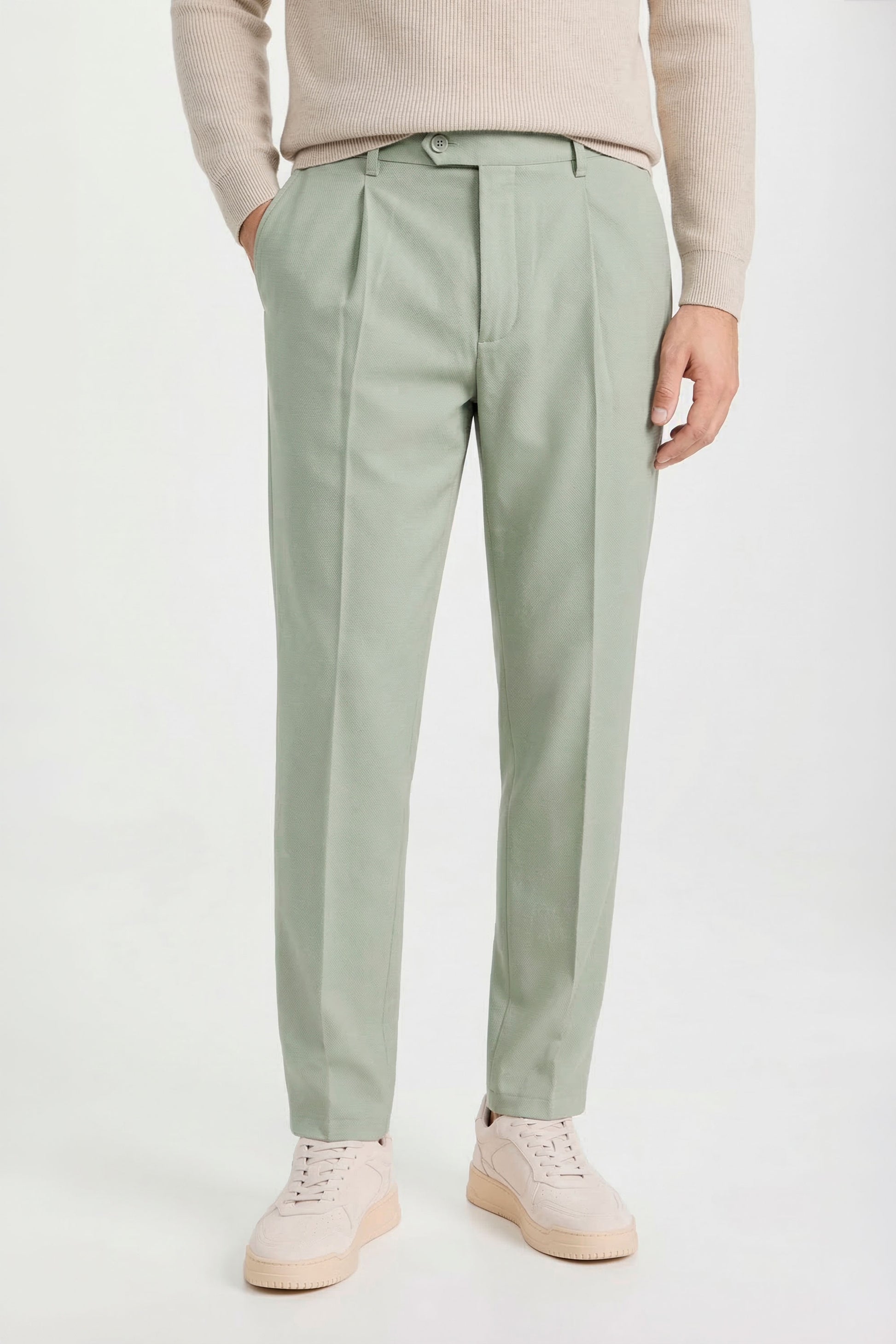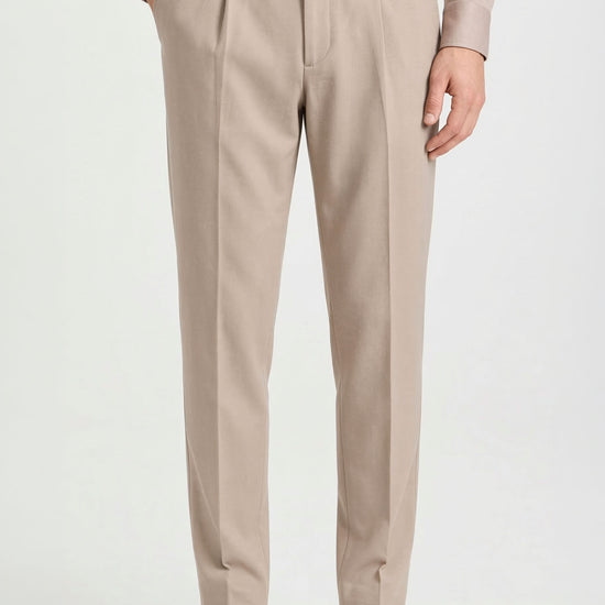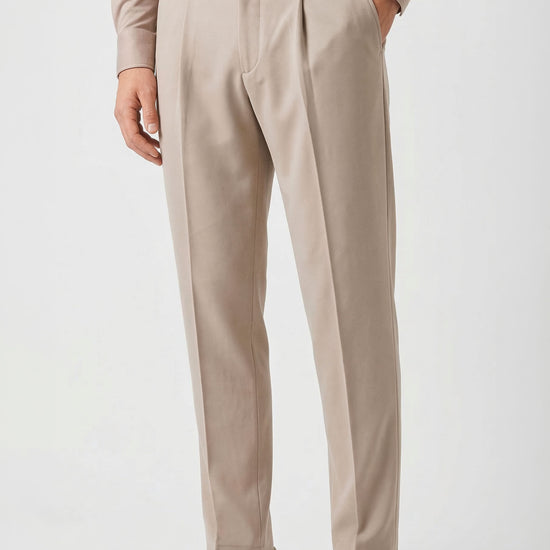 The design follows a clean and modern construction, featuring a traditional waistband without side elastics for a more tailored and minimal silhouette. The front button and zip fastening ensures a precise fit, while the front pleat enhances comfort through the upper part of the trousers. The leg falls with a clean and balanced line, enhanced by a pressed crease that emphasizes the garment’s refined character. Side pockets and rear welt pockets with button complete the design with classic tailoring details. Thanks to the natural stretch and comfort of jersey fabric, this model offers an ideal balance between elegance and practicality, making it perfect for everyday wear, work environments, or travel. Available in four color options.