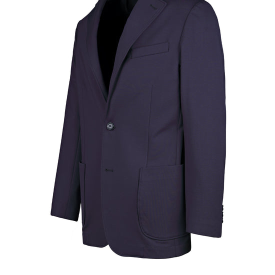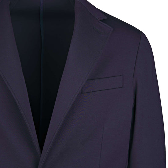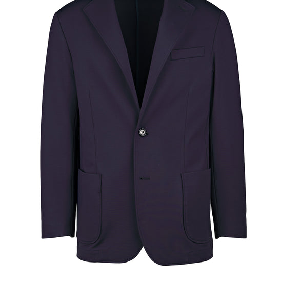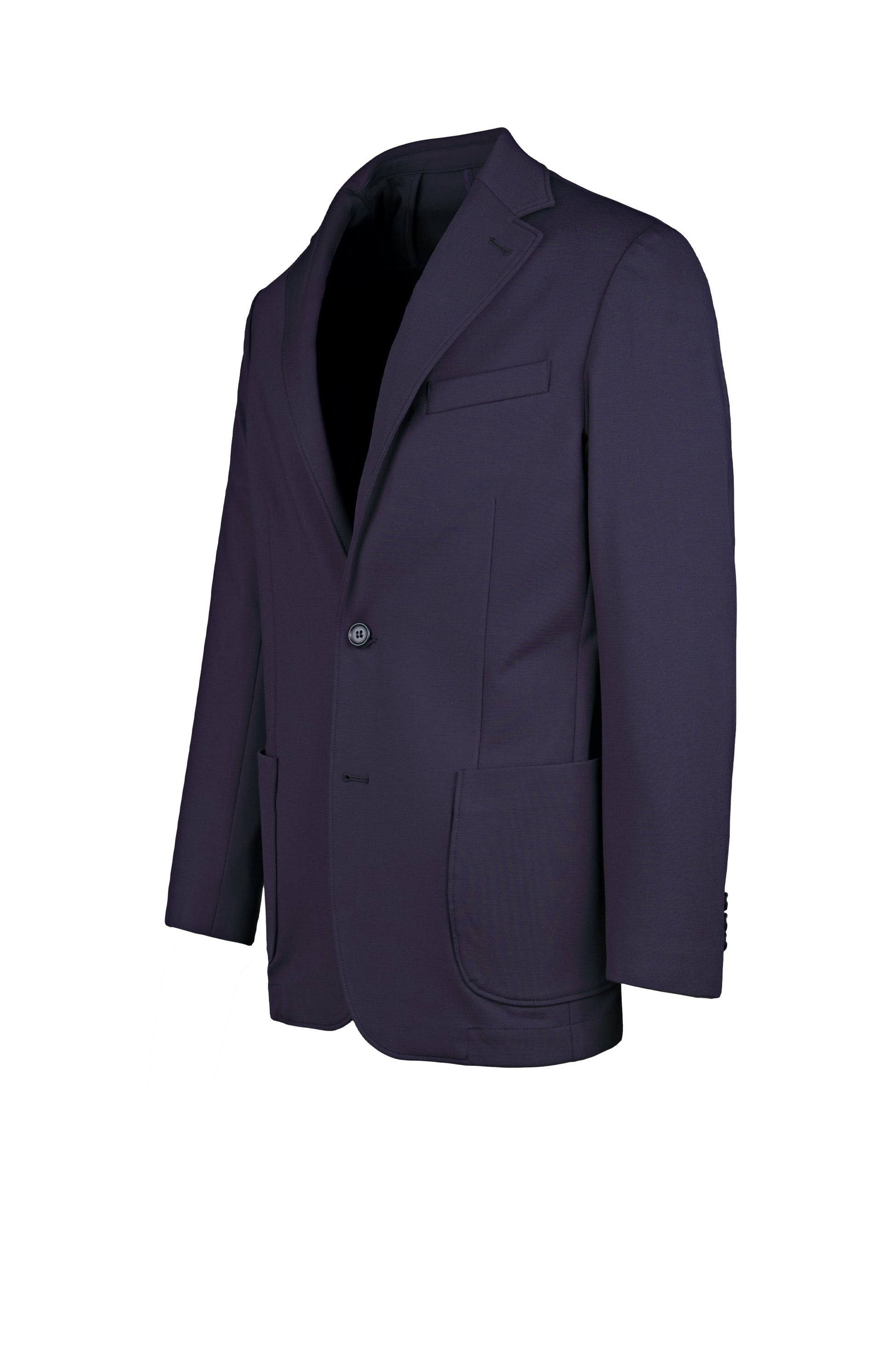 Stretch, wrinkle-resistant technical jersey. Unlined, lightweight build. Notch lapels with welt chest pocket. Large rounded patch pockets. Button closure.
