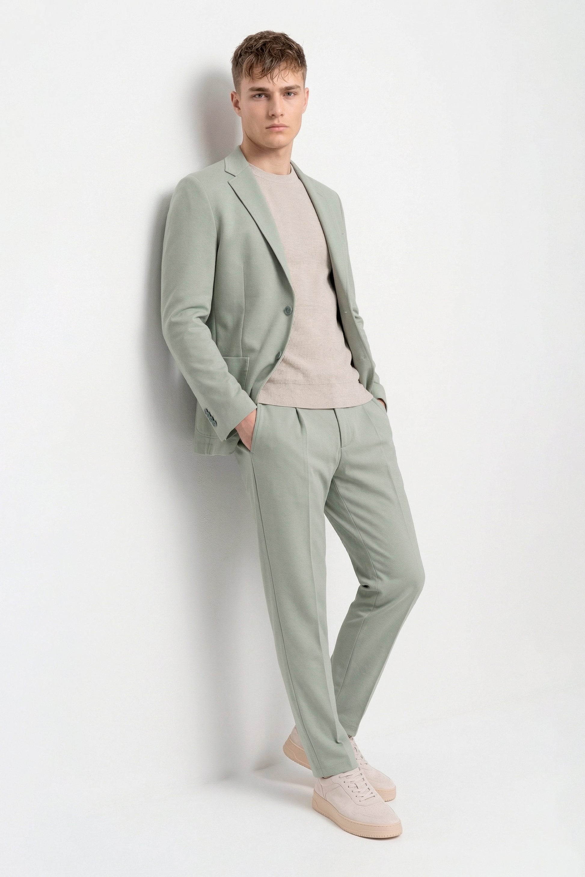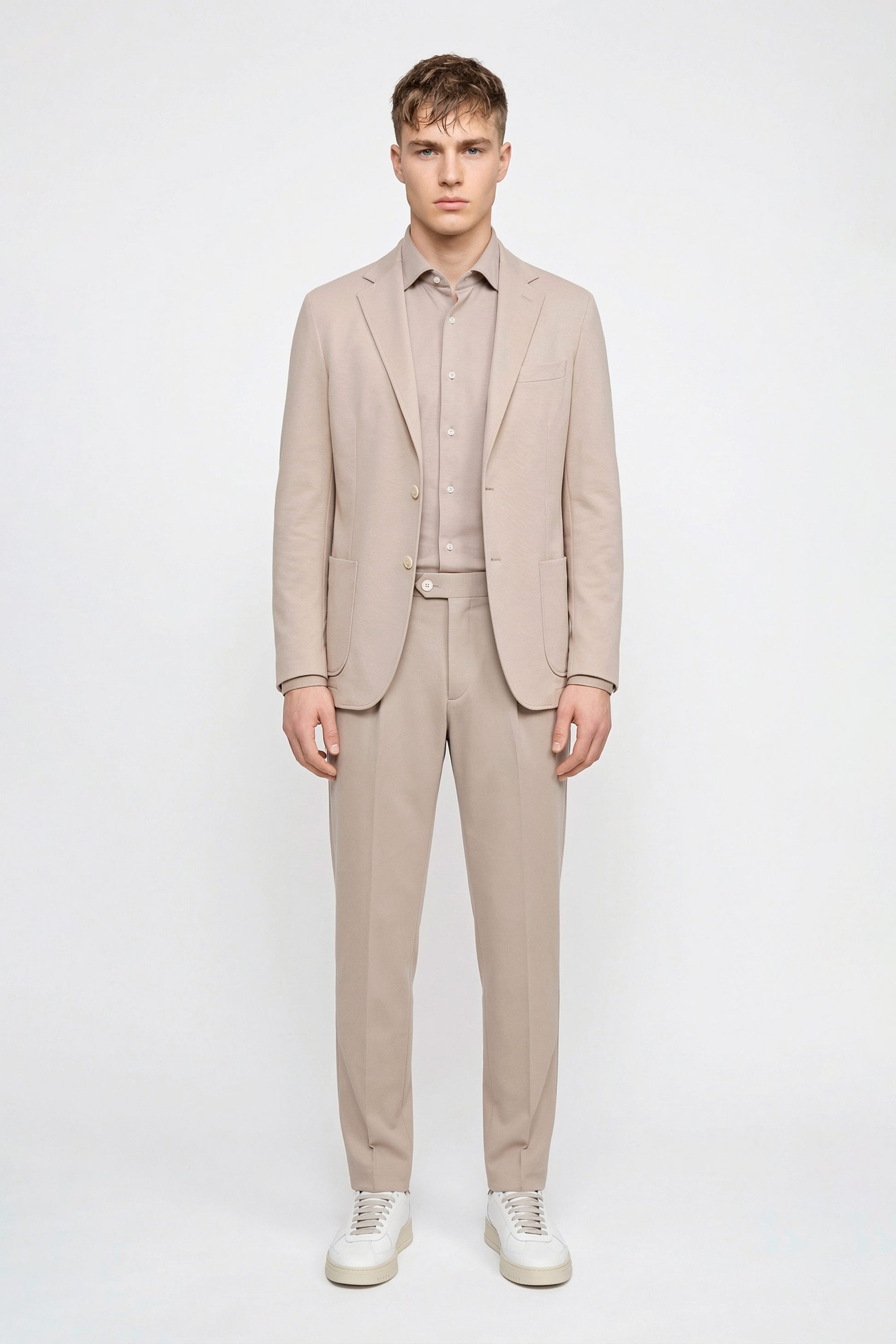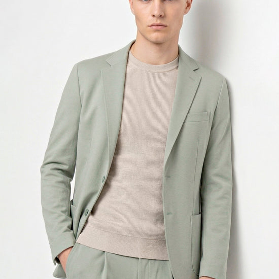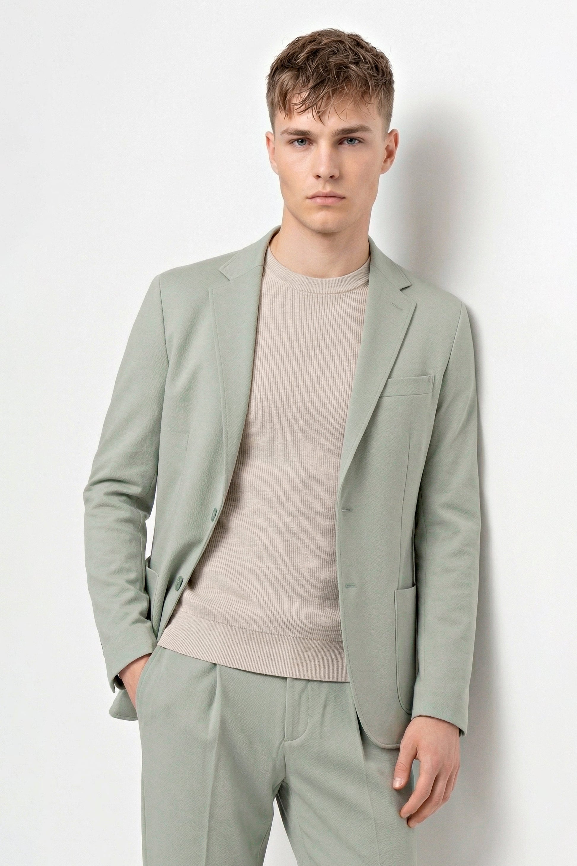 The unlined and deconstructed construction makes the jacket particularly lightweight and versatile, ideal for dynamic everyday wear and for milder seasons. Clean lines enhance the silhouette while maintaining a relaxed yet refined appearance, suitable for both smart casual combinations and modern tailored looks. The design features a classic notch lapel with subtle stitching, a two-button front closure, and a welt chest pocket. The lower patch pockets add practicality and contribute to the jacket’s relaxed and contemporary aesthetic. The sleeves are finished with buttons at the cuffs, while the clean and minimal back highlights the garment’s understated design. The absence of lining allows the lightweight construction to stand out and improves breathability, making the piece ideal for everyday wear with style and functionality. The diagonal jersey fabric keeps the jacket looking neat while offering a soft hand, perfectly expressing the modern tailoring concept that defines the ZMART line.
