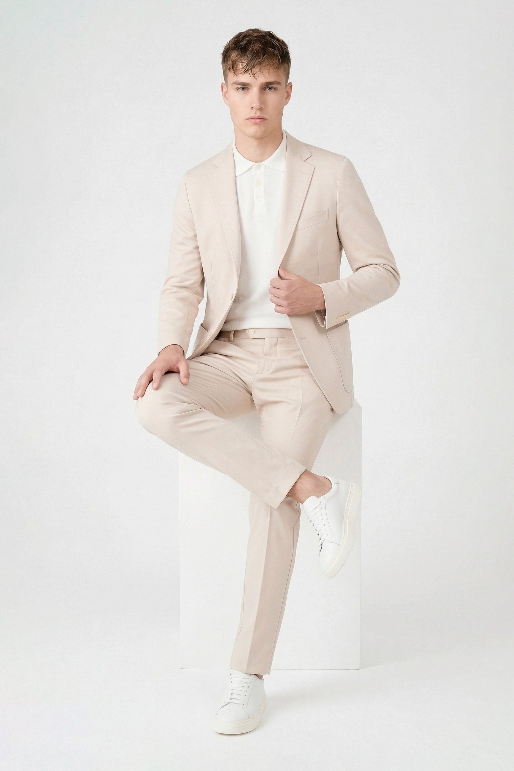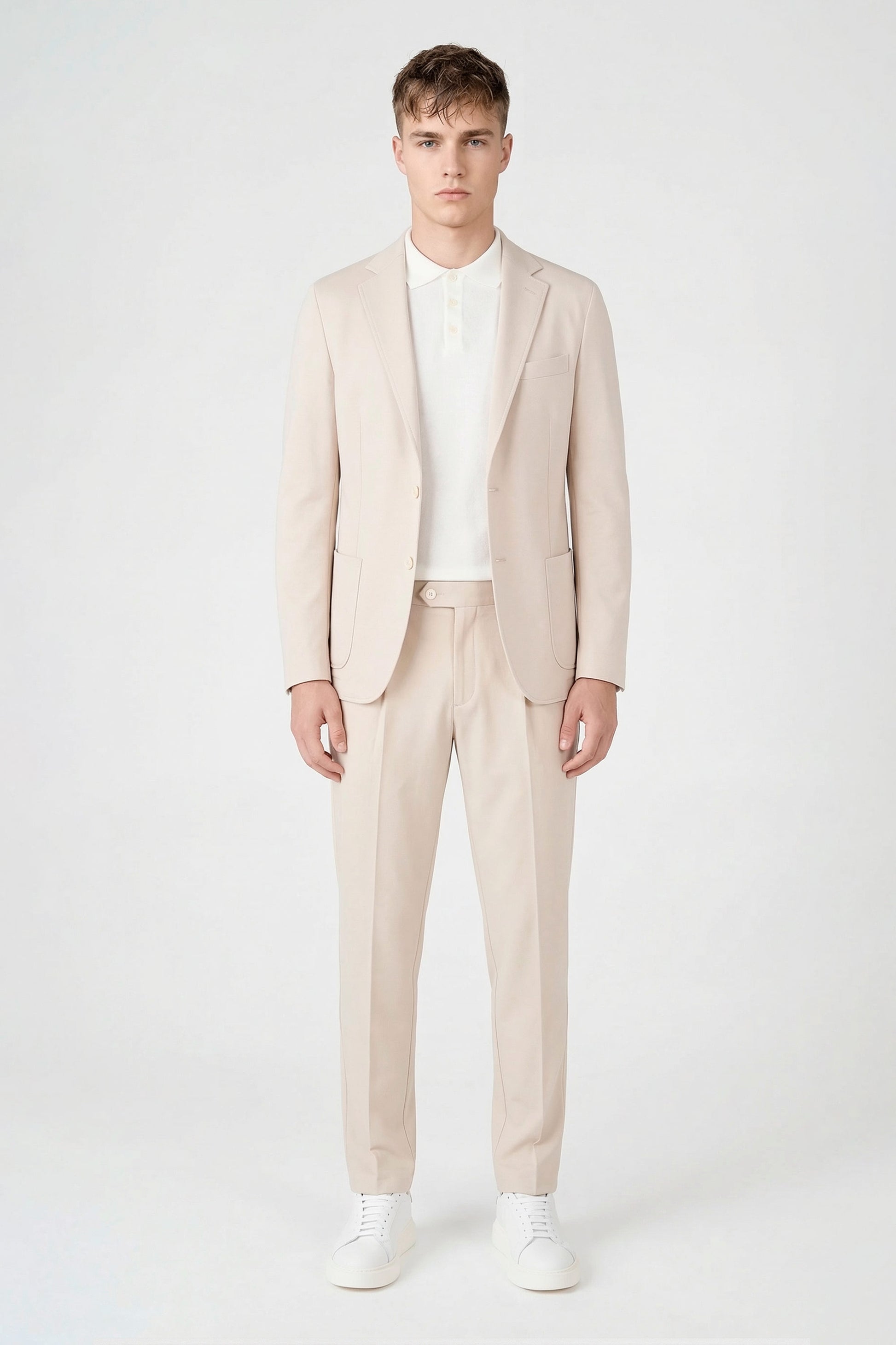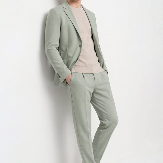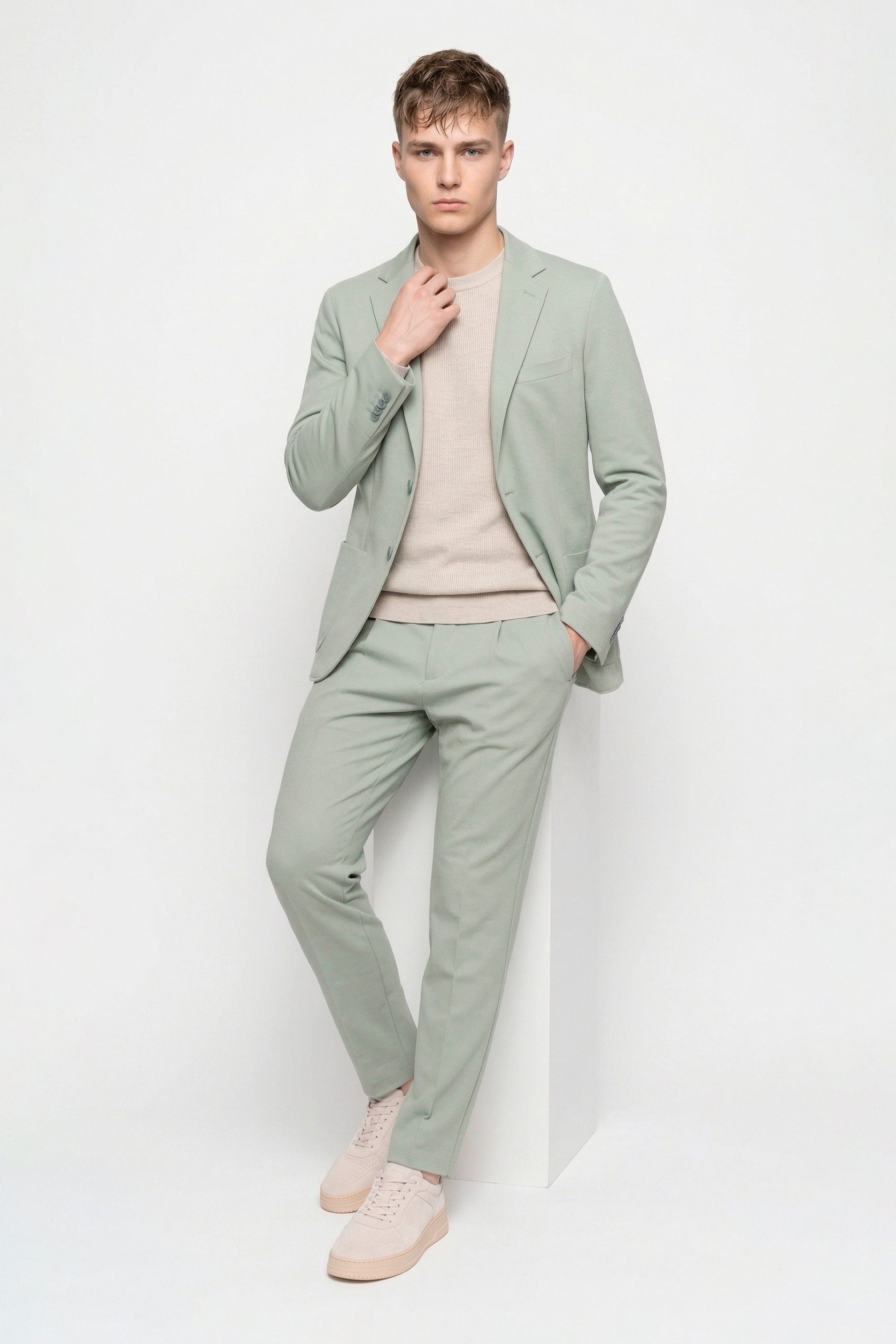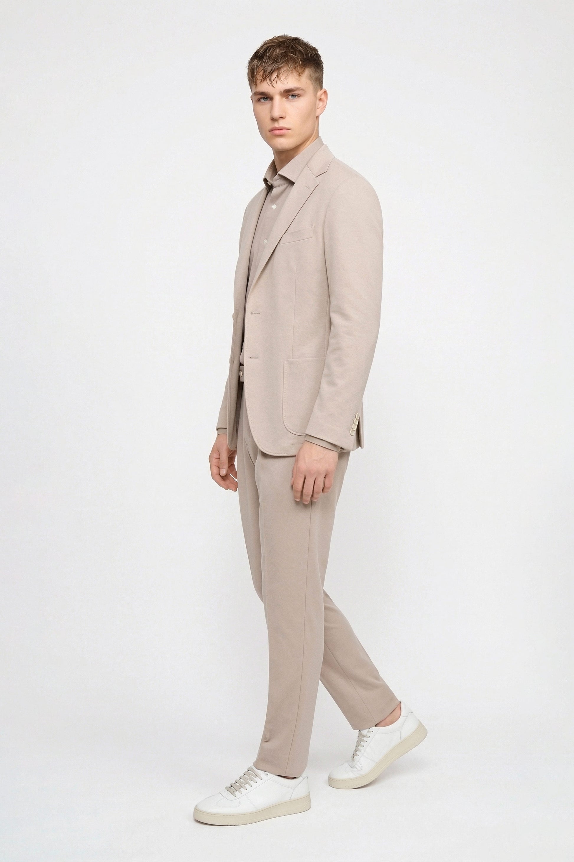 The unlined and deconstructed construction makes the jacket particularly lightweight and versatile, ideal for dynamic everyday wear and for milder seasons. Clean lines enhance the silhouette while maintaining a relaxed yet refined appearance, suitable for both smart casual combinations and modern tailored looks. The design features a classic notch lapel with subtle stitching, a two-button front closure, and a welt chest pocket. The lower patch pockets add practicality and contribute to the jacket’s relaxed and contemporary aesthetic. The sleeves are finished with buttons at the cuffs, while the clean and minimal back highlights the garment’s understated design. The absence of lining allows the lightweight construction to stand out and improves breathability, making the piece ideal for everyday wear with style and functionality. The diagonal jersey fabric keeps the jacket looking neat while offering a soft hand, perfectly expressing the modern tailoring concept that defines the ZMART line.