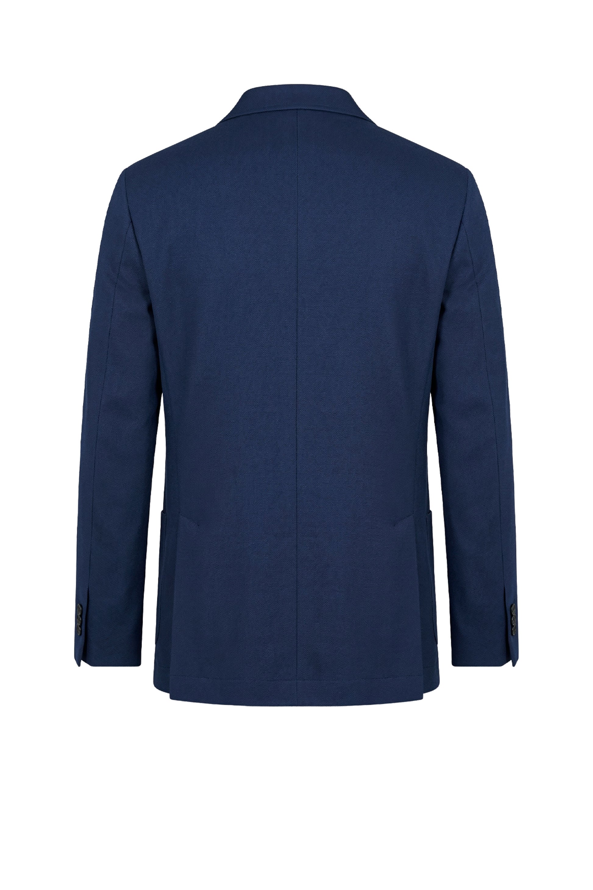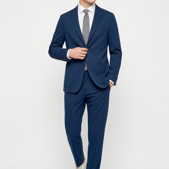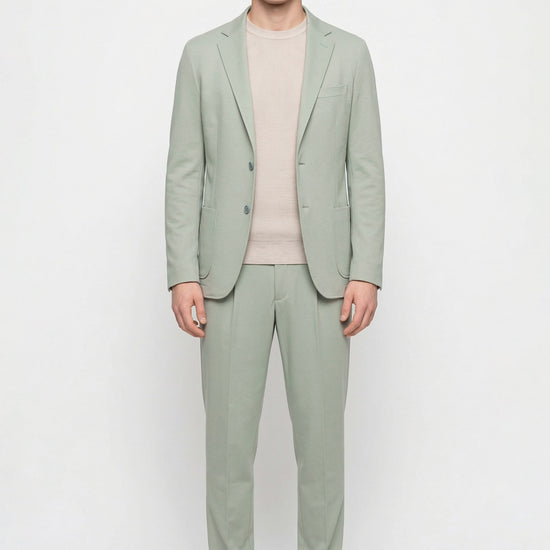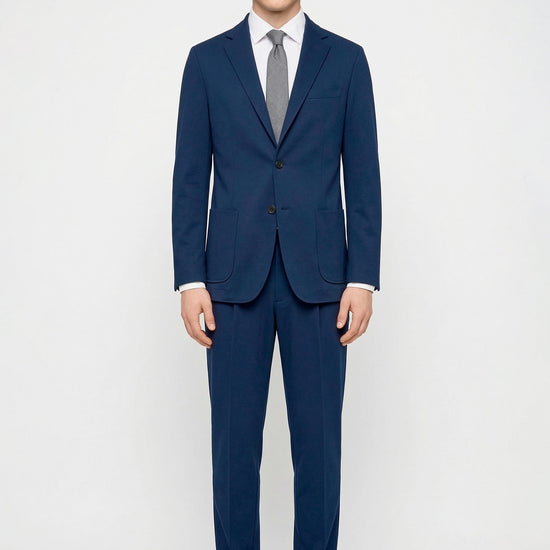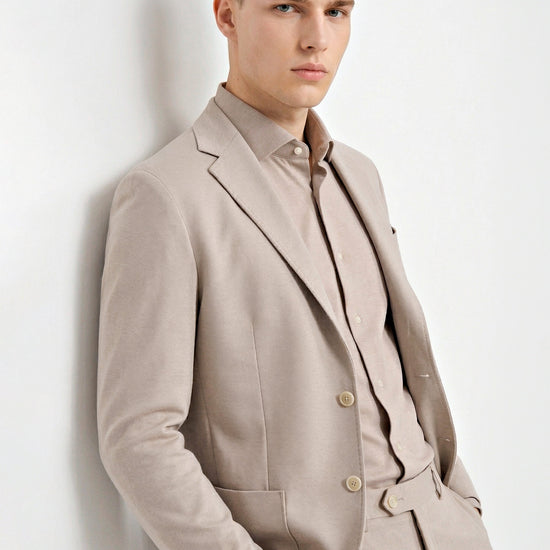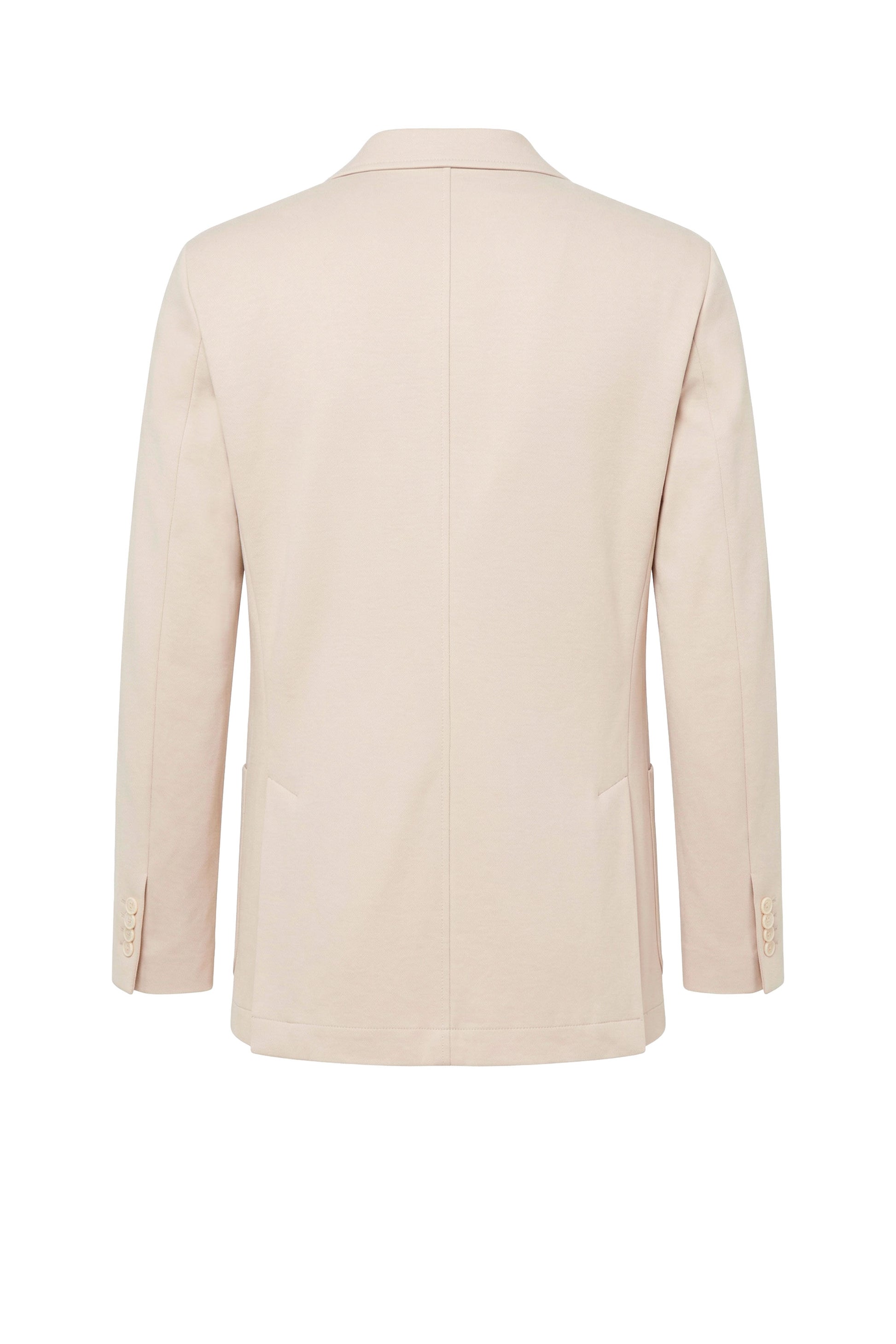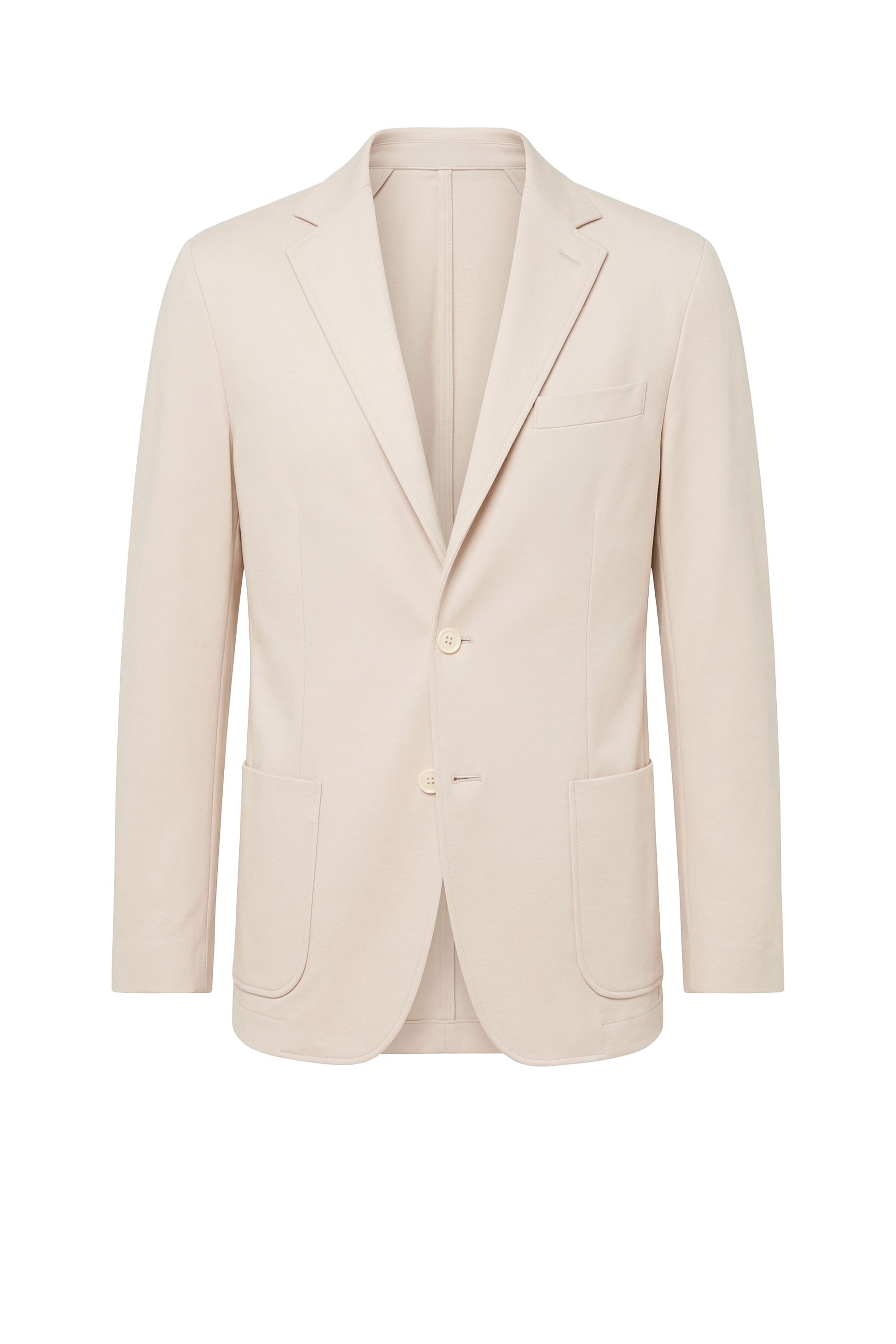 Diagonal jersey fabric; unlined deconstructed construction; classic notch lapel; two-button closure; welt chest pocket; patch pockets; sleeve buttons; lightweight comfortable structure