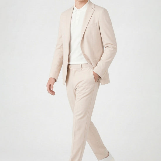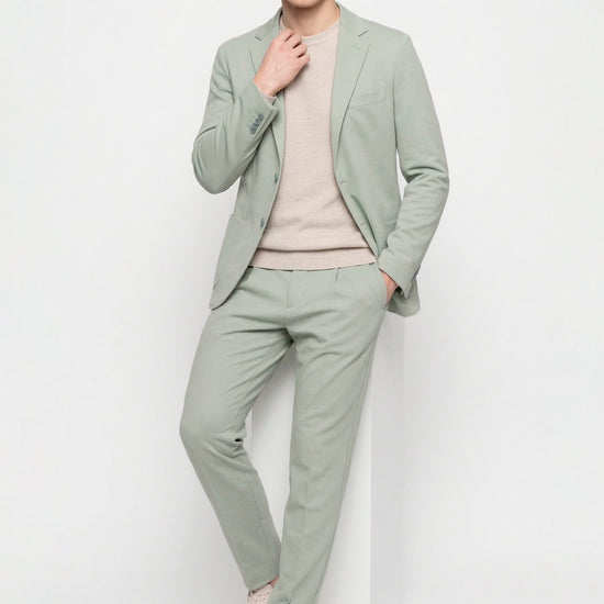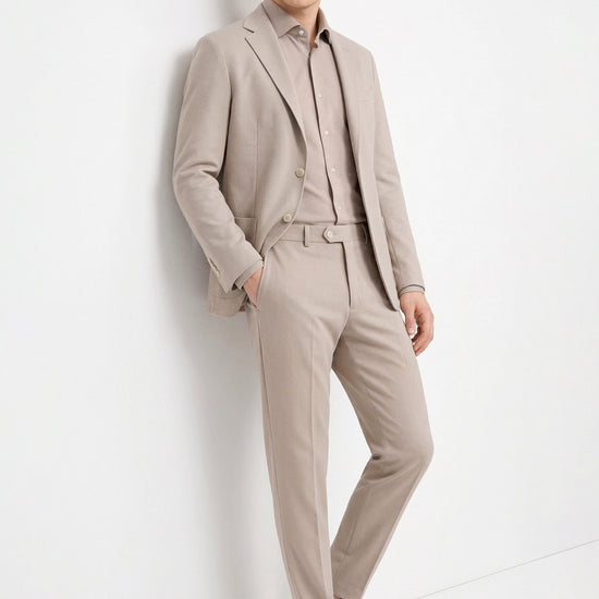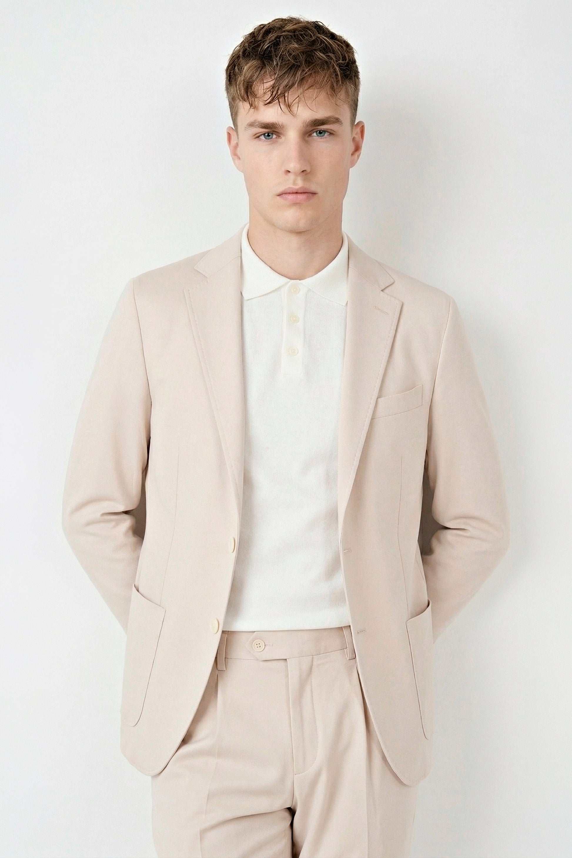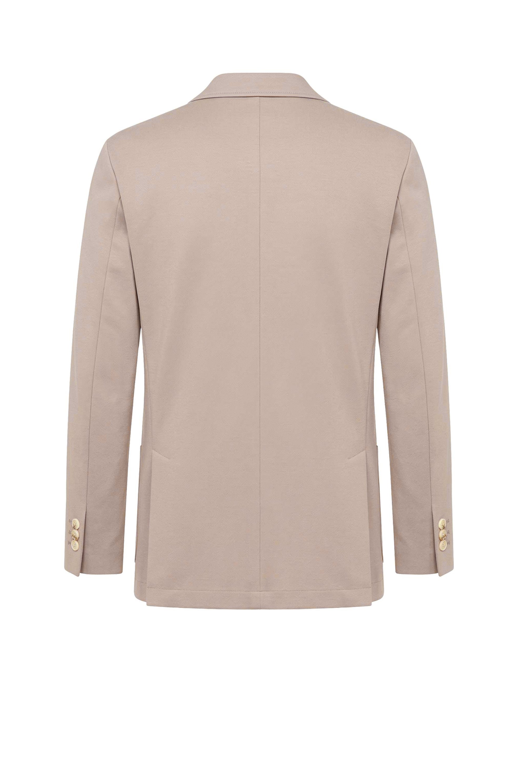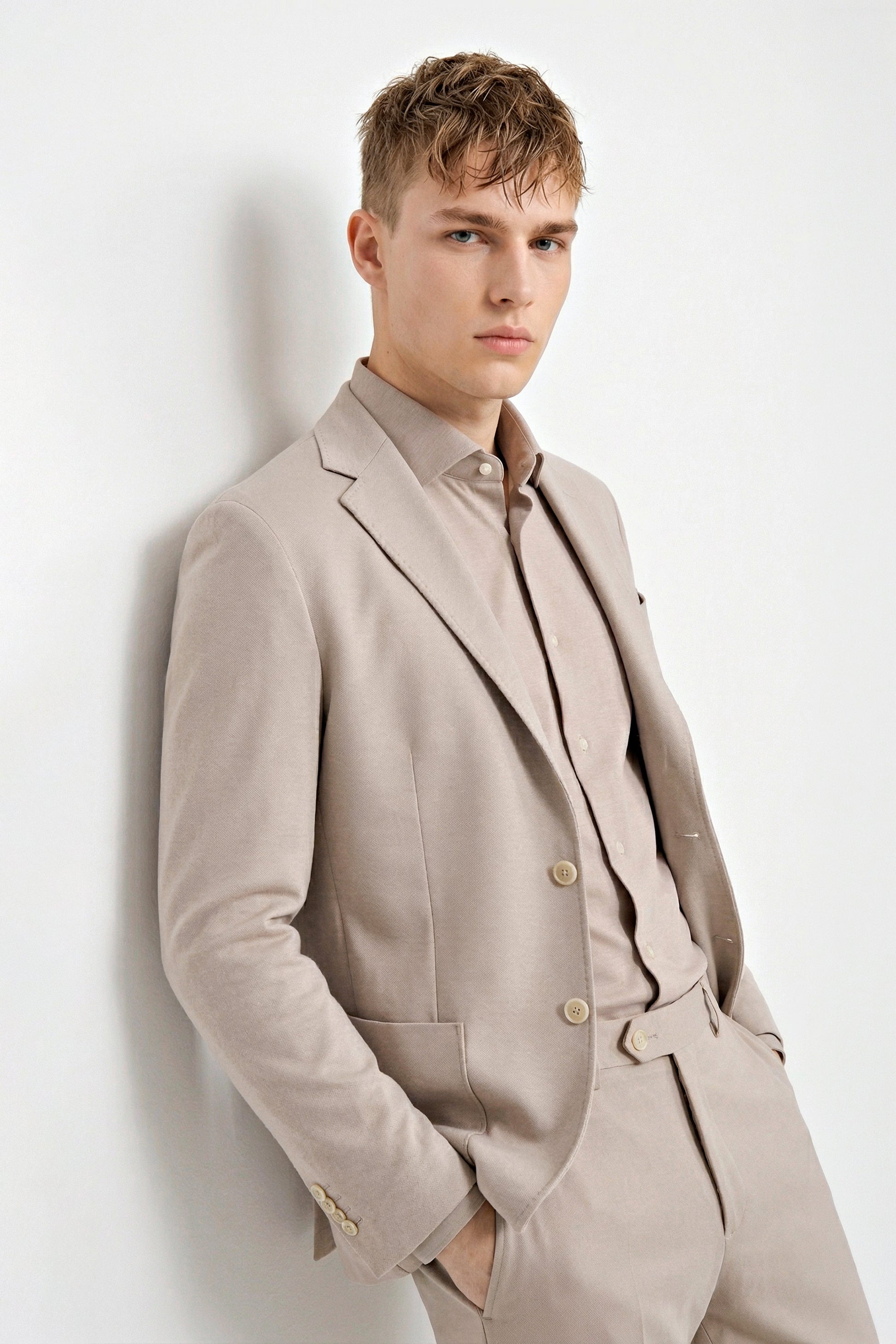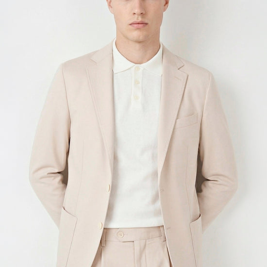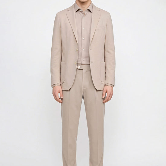 Diagonal jersey fabric; unlined deconstructed construction; classic notch lapel; two-button closure; welt chest pocket; patch pockets; sleeve buttons; lightweight comfortable structure