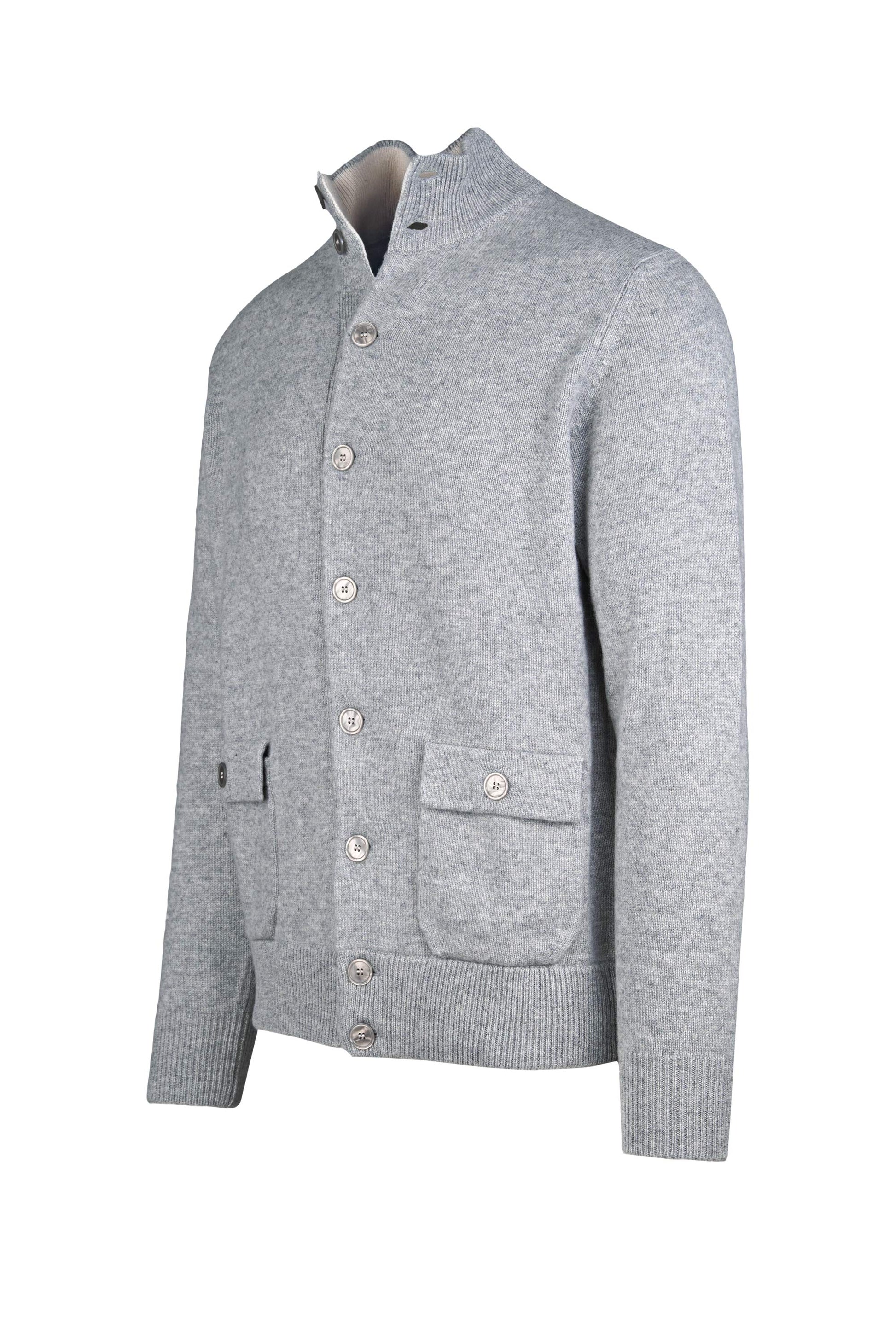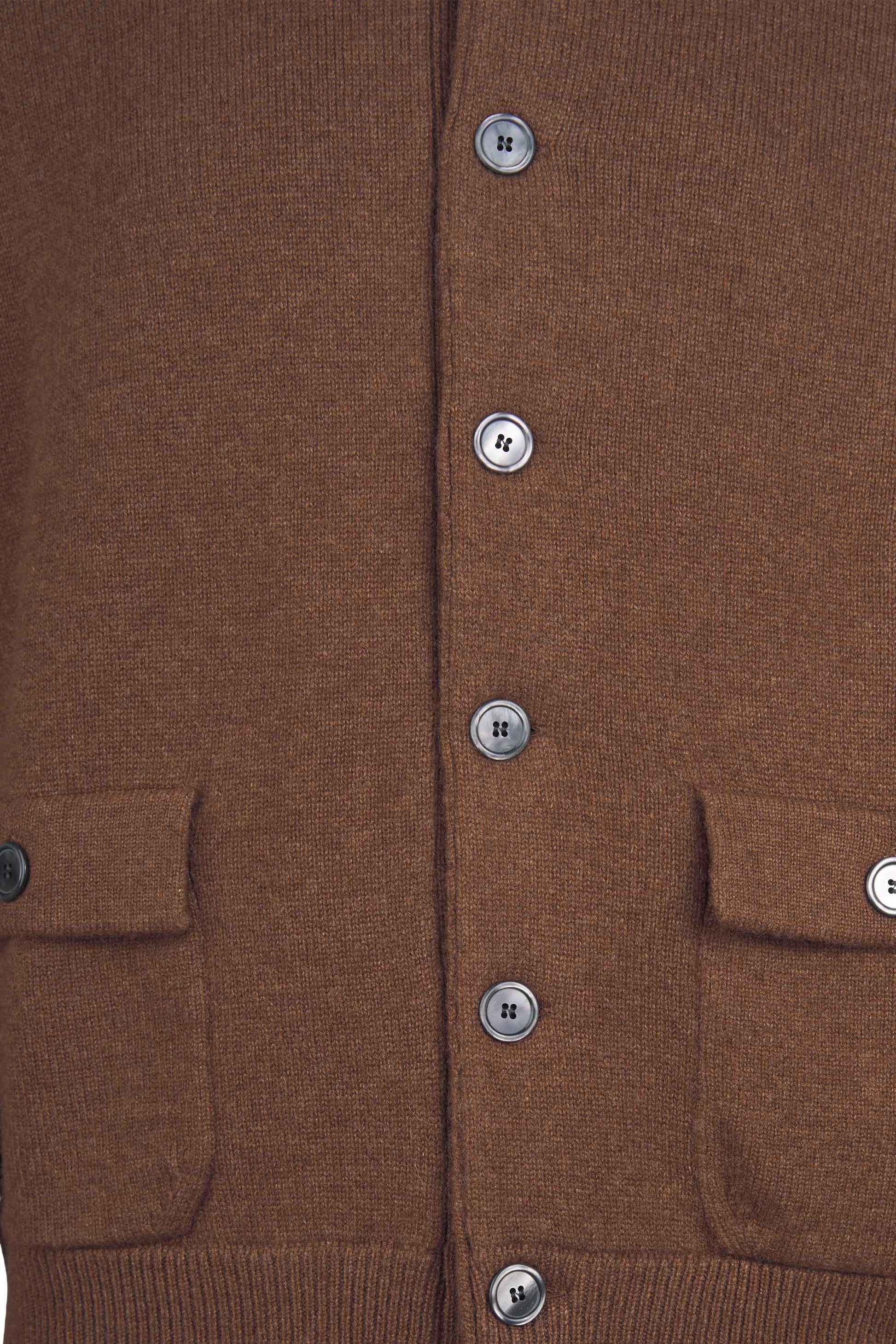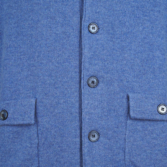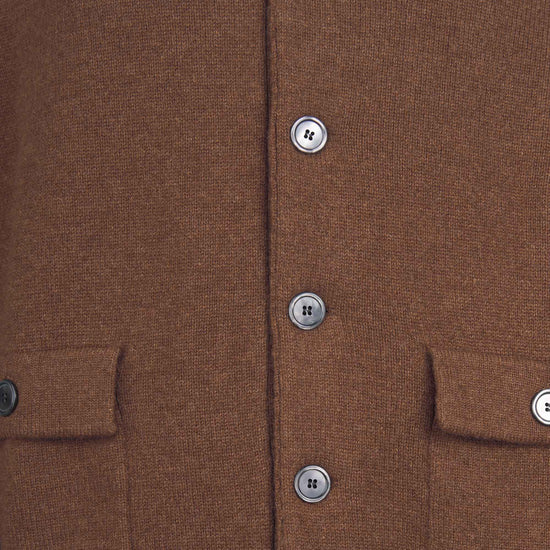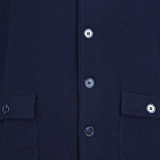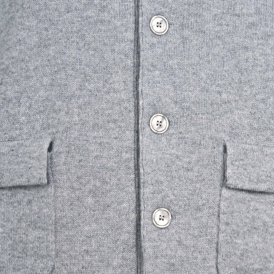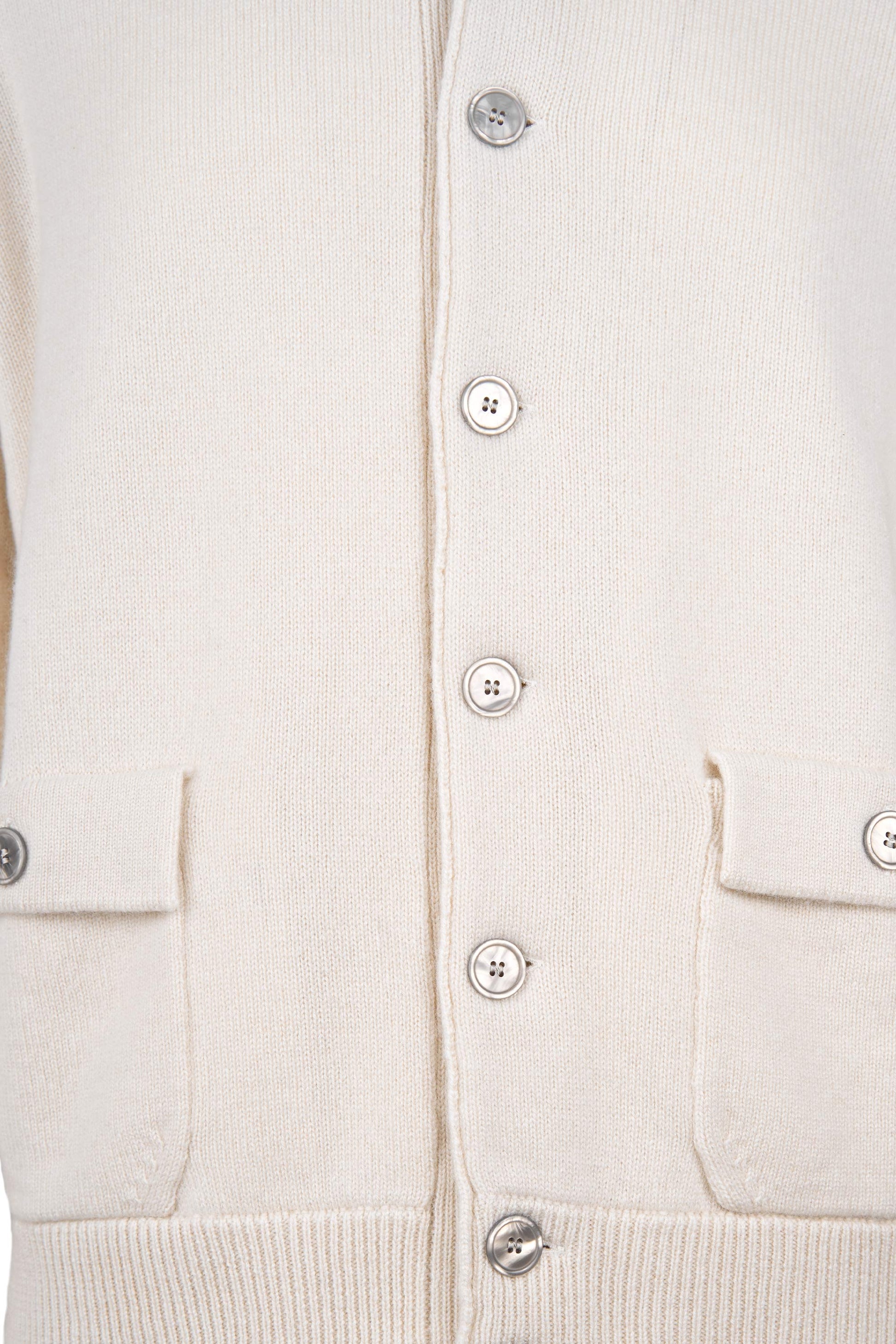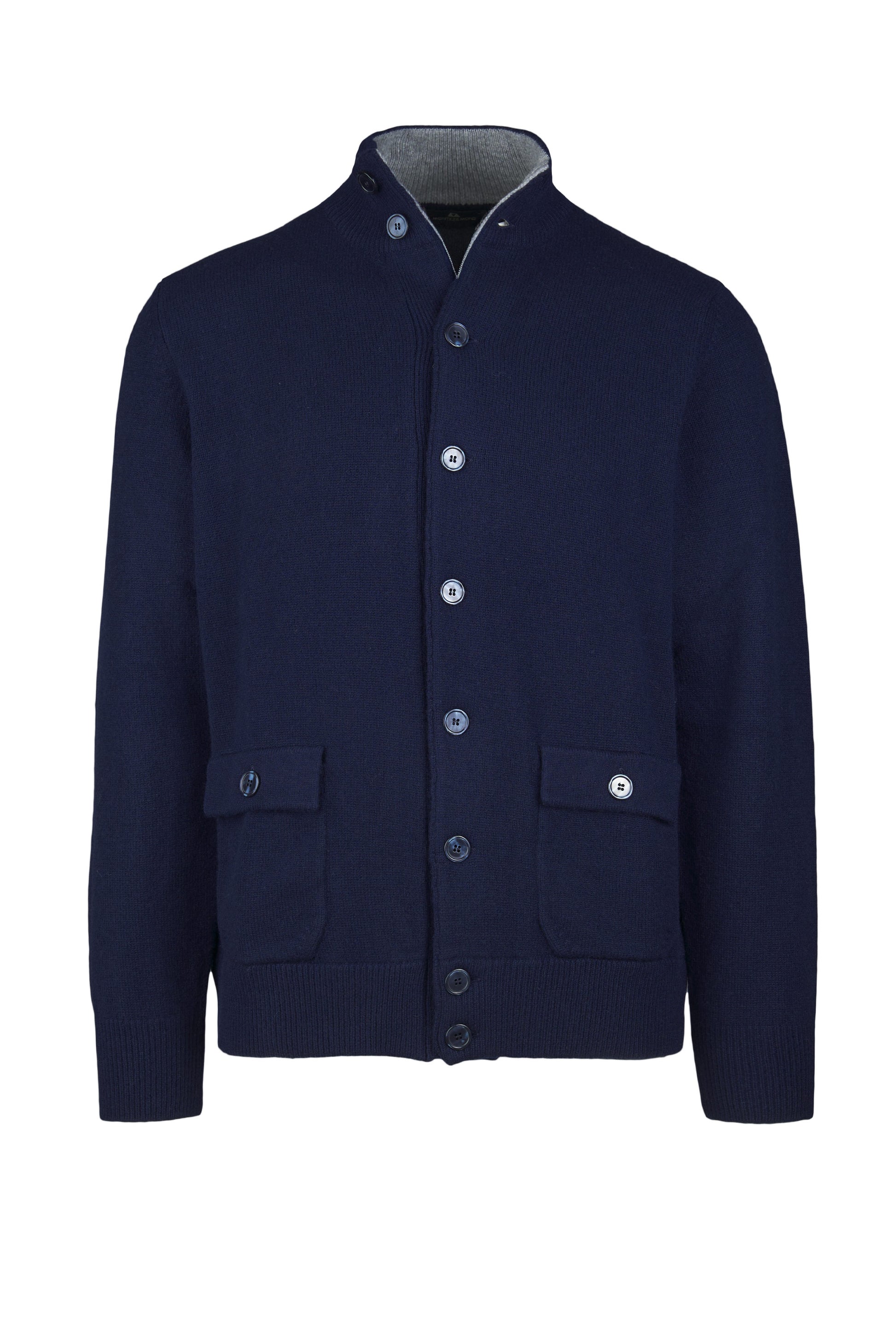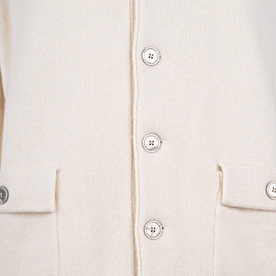 Puro cashmere, mano soffice e calda. Chiusura frontale con 7 bottoni. Collo in maglia a coste con interno a contrasto. Due tasche applicate con patta e bottone. Fondo e polsi a costine.