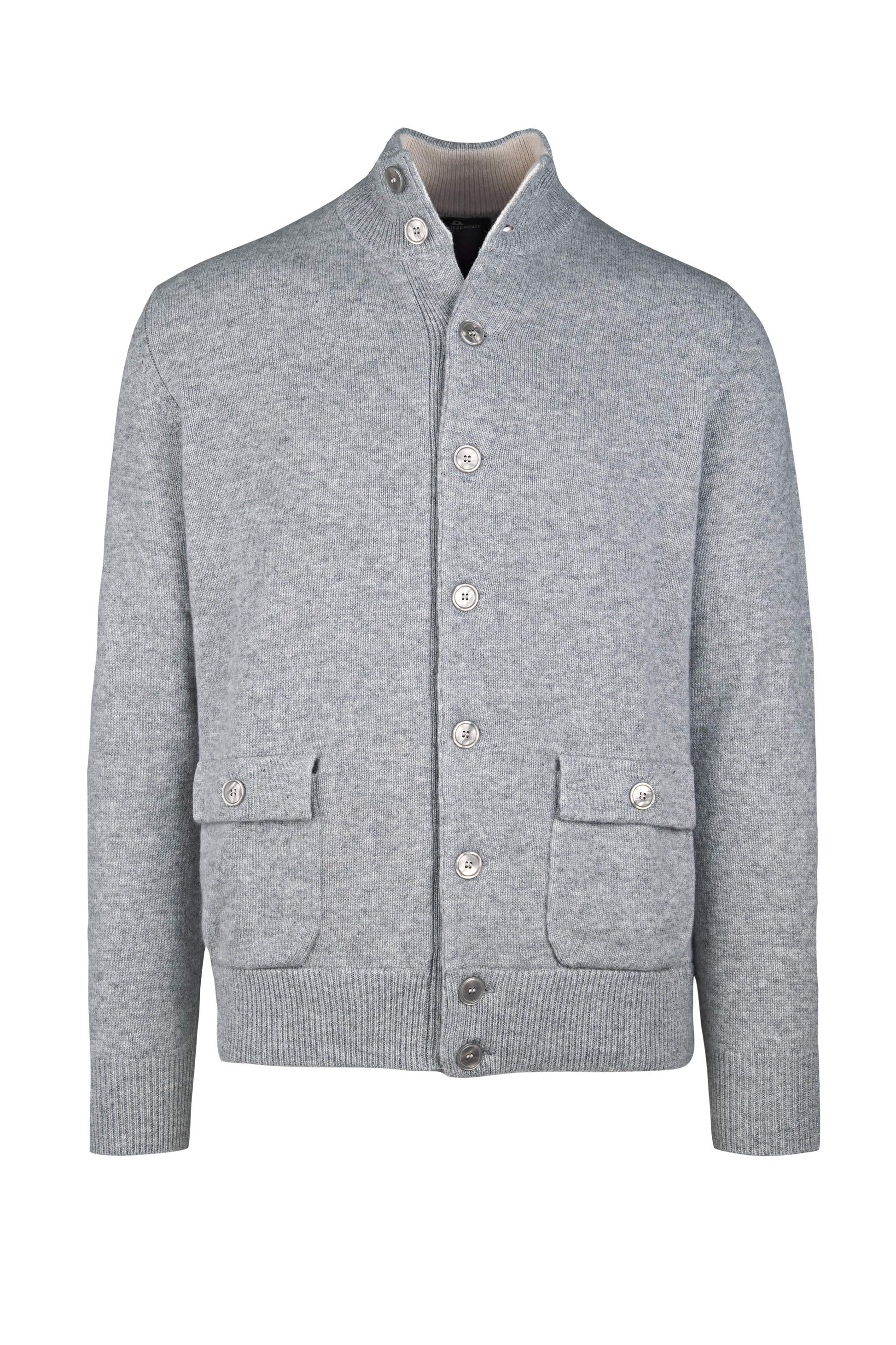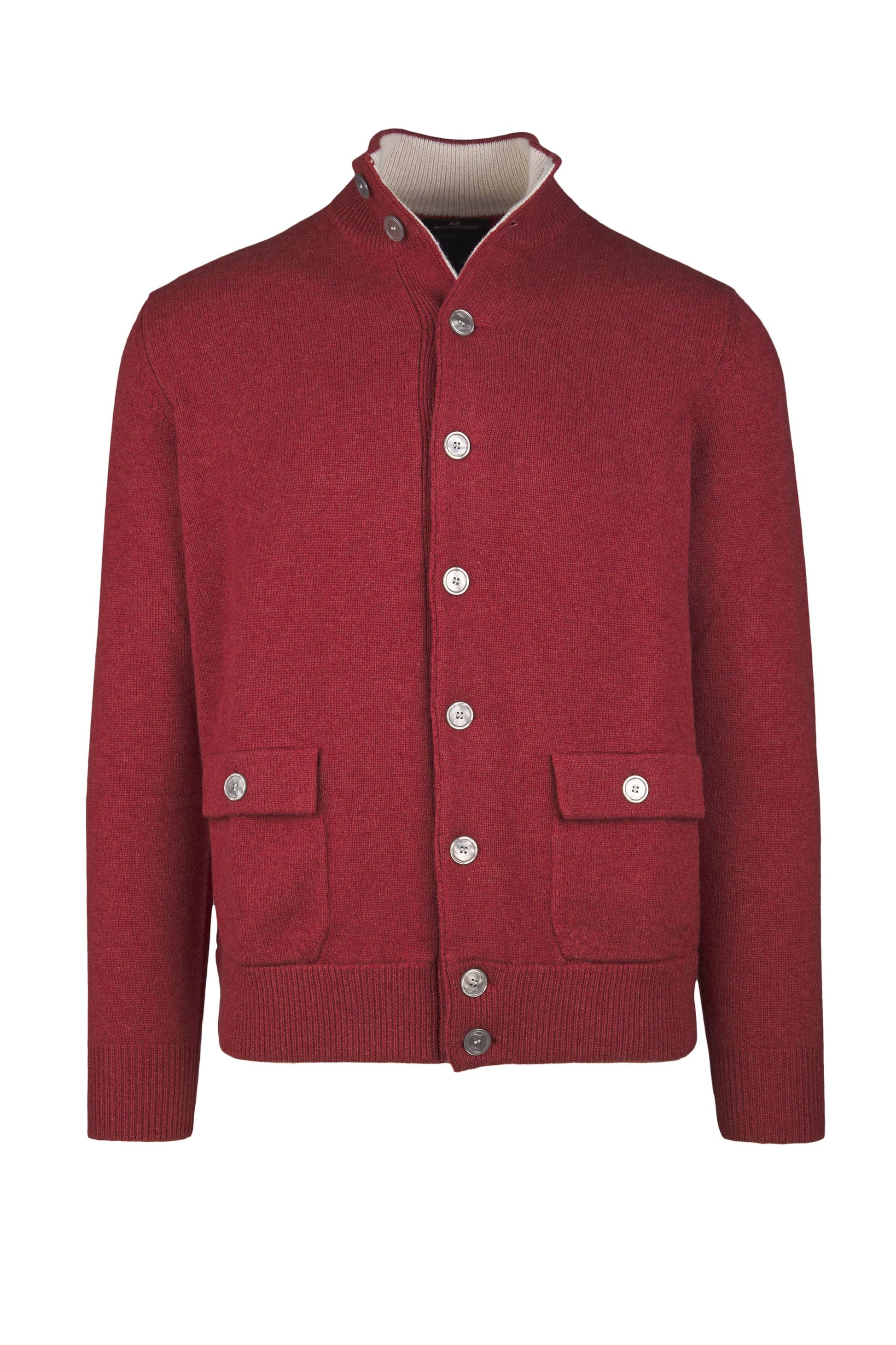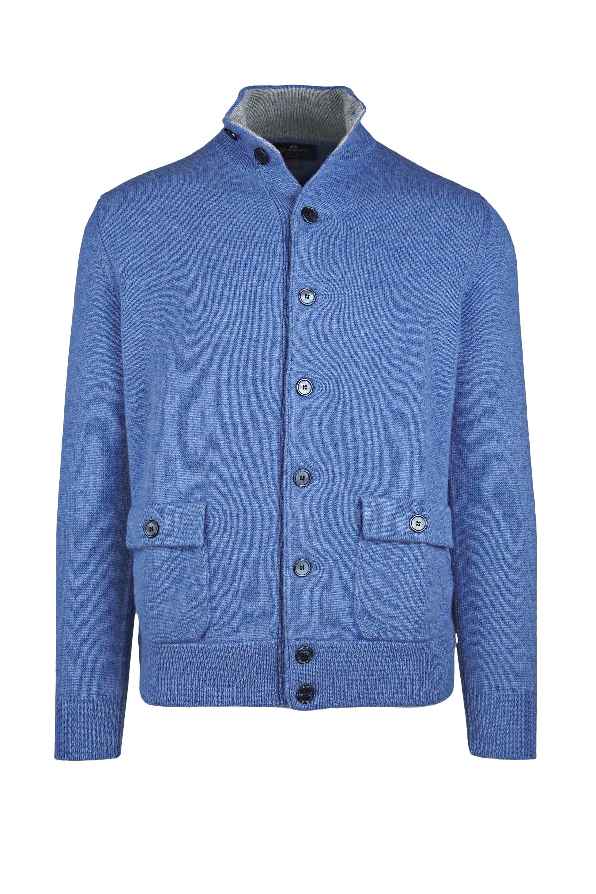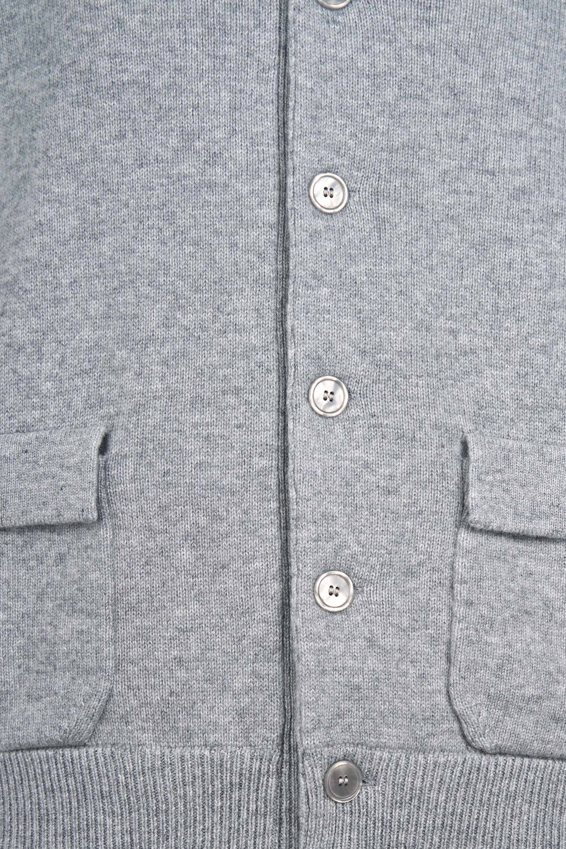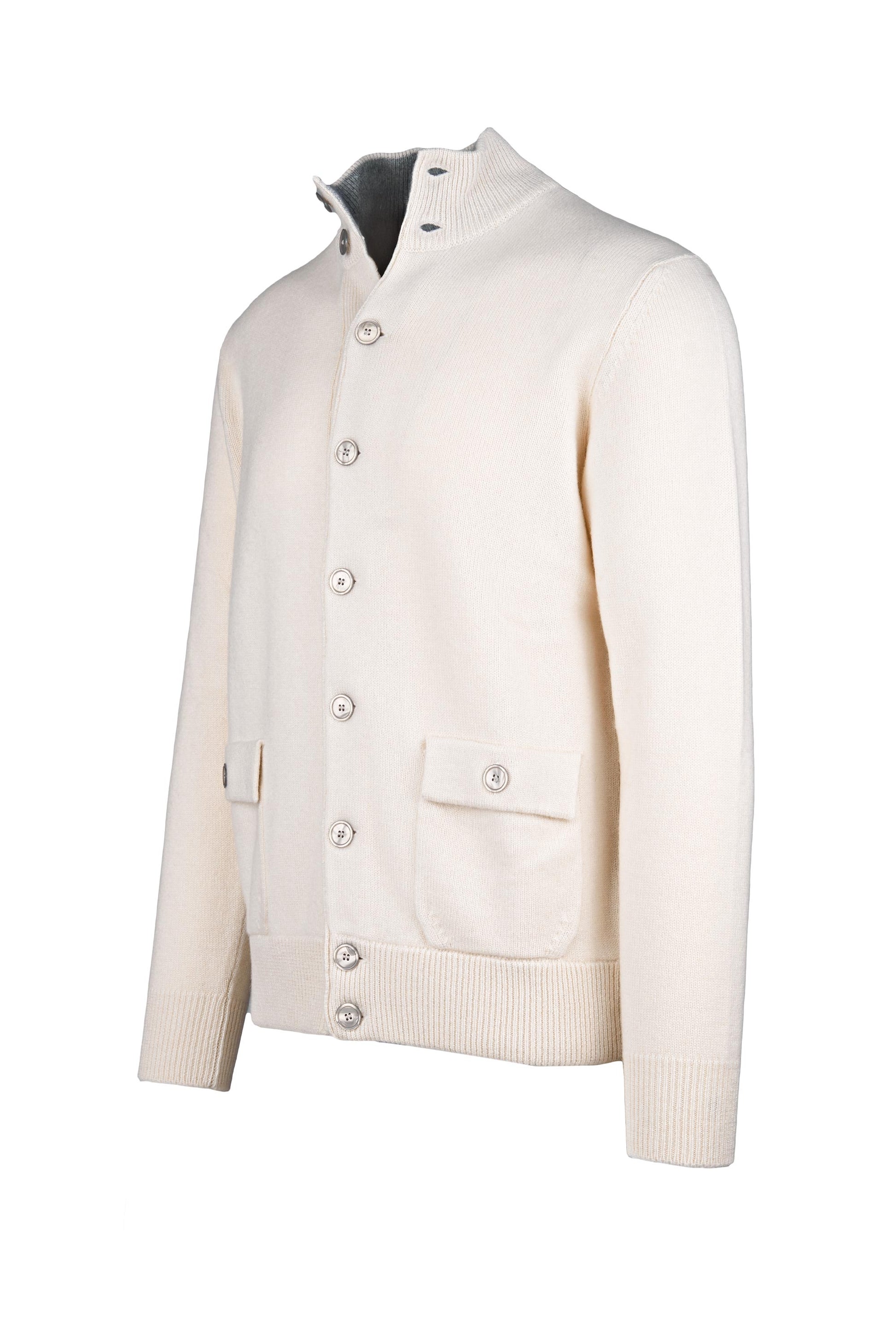 Puro cashmere, mano soffice e calda. Chiusura frontale con 7 bottoni. Collo in maglia a coste con interno a contrasto. Due tasche applicate con patta e bottone. Fondo e polsi a costine.