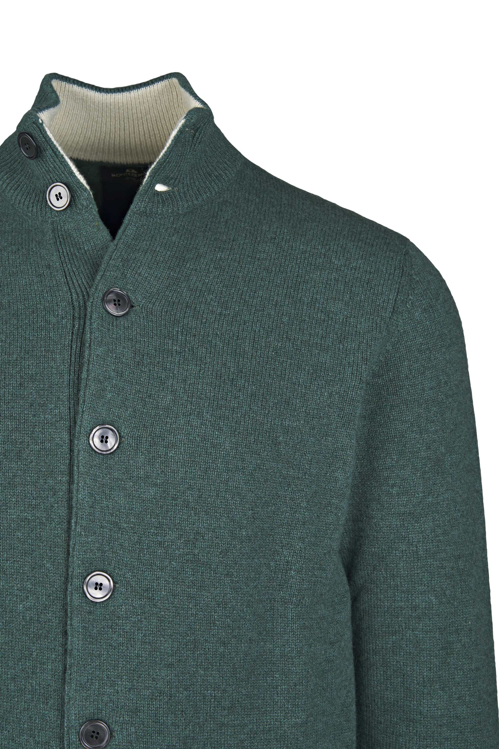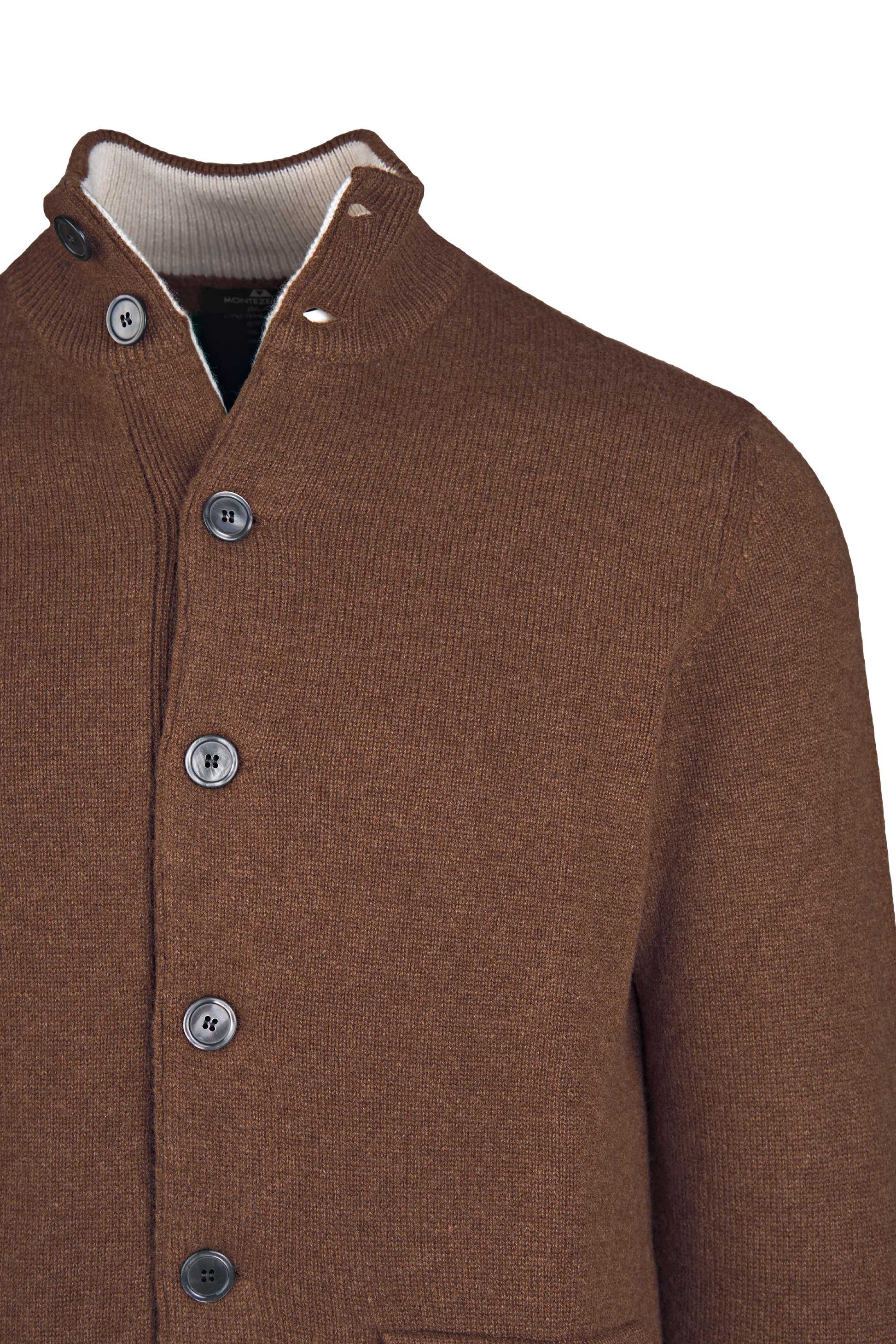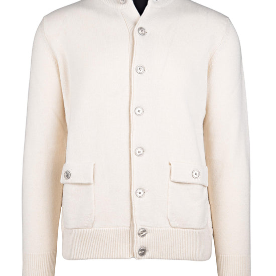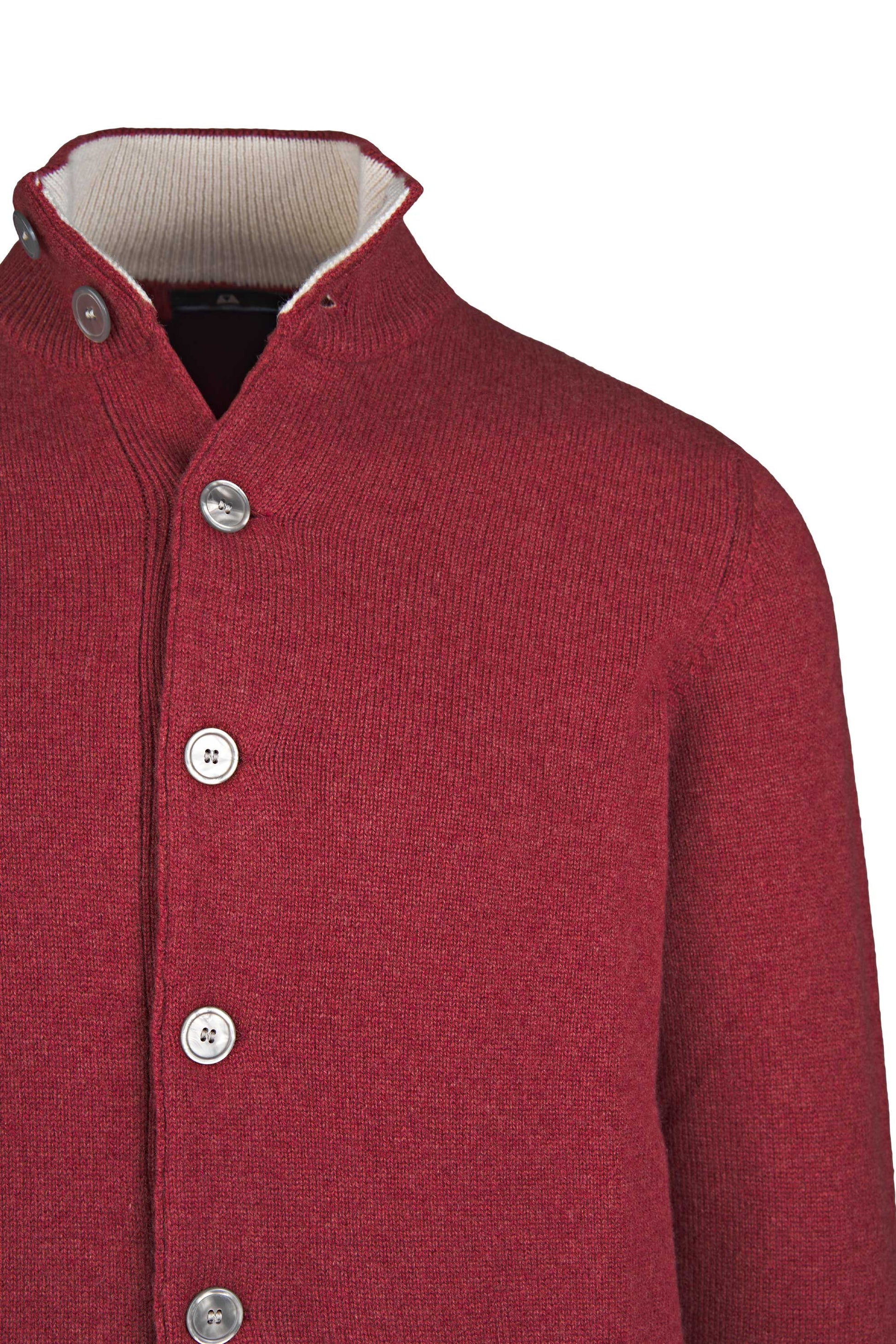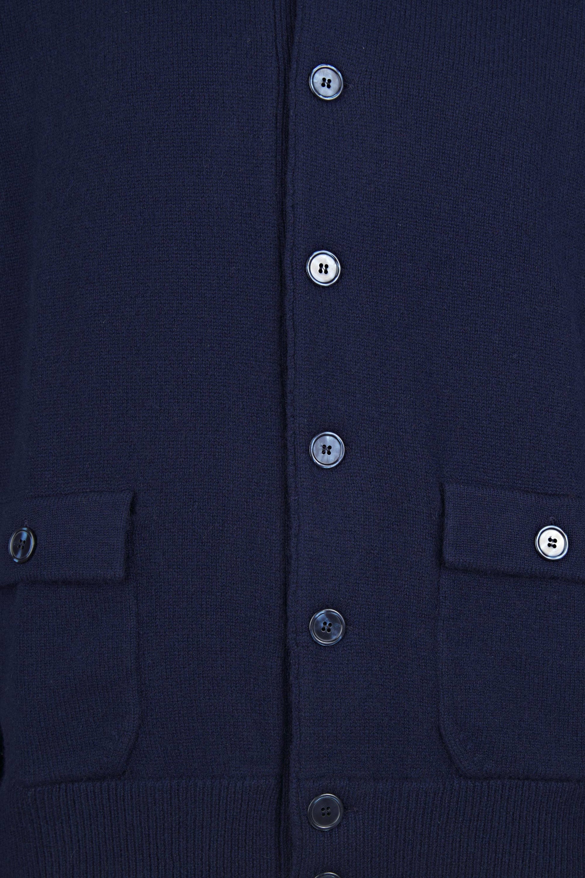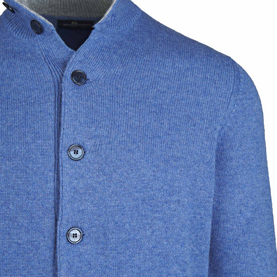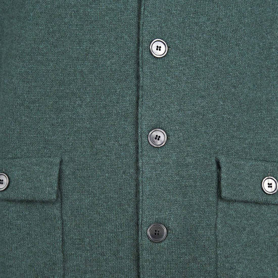Puro cashmere, mano soffice e calda. Chiusura frontale con 7 bottoni. Collo in maglia a coste con interno a contrasto. Due tasche applicate con patta e bottone. Fondo e polsi a costine.