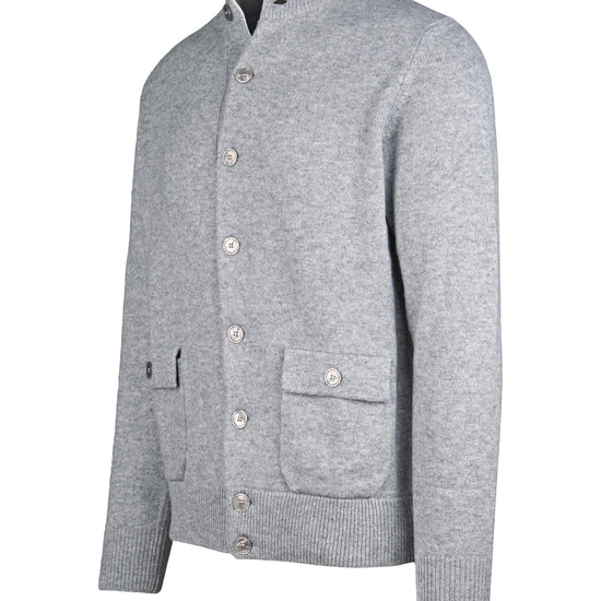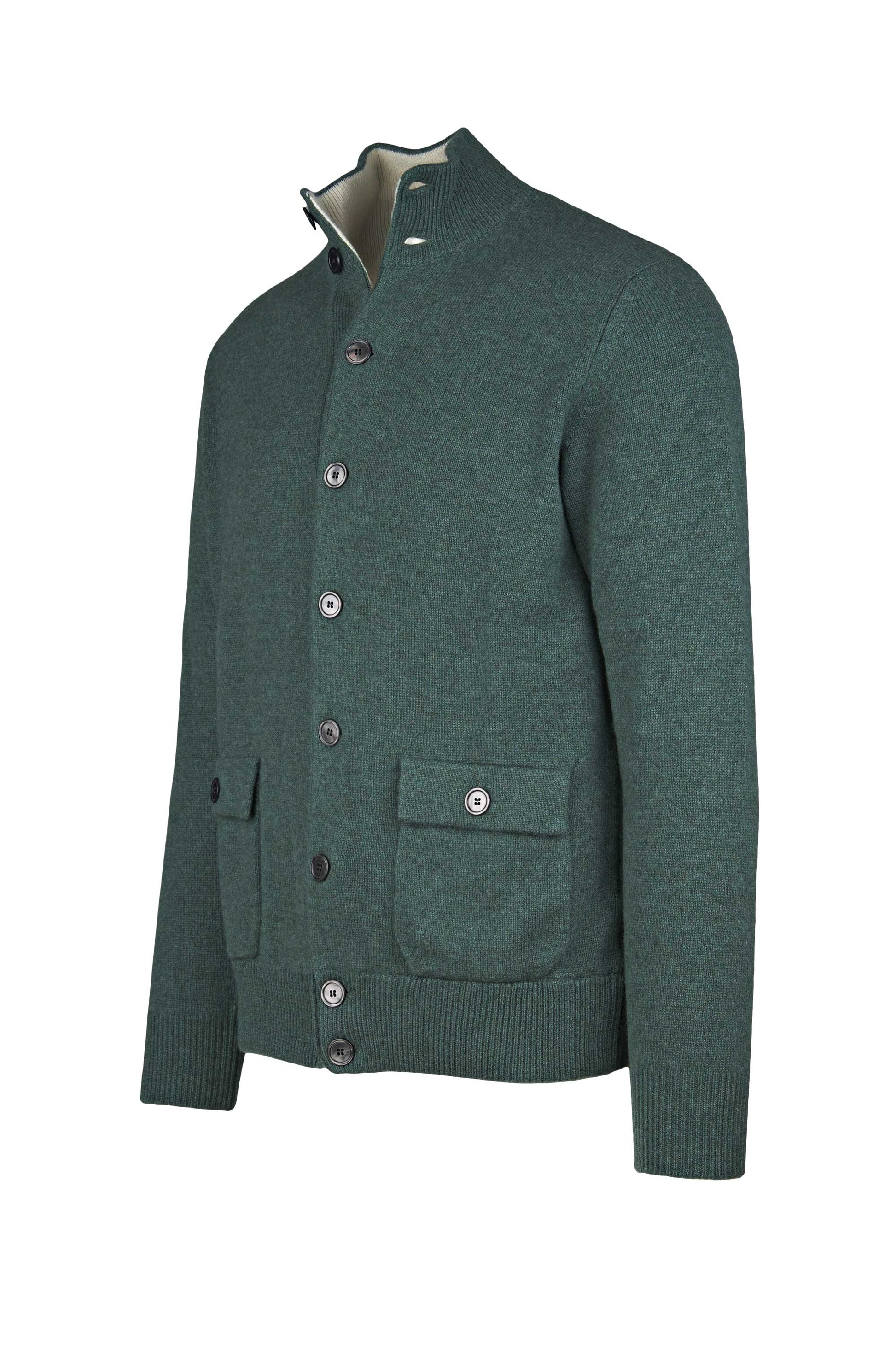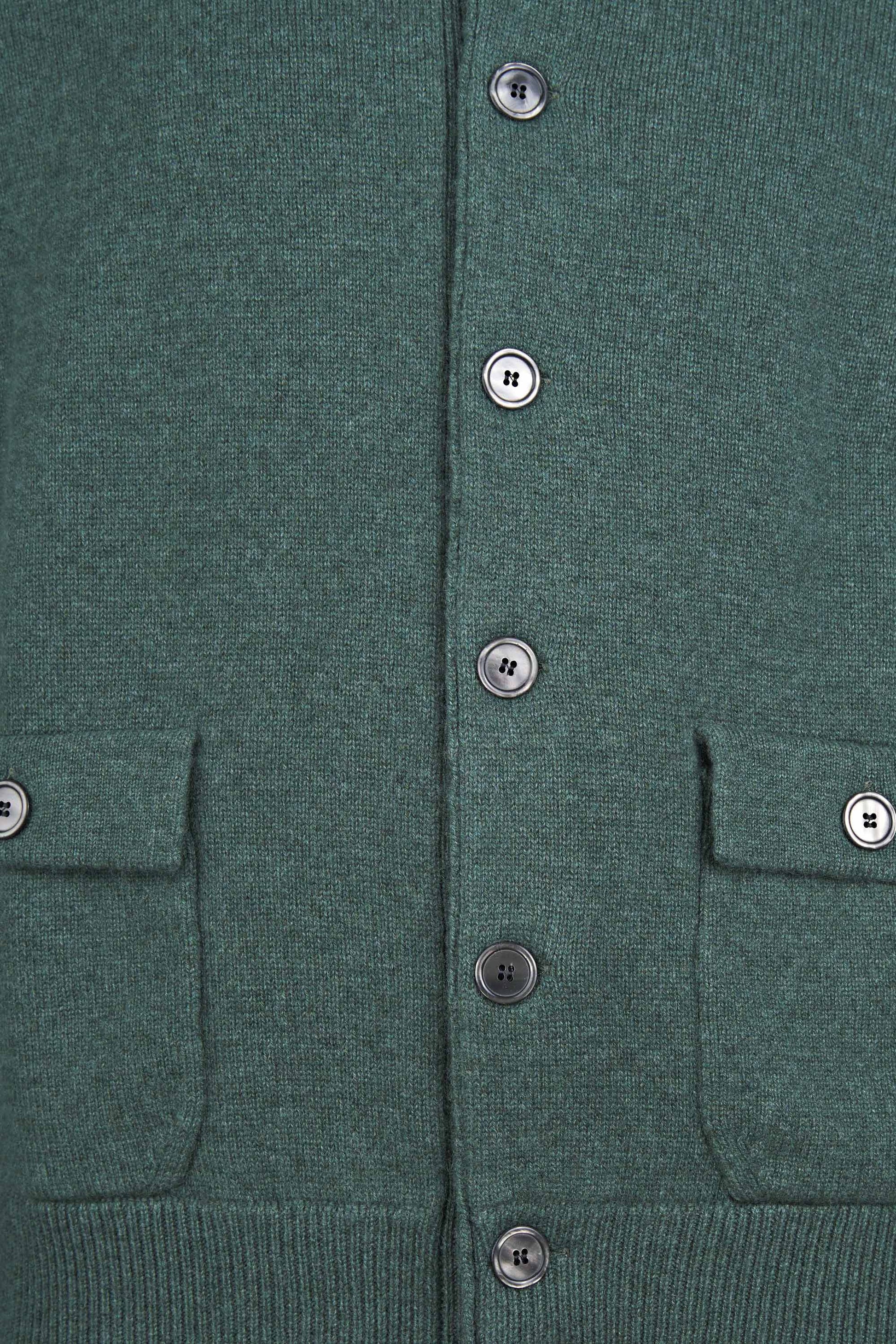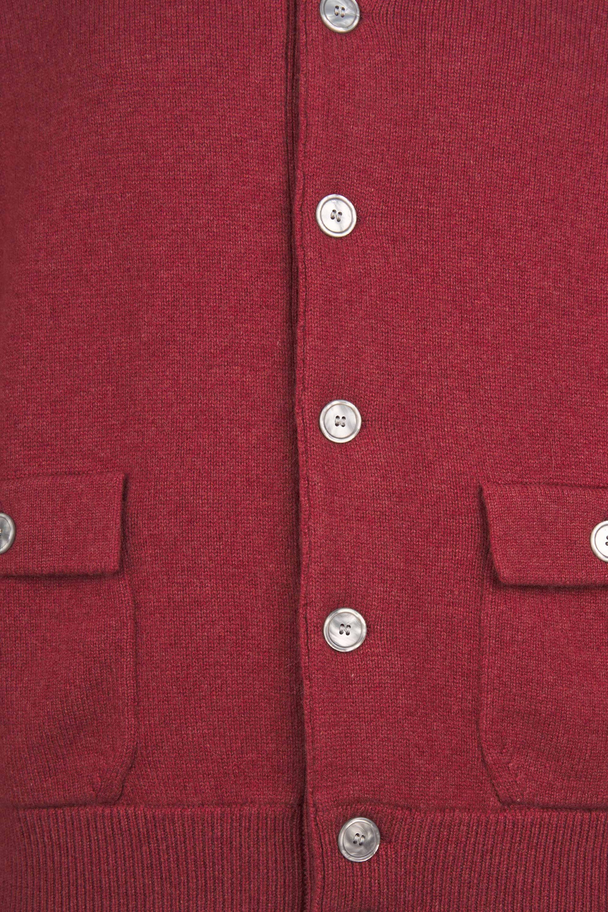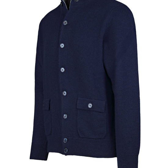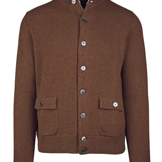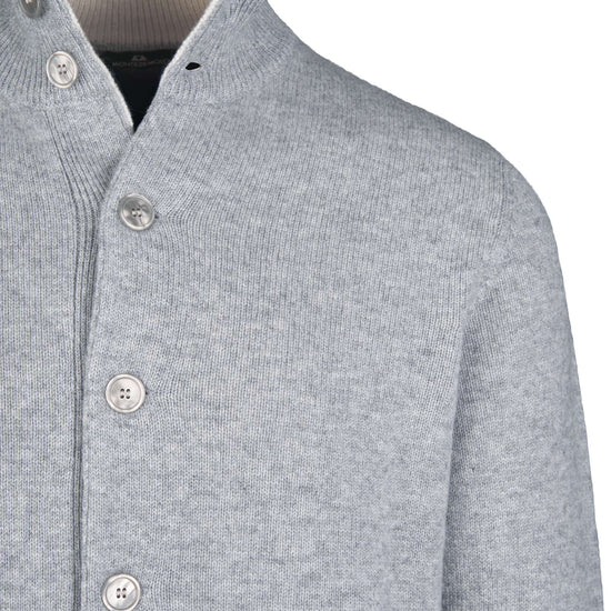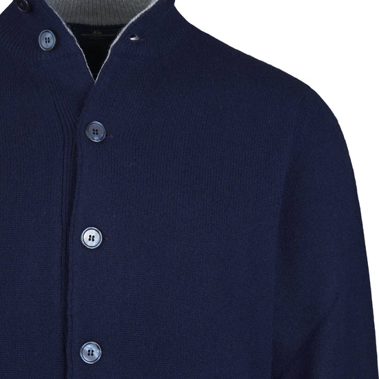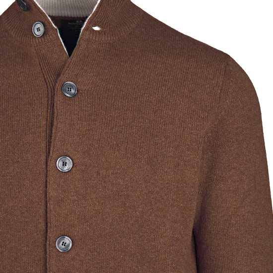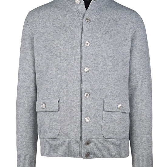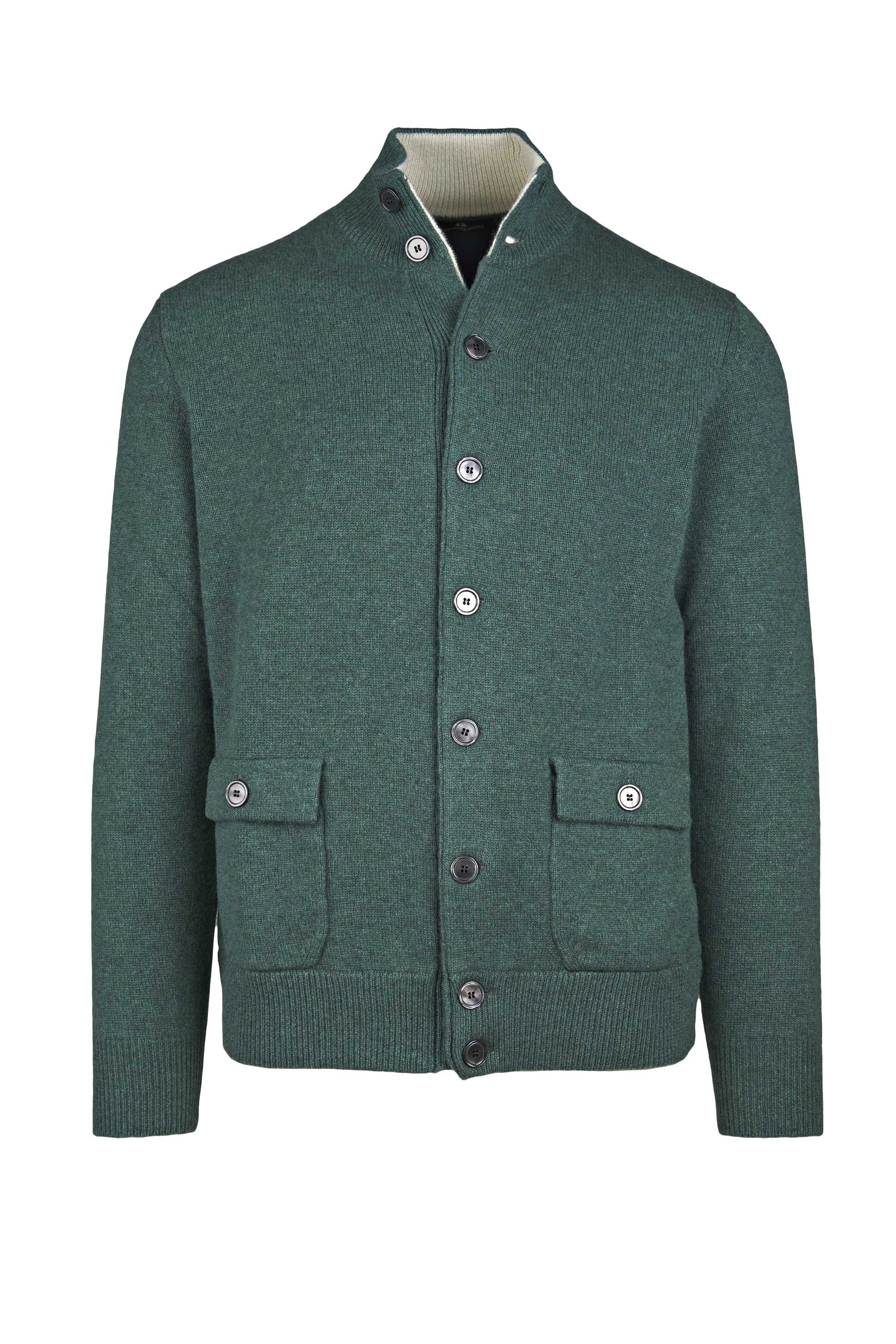 Puro cashmere, mano soffice e calda. Chiusura frontale con 7 bottoni. Collo in maglia a coste con interno a contrasto. Due tasche applicate con patta e bottone. Fondo e polsi a costine.