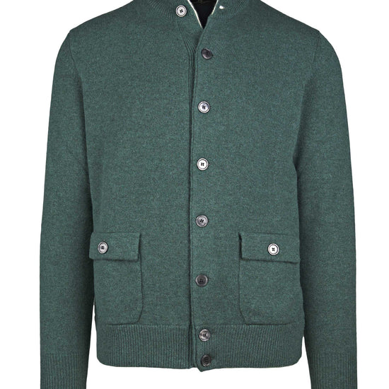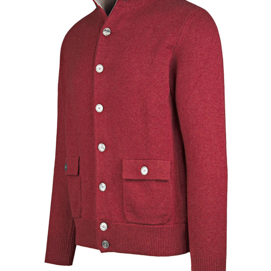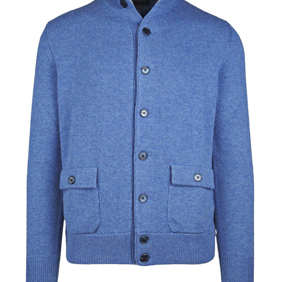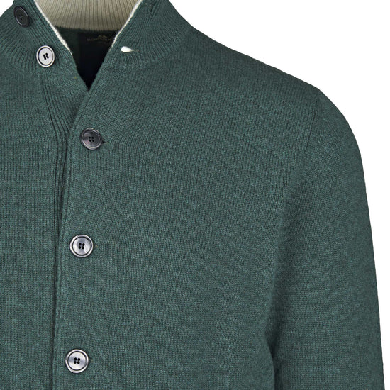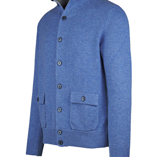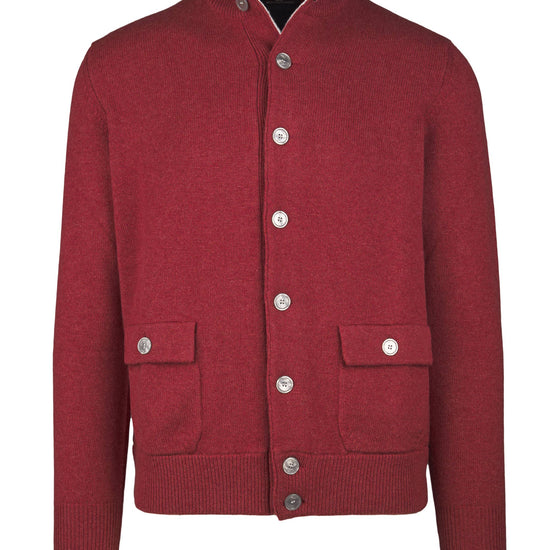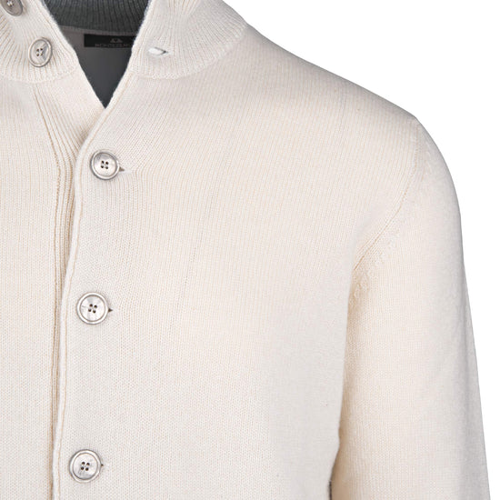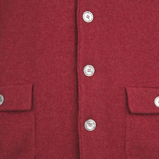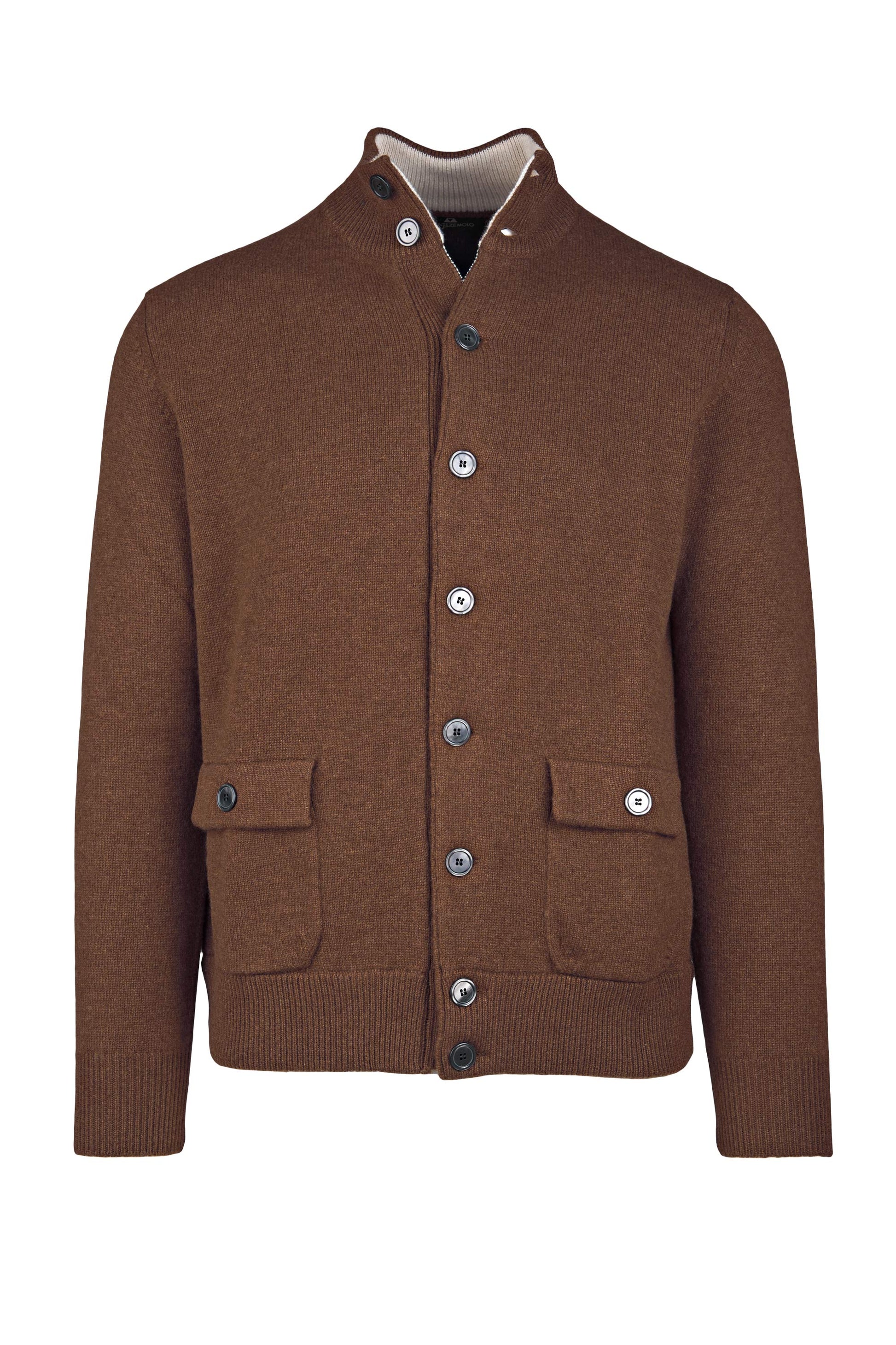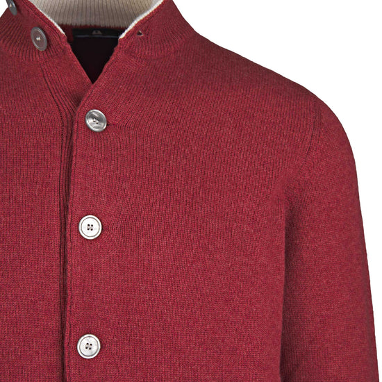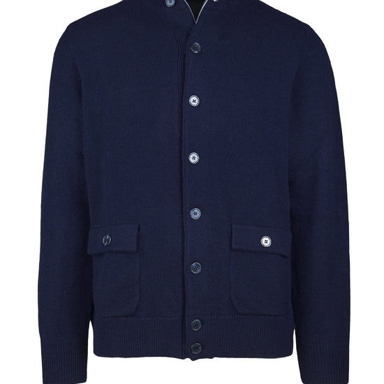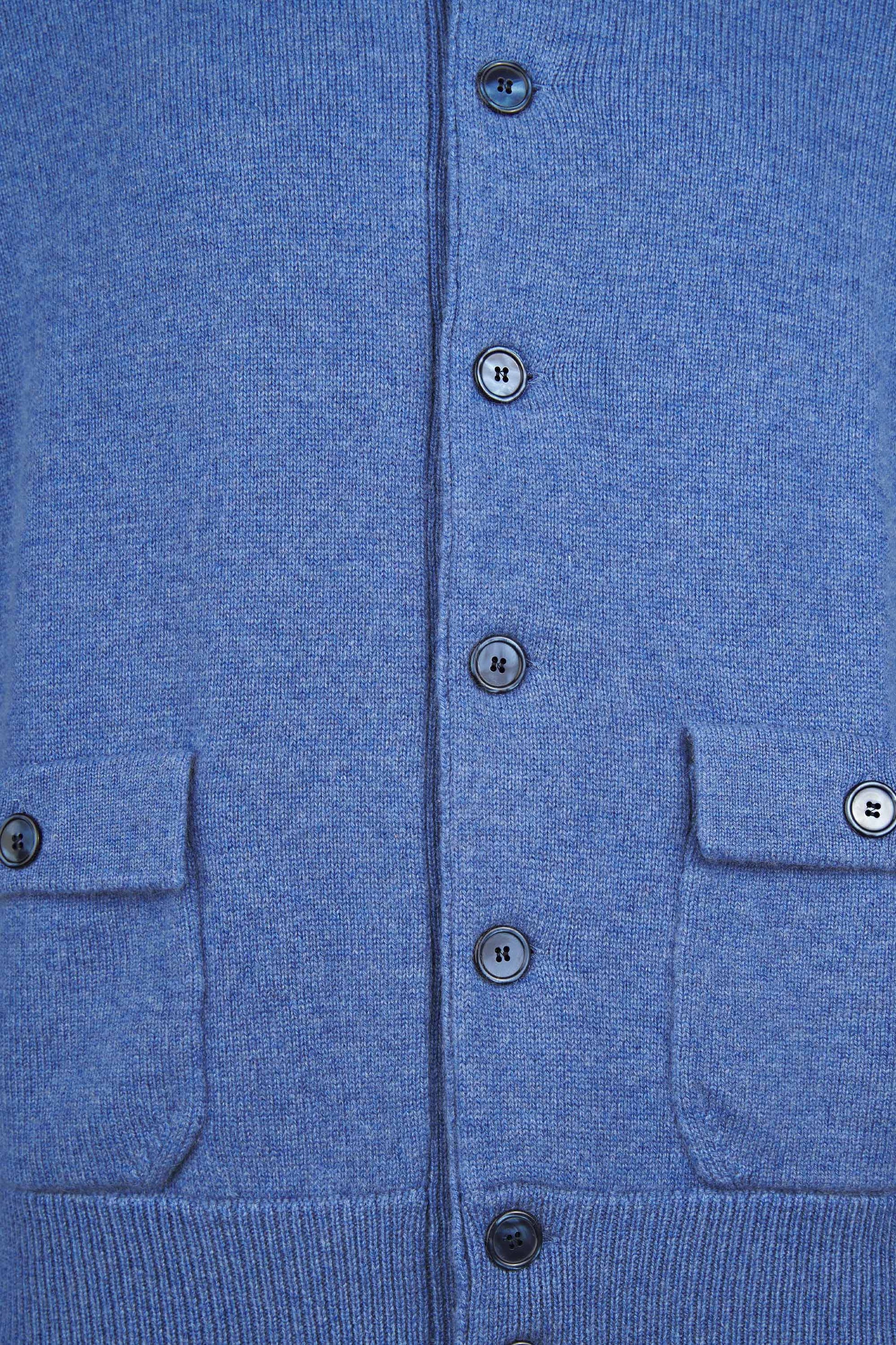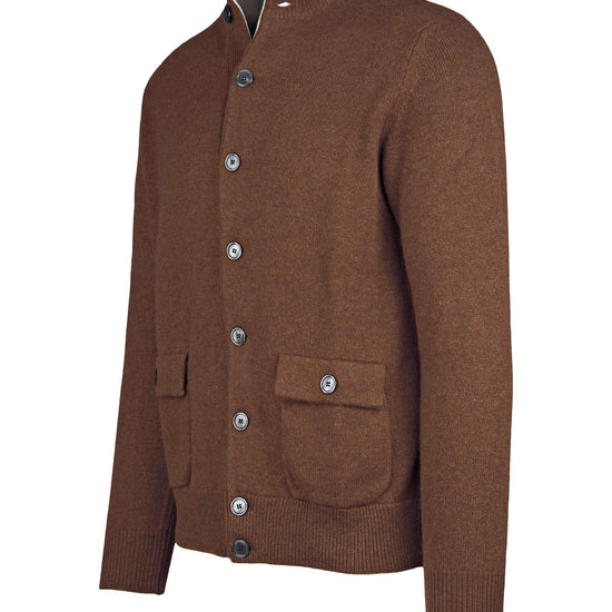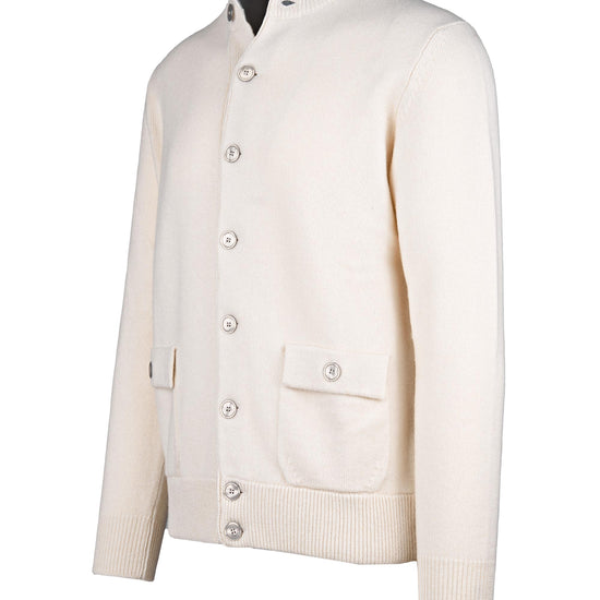 Puro cashmere, mano soffice e calda. Chiusura frontale con 7 bottoni. Collo in maglia a coste con interno a contrasto. Due tasche applicate con patta e bottone. Fondo e polsi a costine.