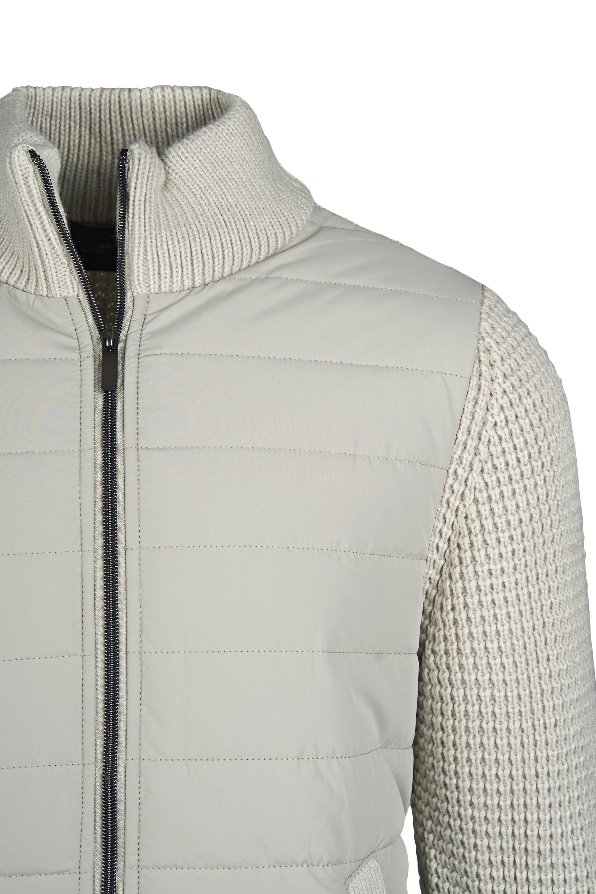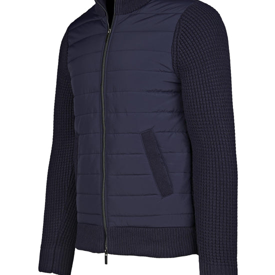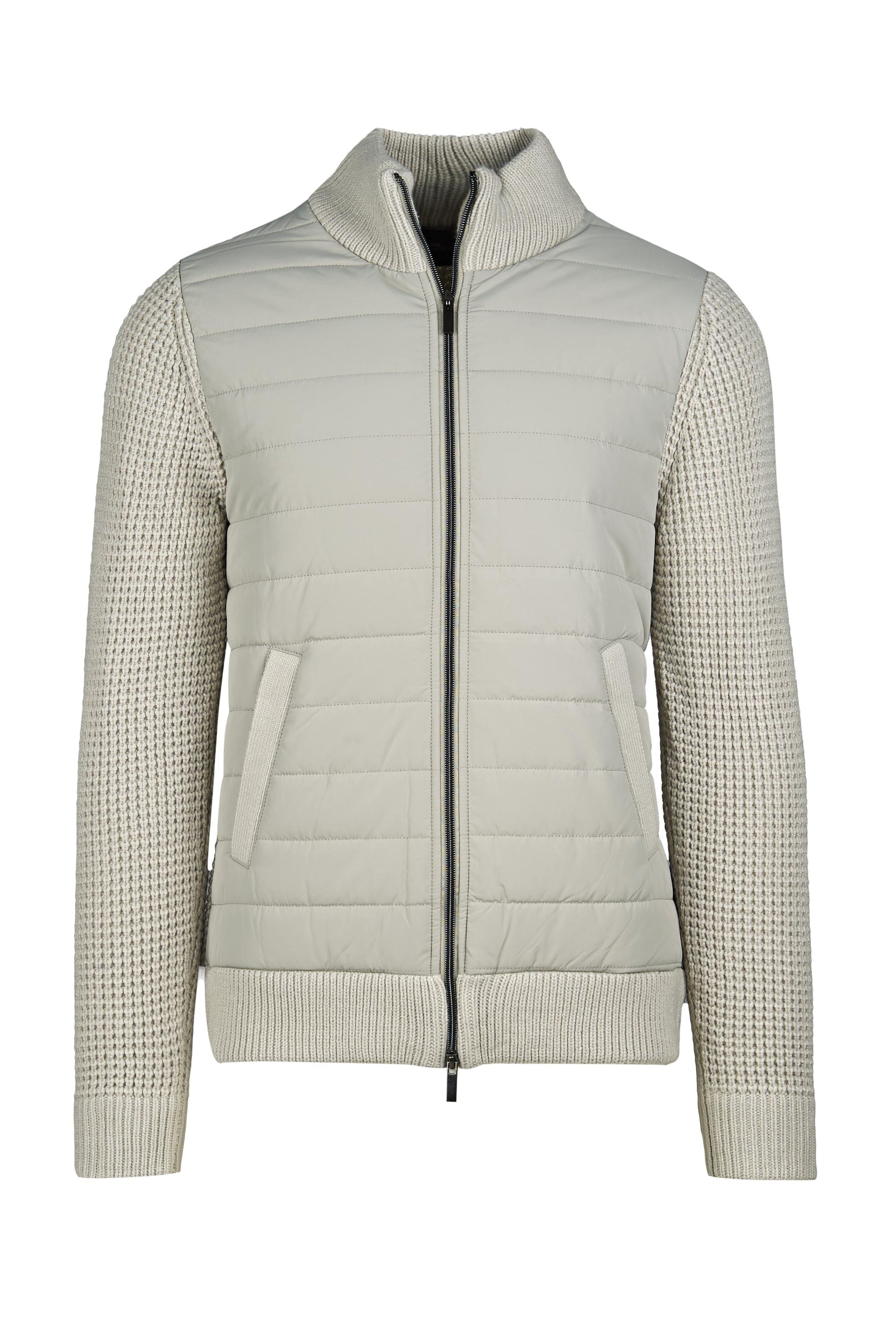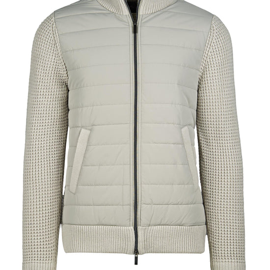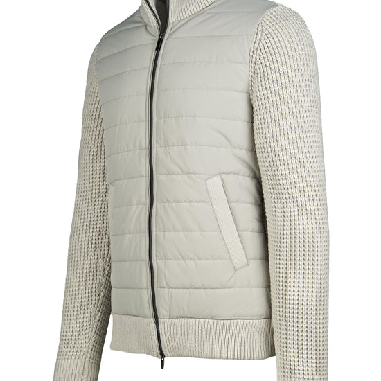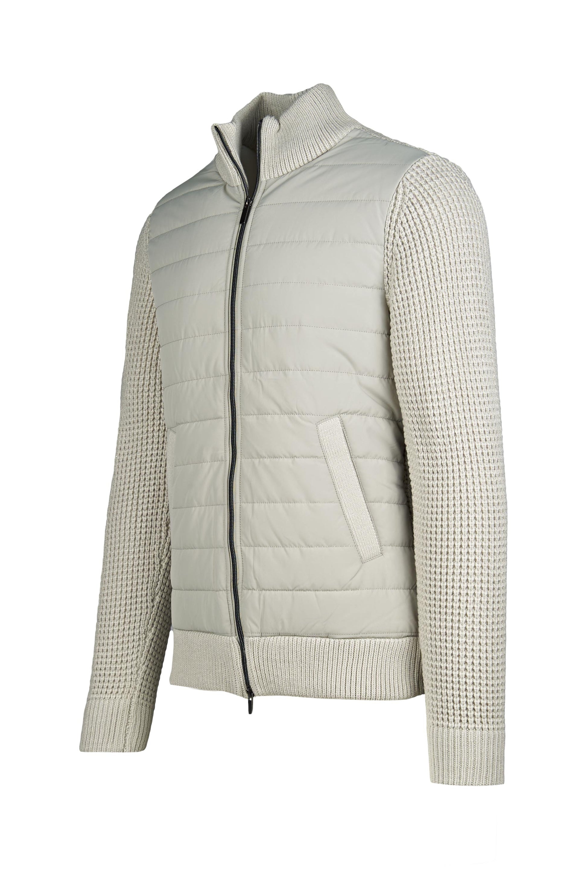 Corpo in nylon trapuntato a canali orizzontali; imbottitura leggera e termica; maniche e collo in maglia punto waffle; zip centrale in metallo; tasche a filetto inclinate con nastratura; fondo e polsi in costina elastica