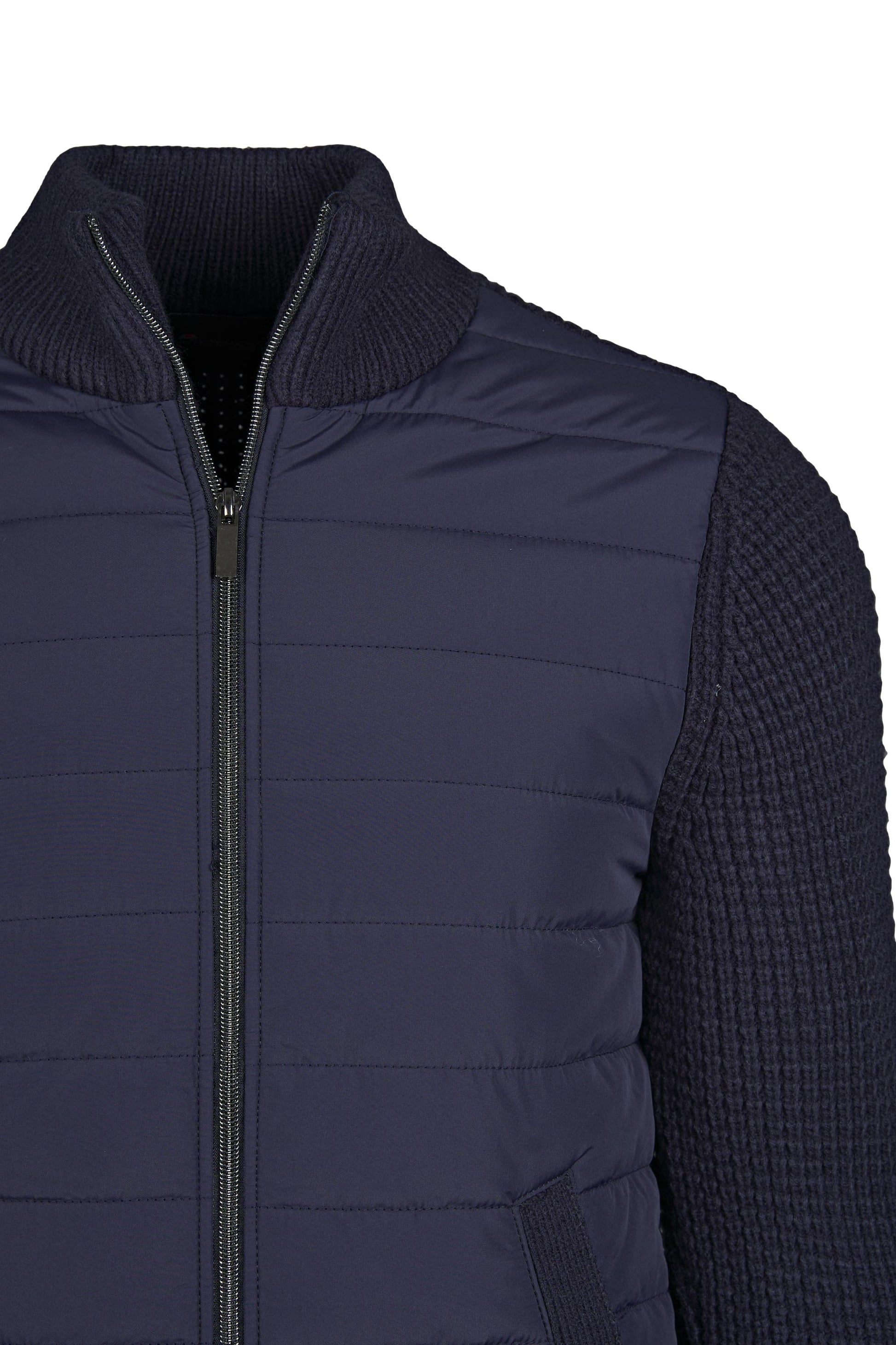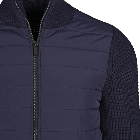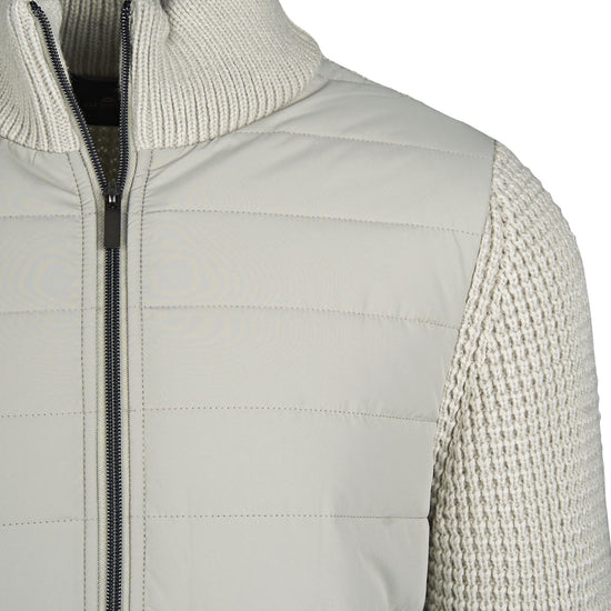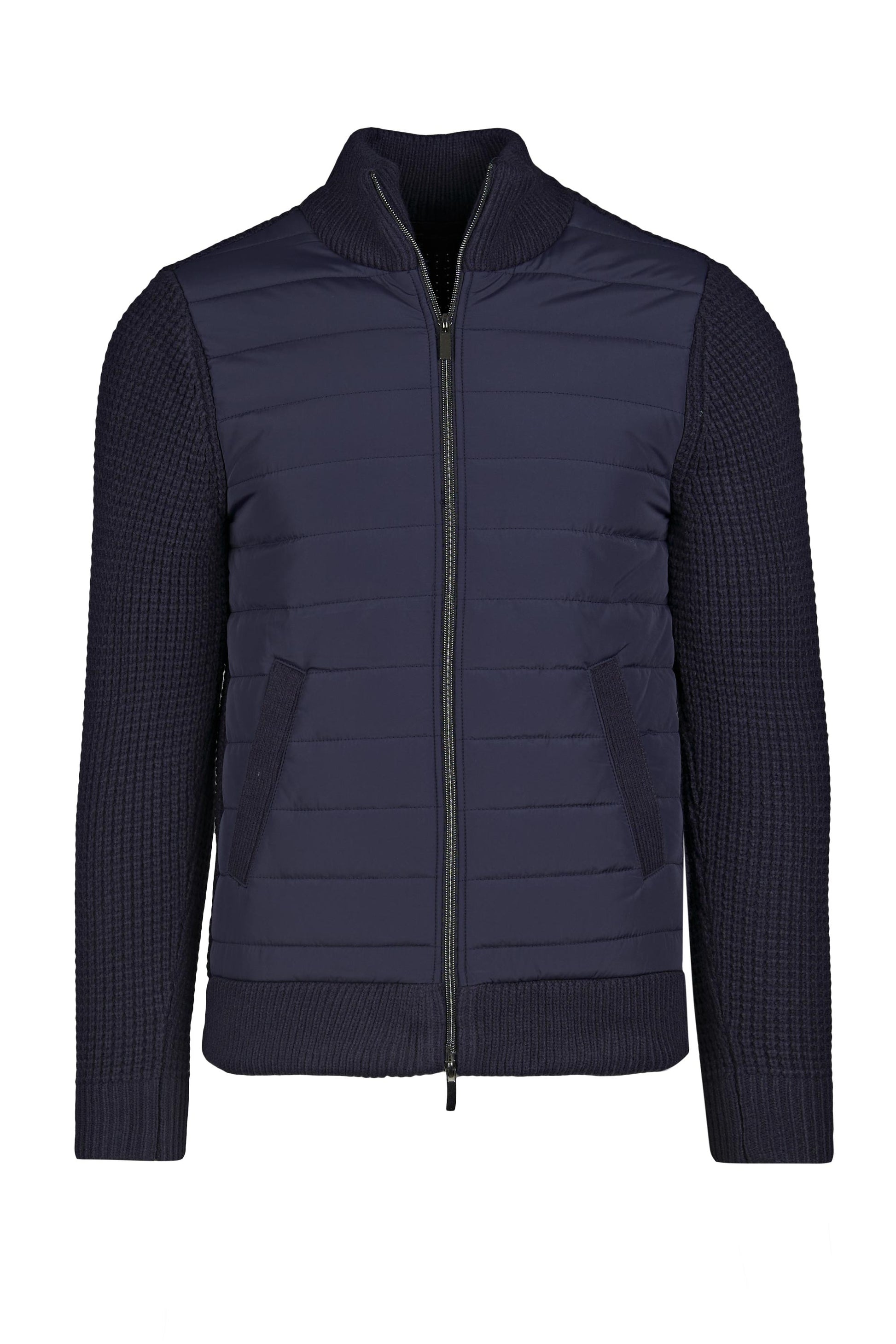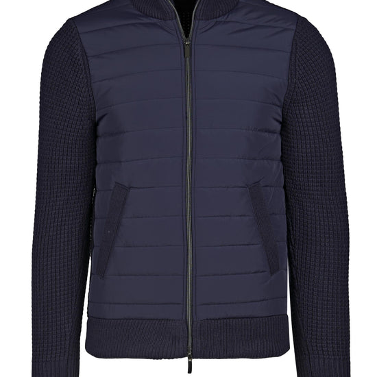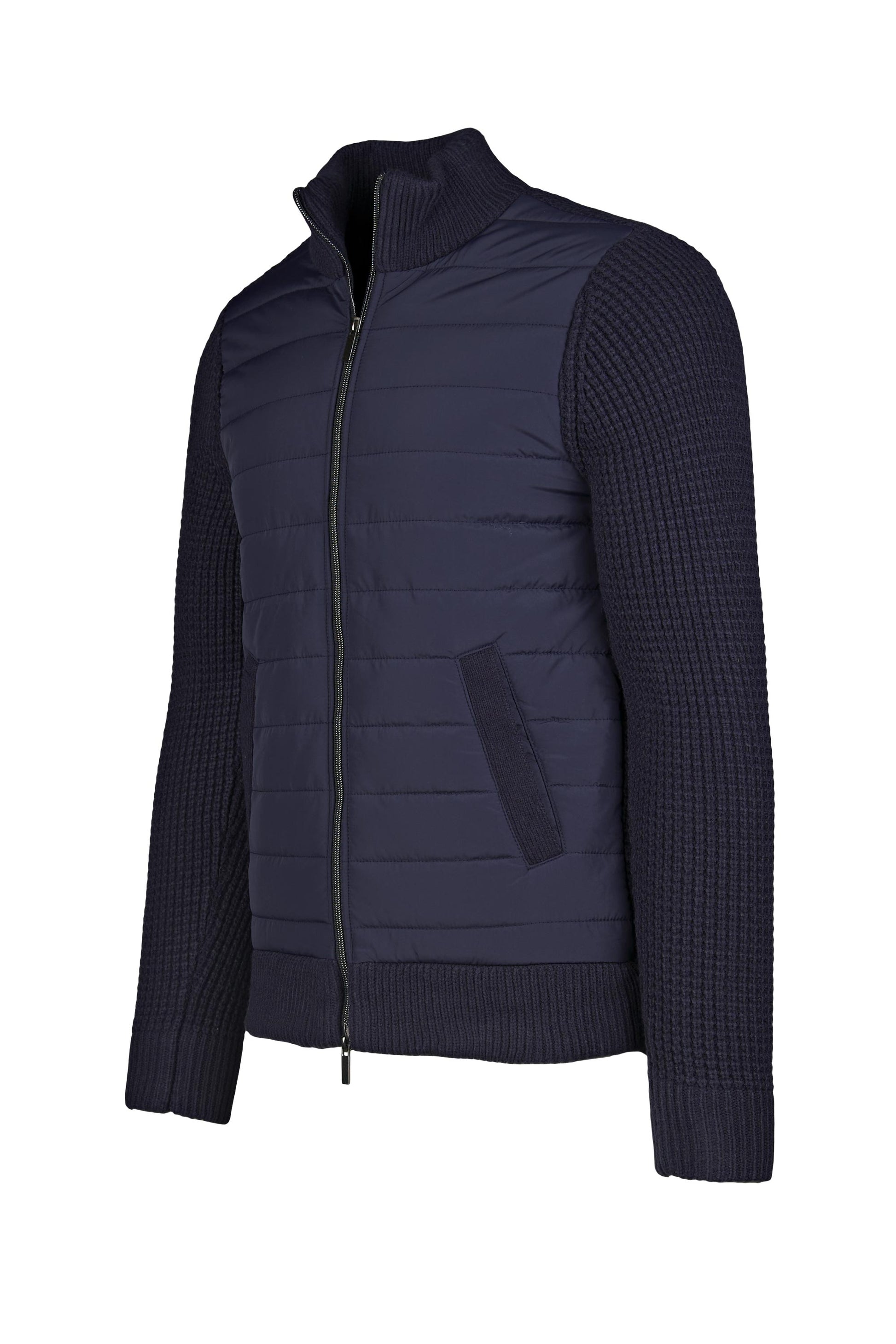 Corpo in nylon trapuntato a canali orizzontali; imbottitura leggera e termica; maniche e collo in maglia punto waffle; zip centrale in metallo; tasche a filetto inclinate con nastratura; fondo e polsi in costina elastica