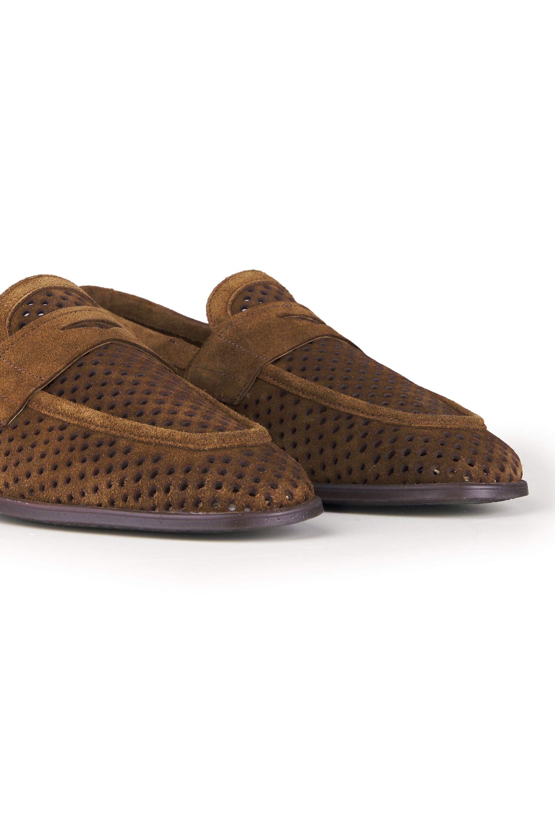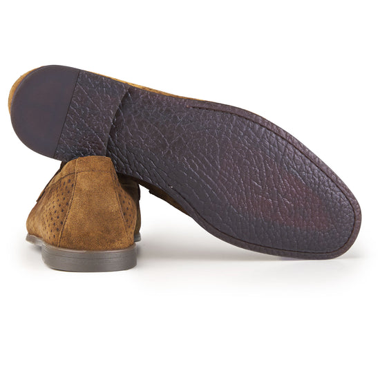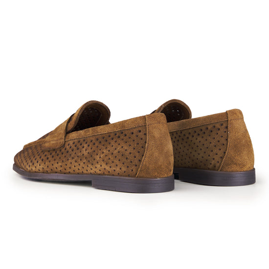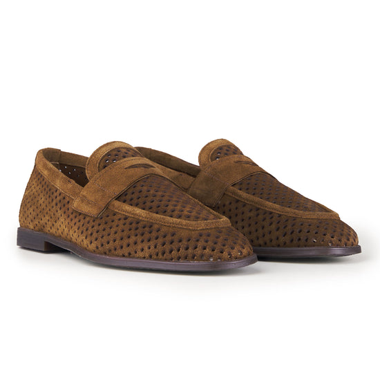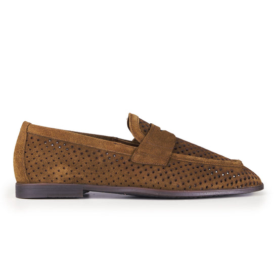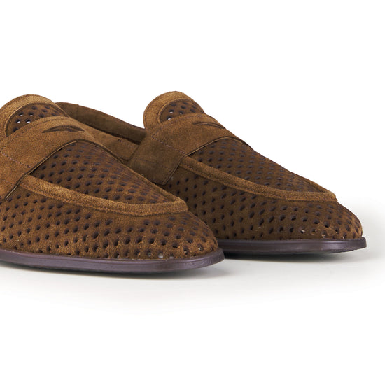 Mocassino realizzato in pelle scamosciata di alta qualità, caratterizzato da una perforatura diffusa che ne esalta leggerezza, traspirabilità e comfort durante l’utilizzo nelle stagioni più calde. La tomaia presenta una lavorazione pulita e precisa, con mascherina frontale integrata che richiama l’estetica classica del penny loafer reinterpretata in chiave contemporanea. La costruzione è pensata per offrire una calzata equilibrata e naturale, con una struttura flessibile che accompagna il movimento del piede senza costrizioni. Il tallone rinforzato garantisce stabilità, mentre il profilo basso e affusolato rende il modello estremamente versatile, adatto sia a contesti formali rilassati sia ad abbinamenti più informali. La suola sottile assicura un appoggio stabile e una camminata fluida, mantenendo un aspetto elegante e leggero. Un mocassino progettato per unire stile, comfort e funzionalità, ideale per un utilizzo quotidiano raffinato.