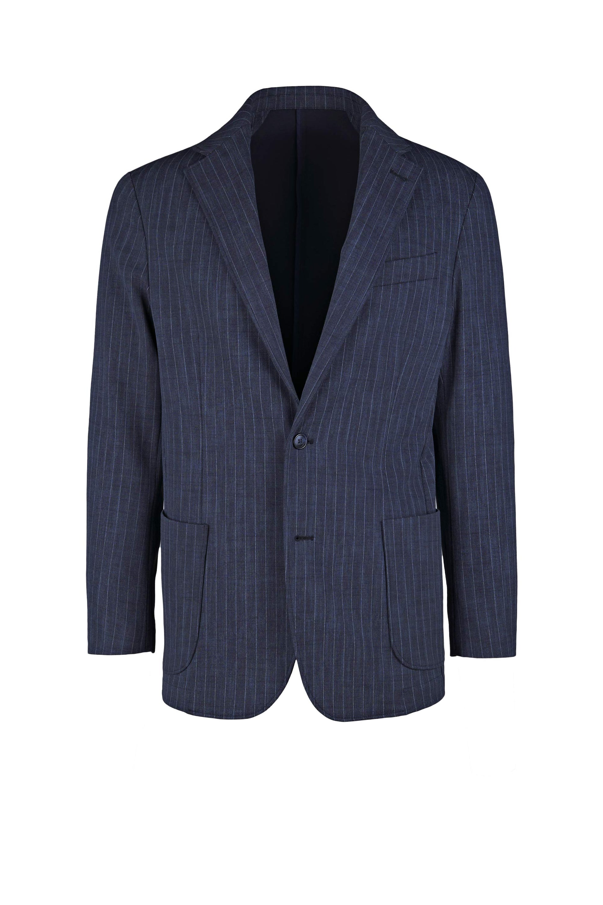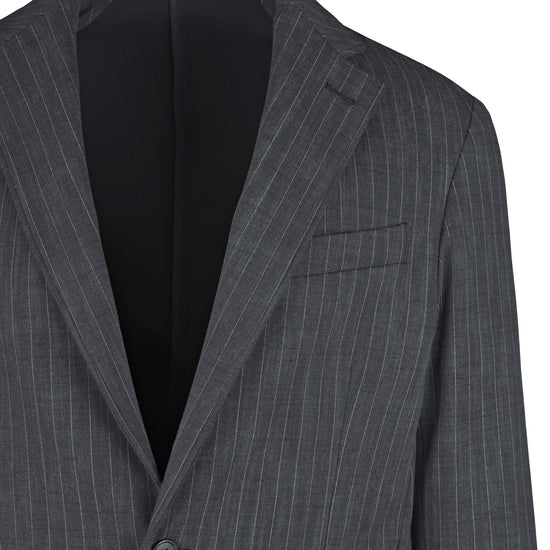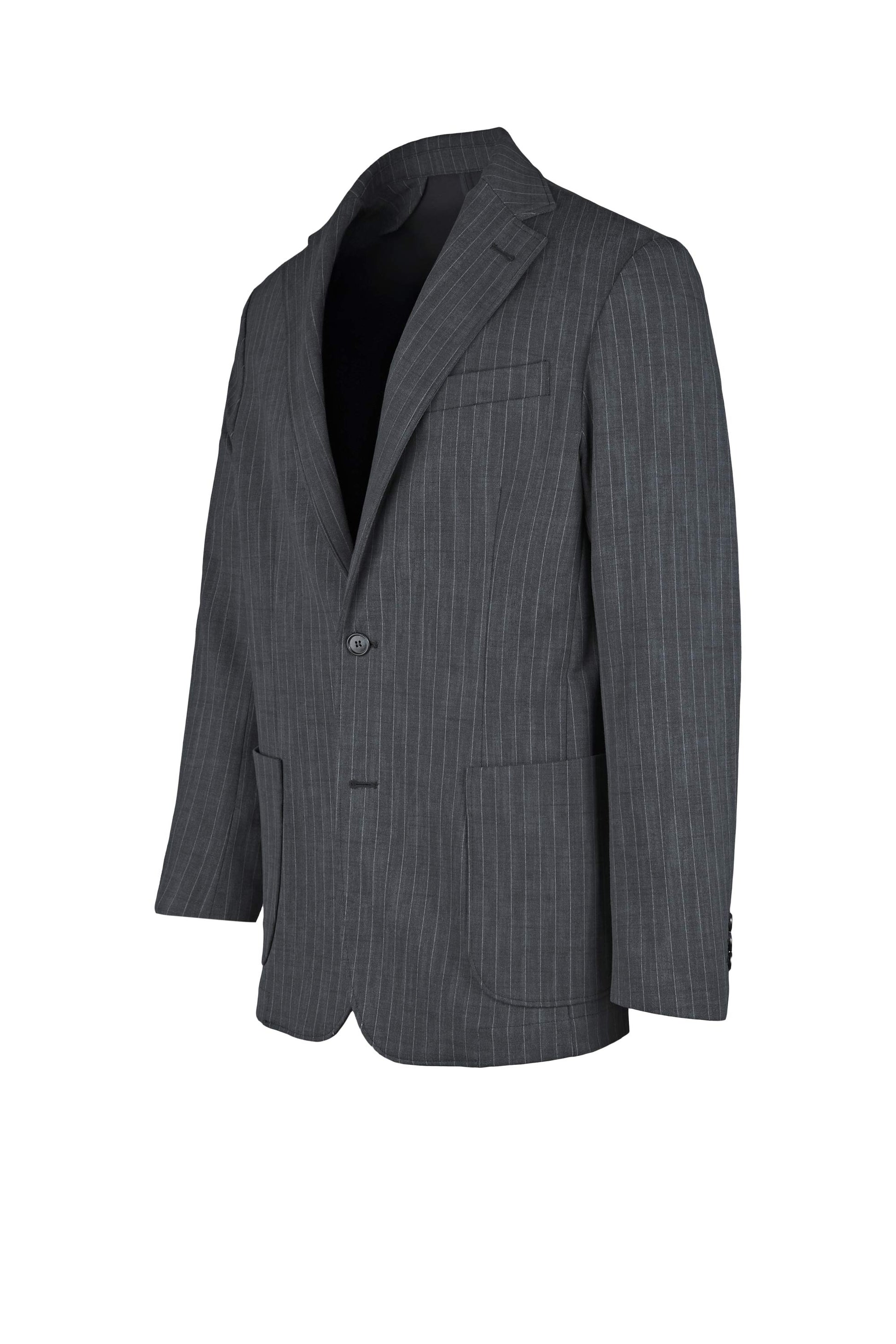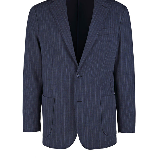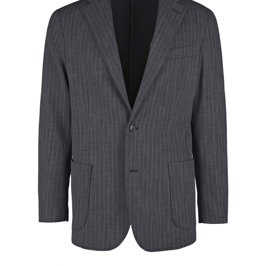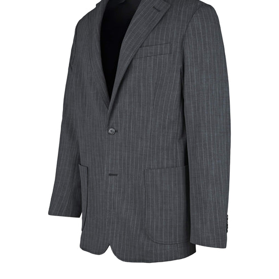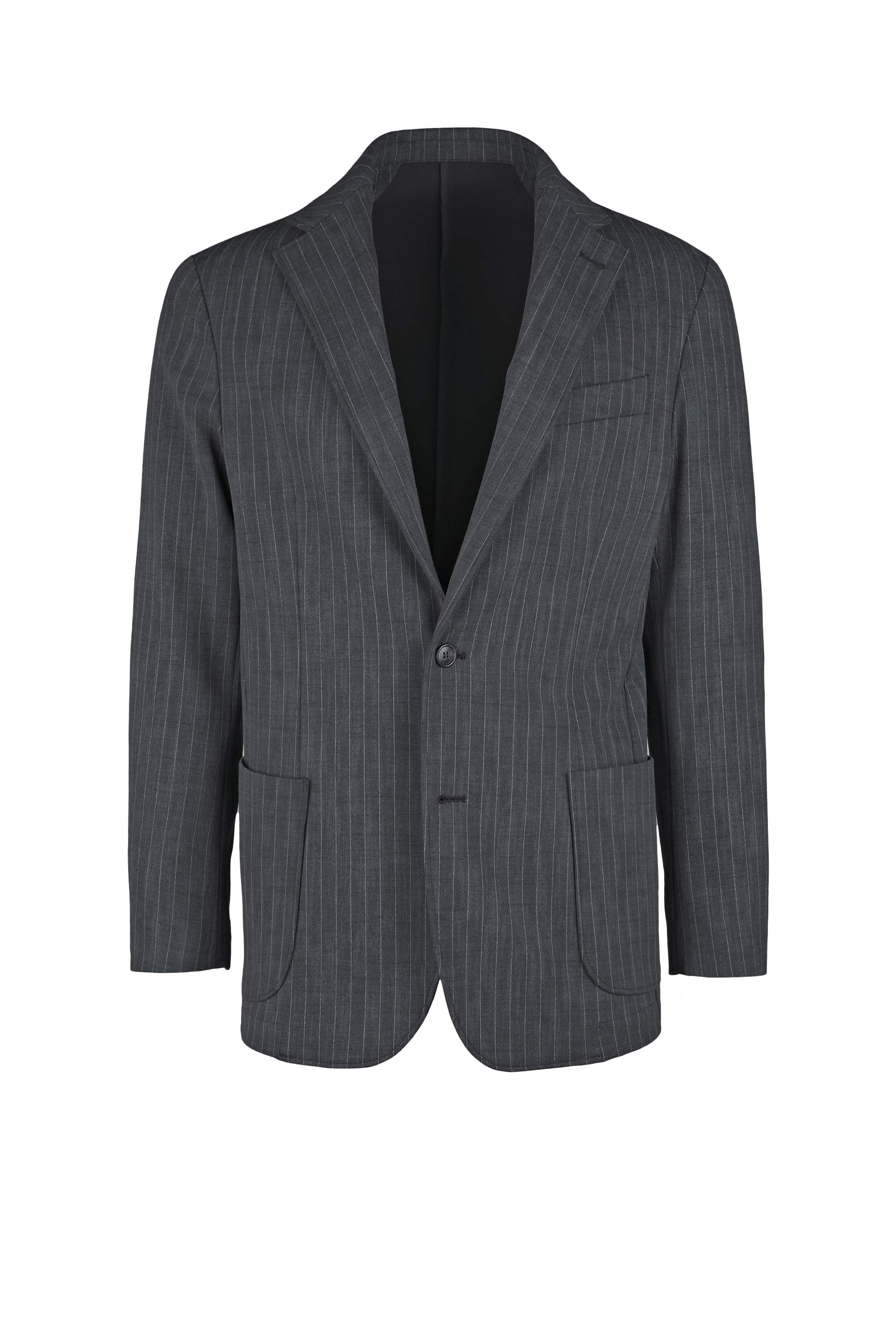 Monopetto con chiusura a 2 bottoni; rever classico a denti con asola; costruzione leggera/sfoderata per maggiore comfort; spalla naturale senza eccessiva imbottitura; tasche applicate a toppa con angoli arrotondati; taschino a filetto sul petto; fondo e profili stondati con ribattiture pulite; jersey compatto gessato, elasticizzato e anti-piega.