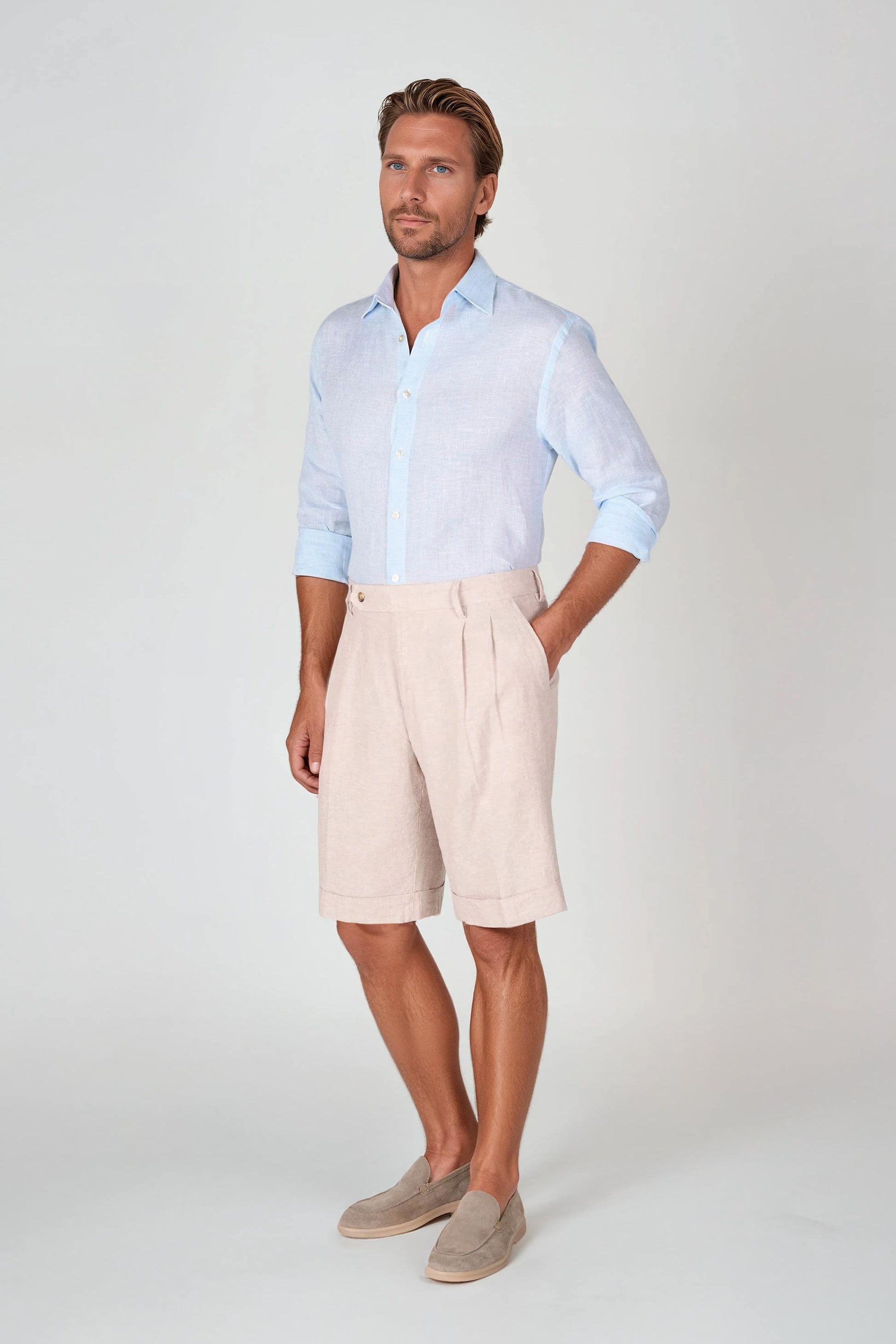 Puro lino, motivo pied-de-poule, traspirante, colletto classico, polsini con bottoni, orlo arrotondato, vestibilità regolare