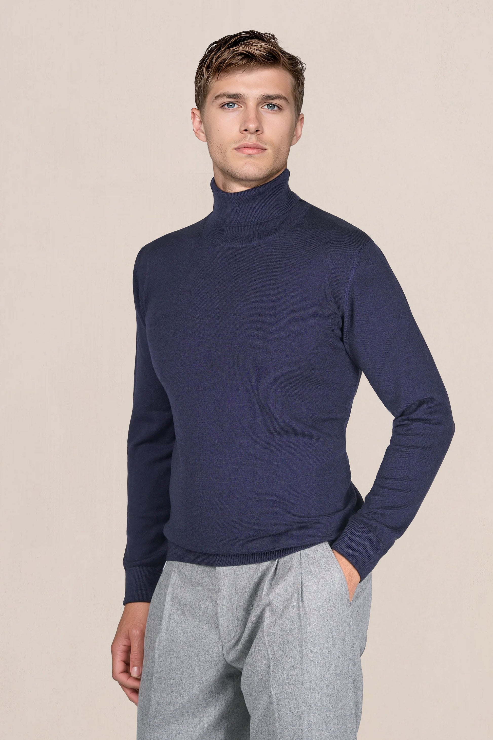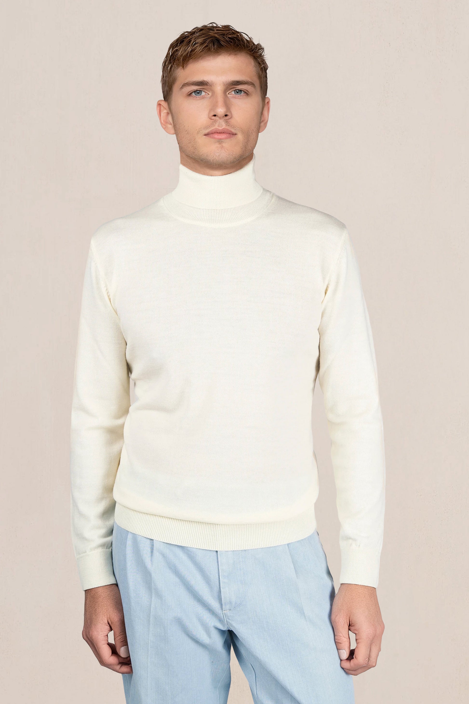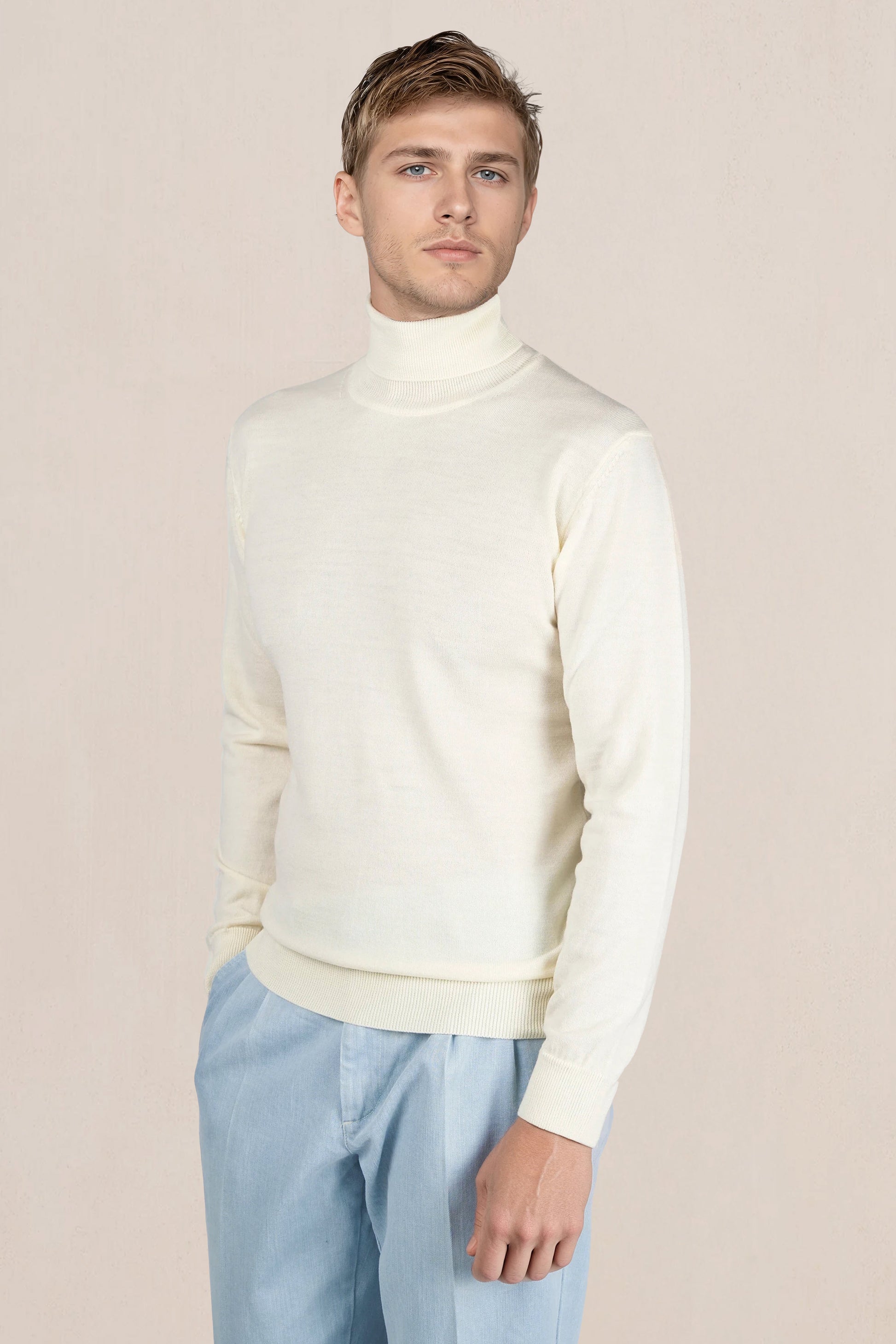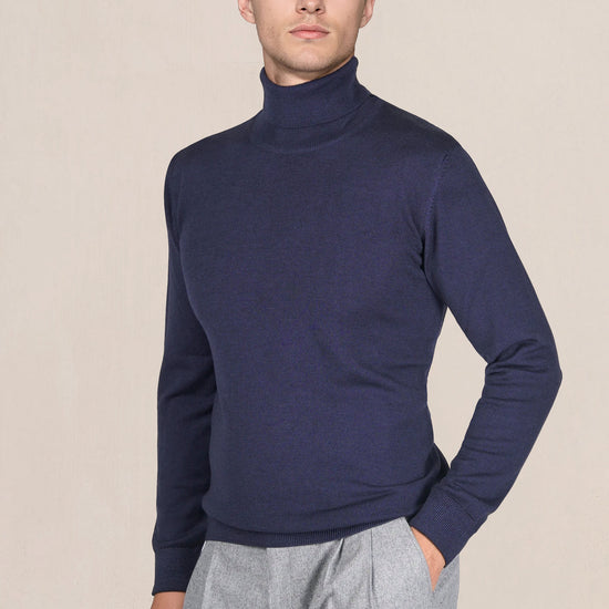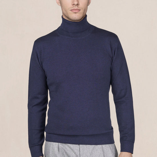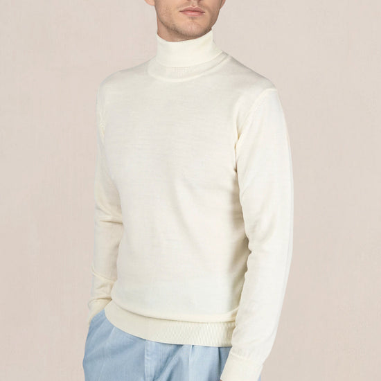 Lana merino extrafine; jersey compatto a maglia fine; collo alto a doppio strato; polsini e orlo a coste; costruzione completamente modellata con cuciture piatte; mano morbida
