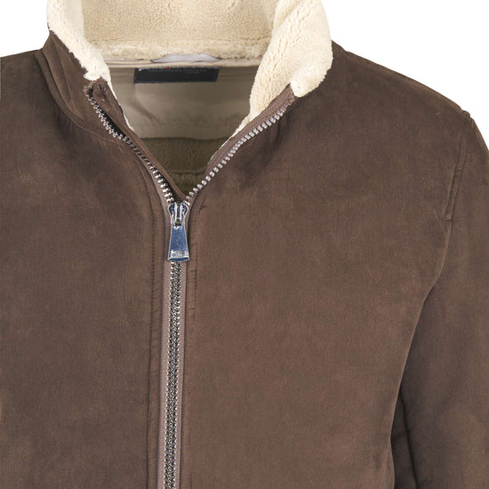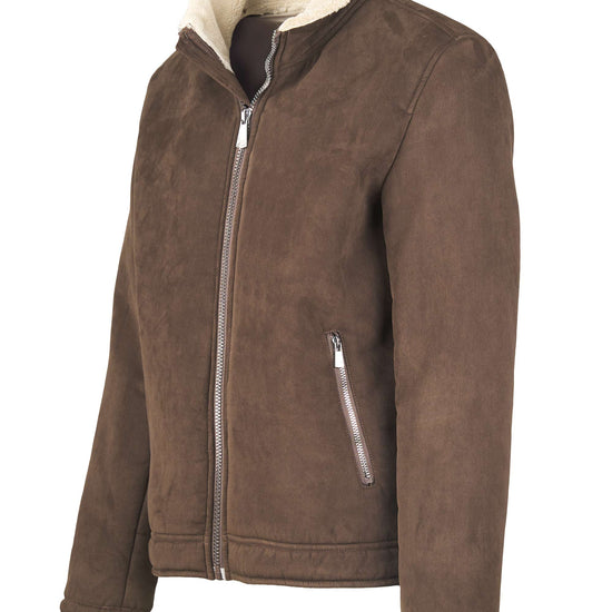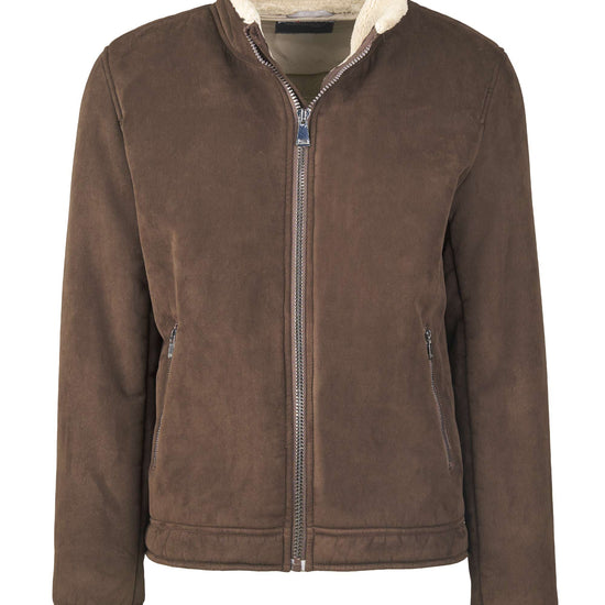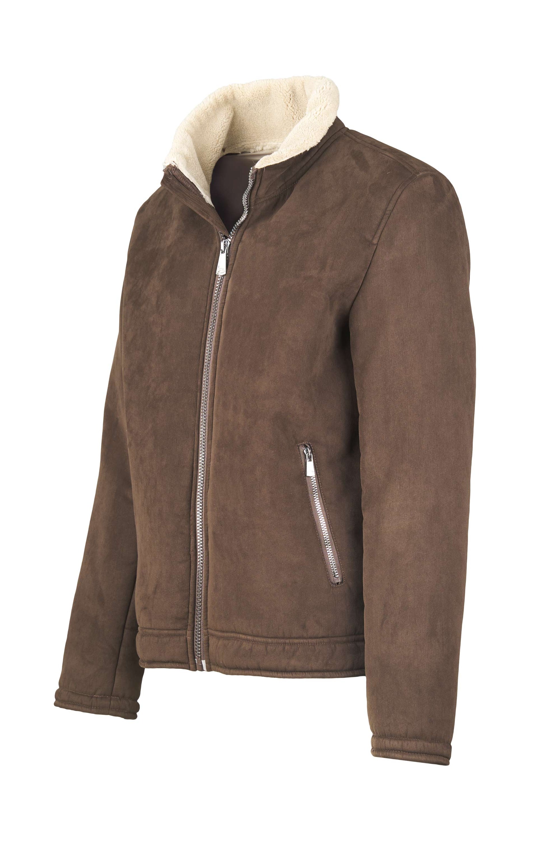 Esterno effetto suede morbido; interno in pelliccia sintetica tipo sherpa sul collo; chiusura frontale con zip in metallo; tasche laterali scaldamani con zip; fondo e polsi rifiniti con leggera imbottitura e impunture di rinforzo; cuciture ribattute e spalle pulite; vestibilità regolare e lunghezza ai fianchi.