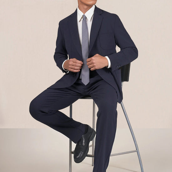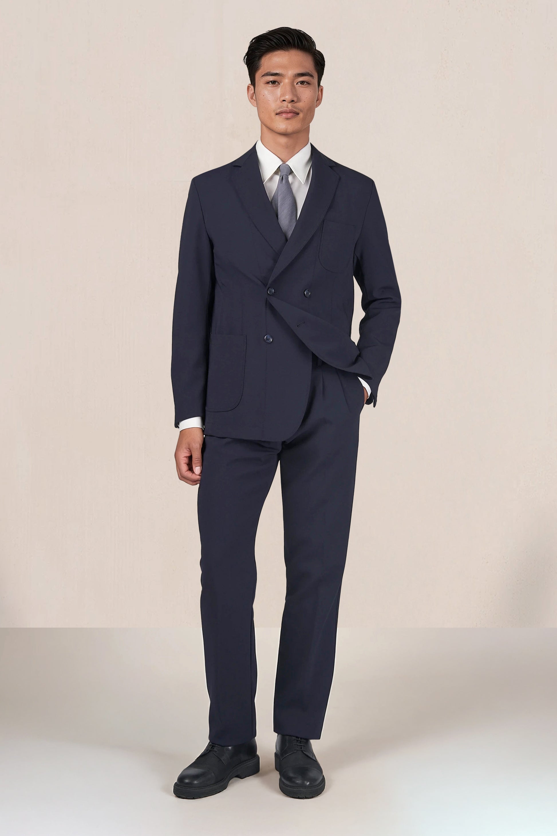 Mid-rise; belt loops; zip fly with extended tab & button + internal button. Double front pleats; slanted side pockets; back welt pockets with button. Straight, slightly tapered leg with pressed crease; clean, uncuffed hem. Carefully finished seams for a crisp, long-lasting silhouette.
