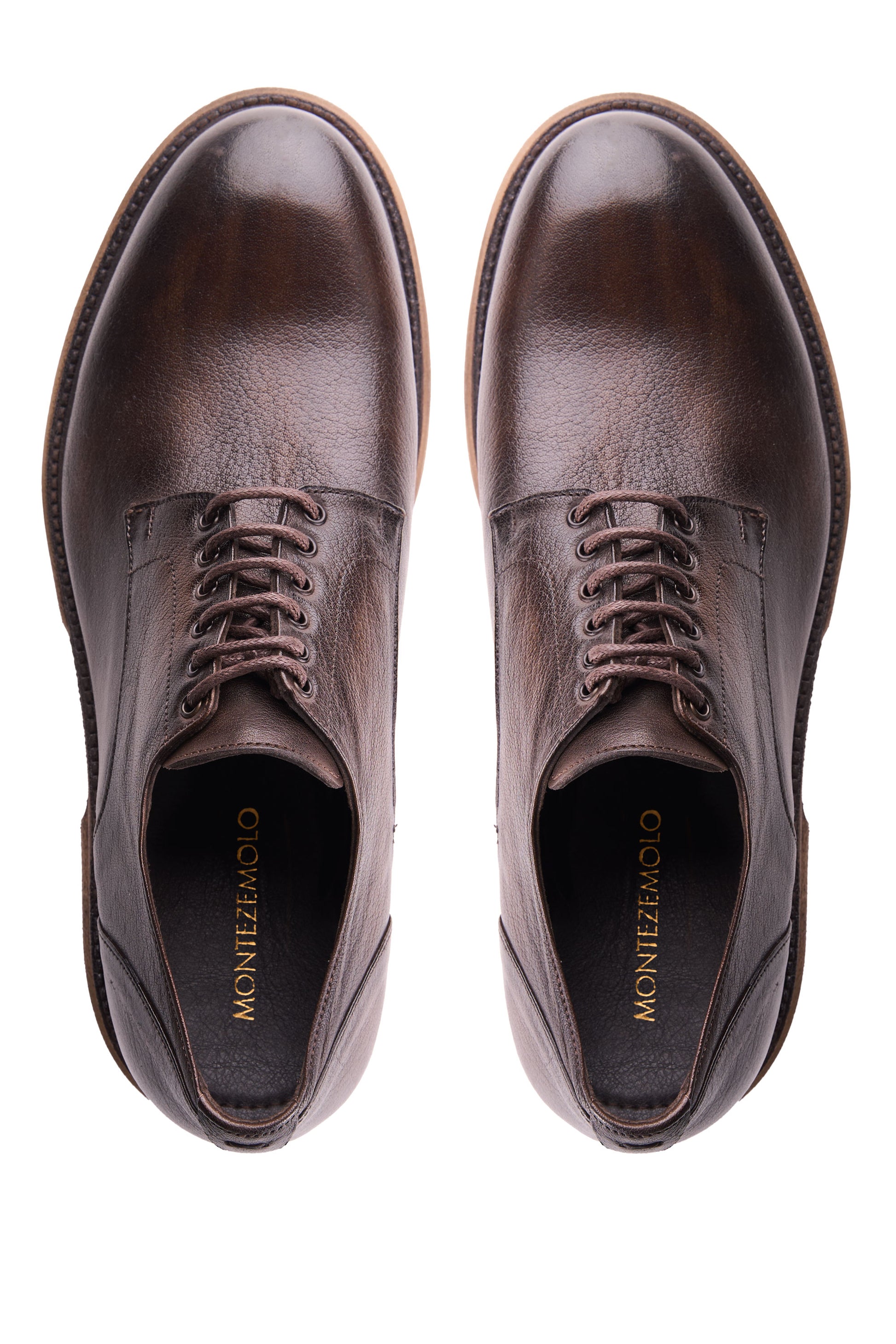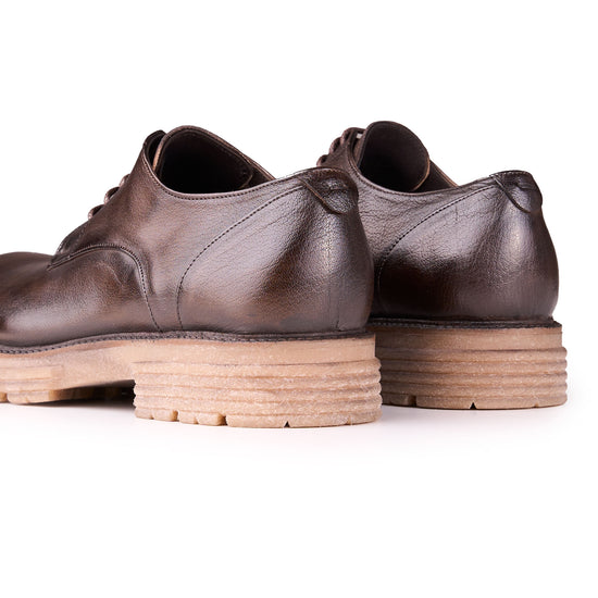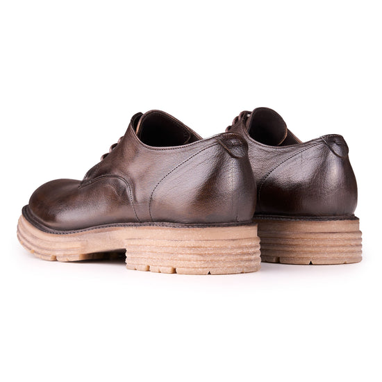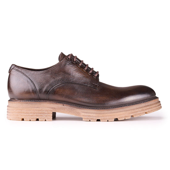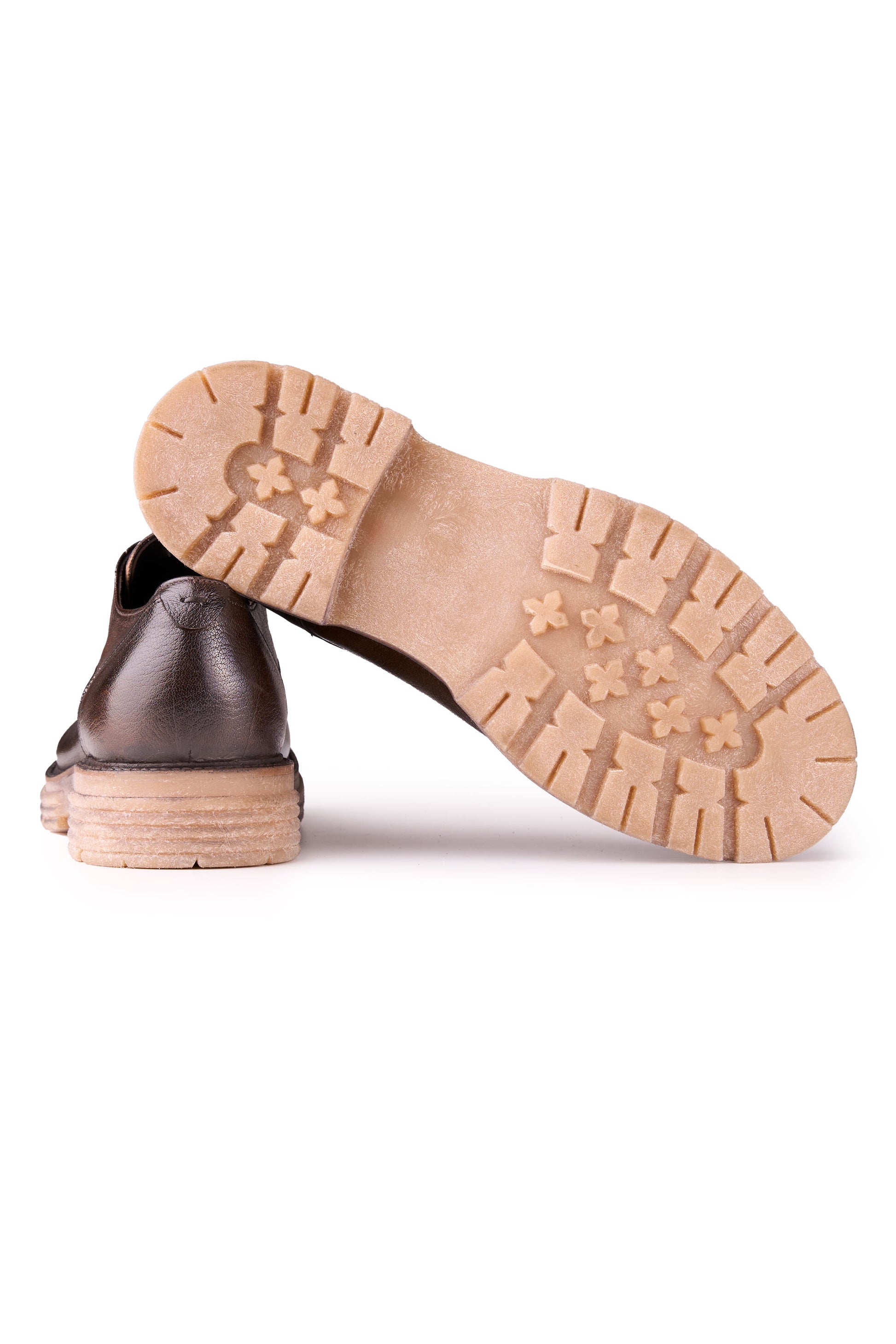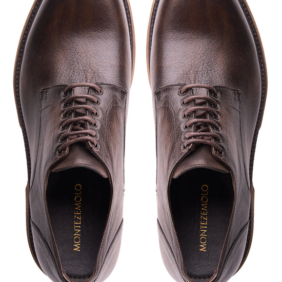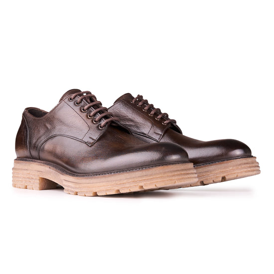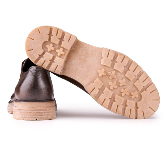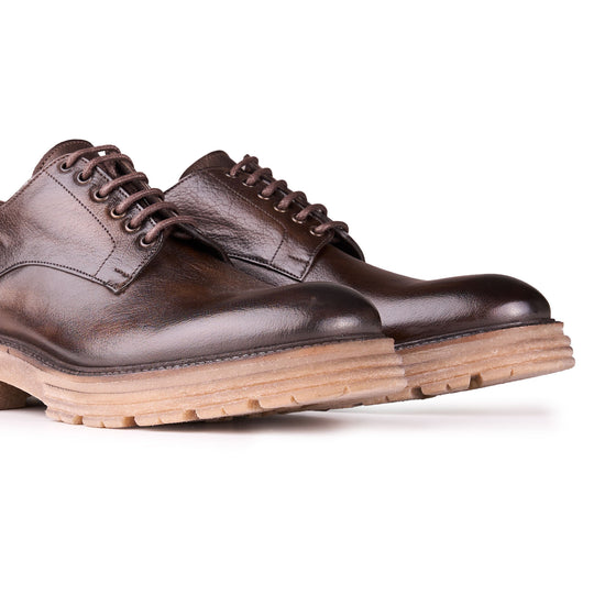 antiqued full-grain leather, semi-gloss finish, naturally textured upper, blake construction, lugged crepe rubber sole, leather lining, tone-on-tone laces, winter comfort and grip