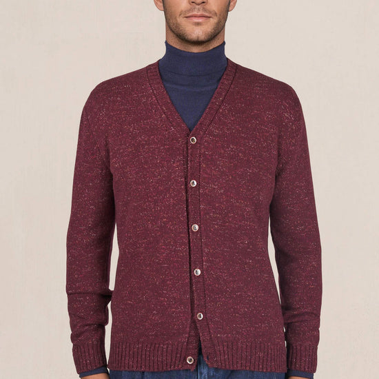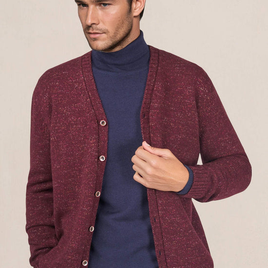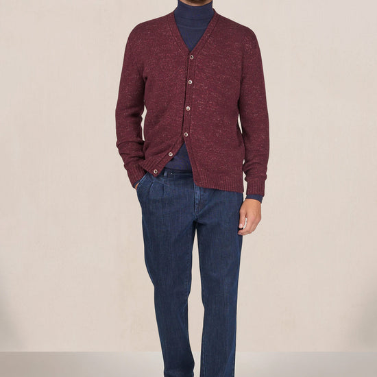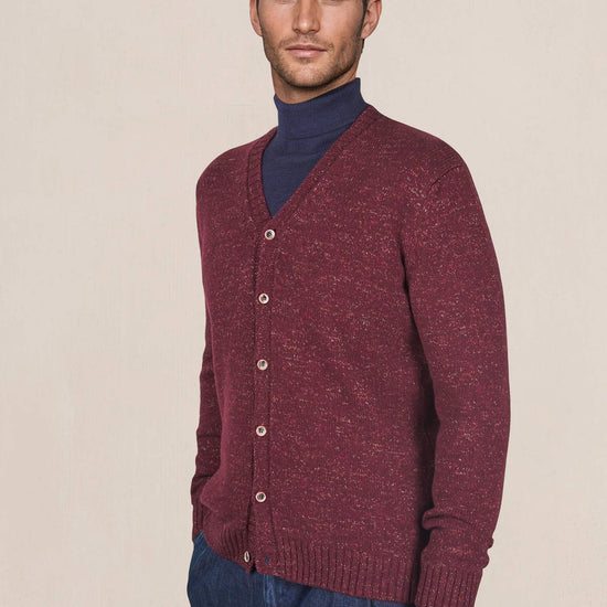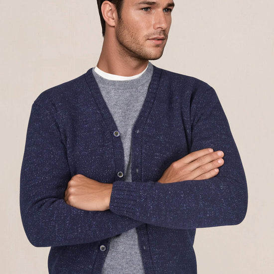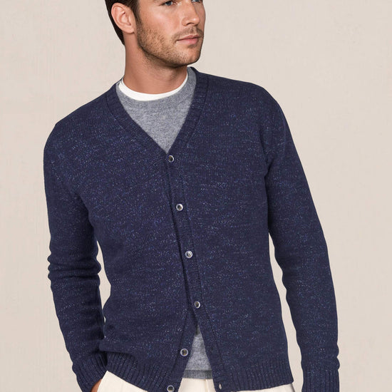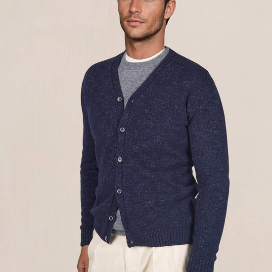 V-neck cardigan, spun from merino wool and cashmere for a soft, temperature-regulating, naturally stretchy hand. Fully-fashioned construction traces the body with ease; central button placket with horn-effect buttons, compact rib trims and set-in shoulders for a neat silhouette. Subtle tweed-like nep texture adds character while staying versatile; tidy inside finishes built to last. Ideal over a shirt or roll-neck, on or off a jacket.