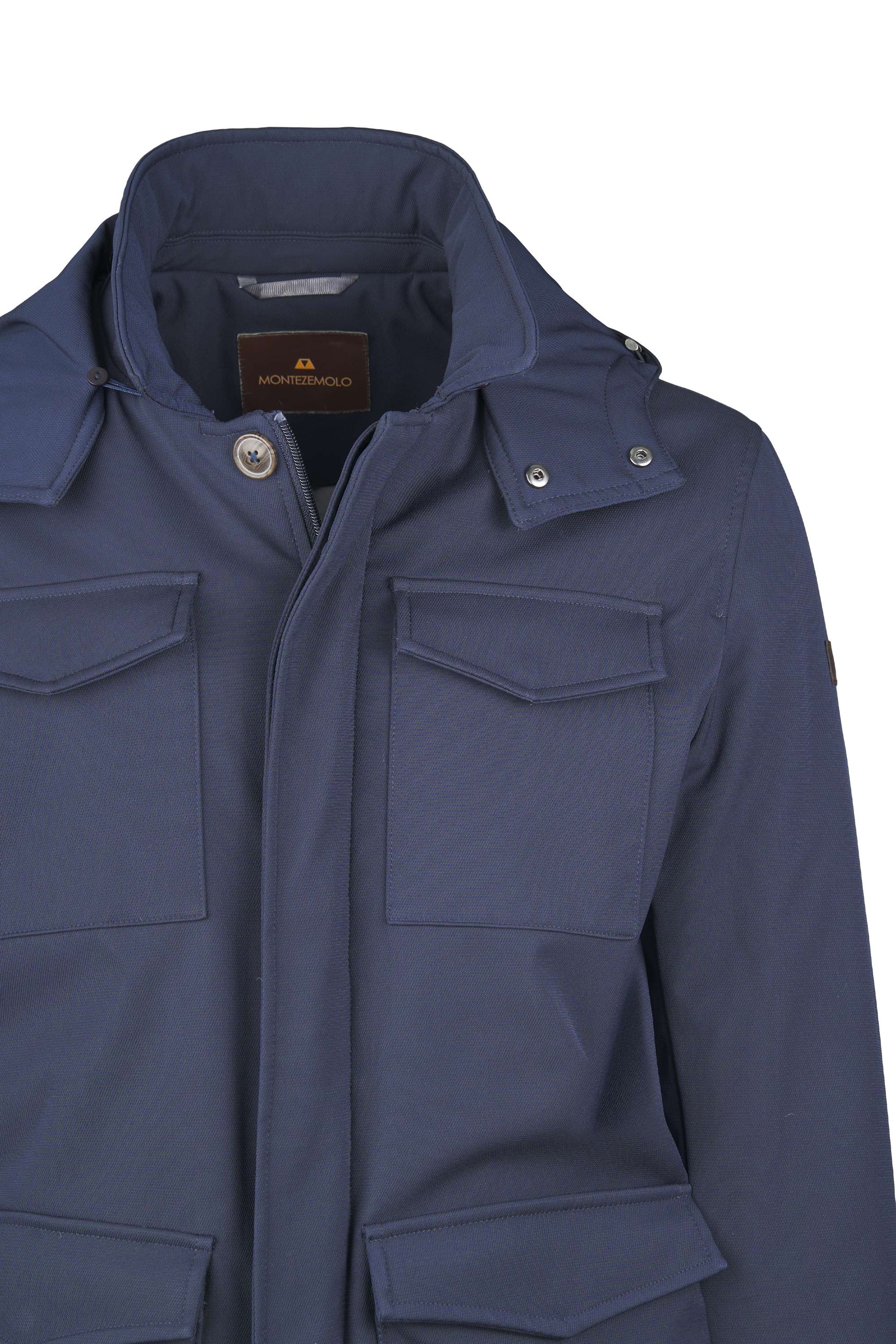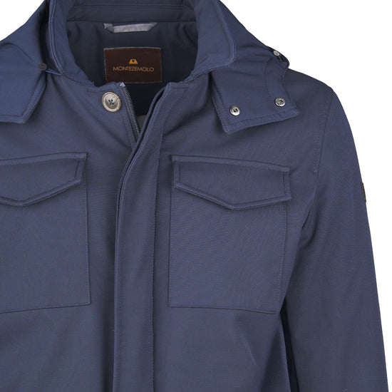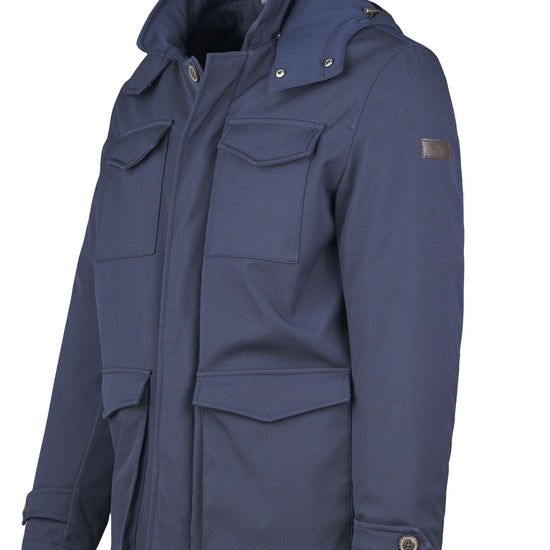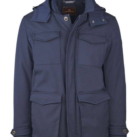 Compact outer fabric with firm hand; lightweight-warm polyester fiber padding; detachable hood with snap buttons; front closure with hidden zipper and snap storm placket; four flap patch pockets (two chest, two lower); wind-shielding stand collar; adjustable tab cuffs; straight, balanced hem; full lining for comfort; neat top-stitching and sleeve logo patch.