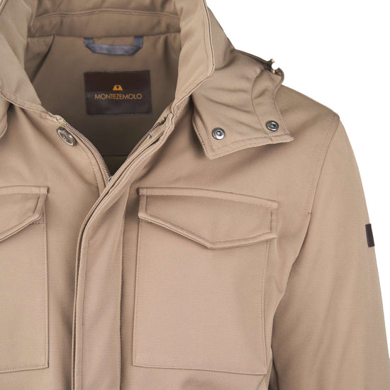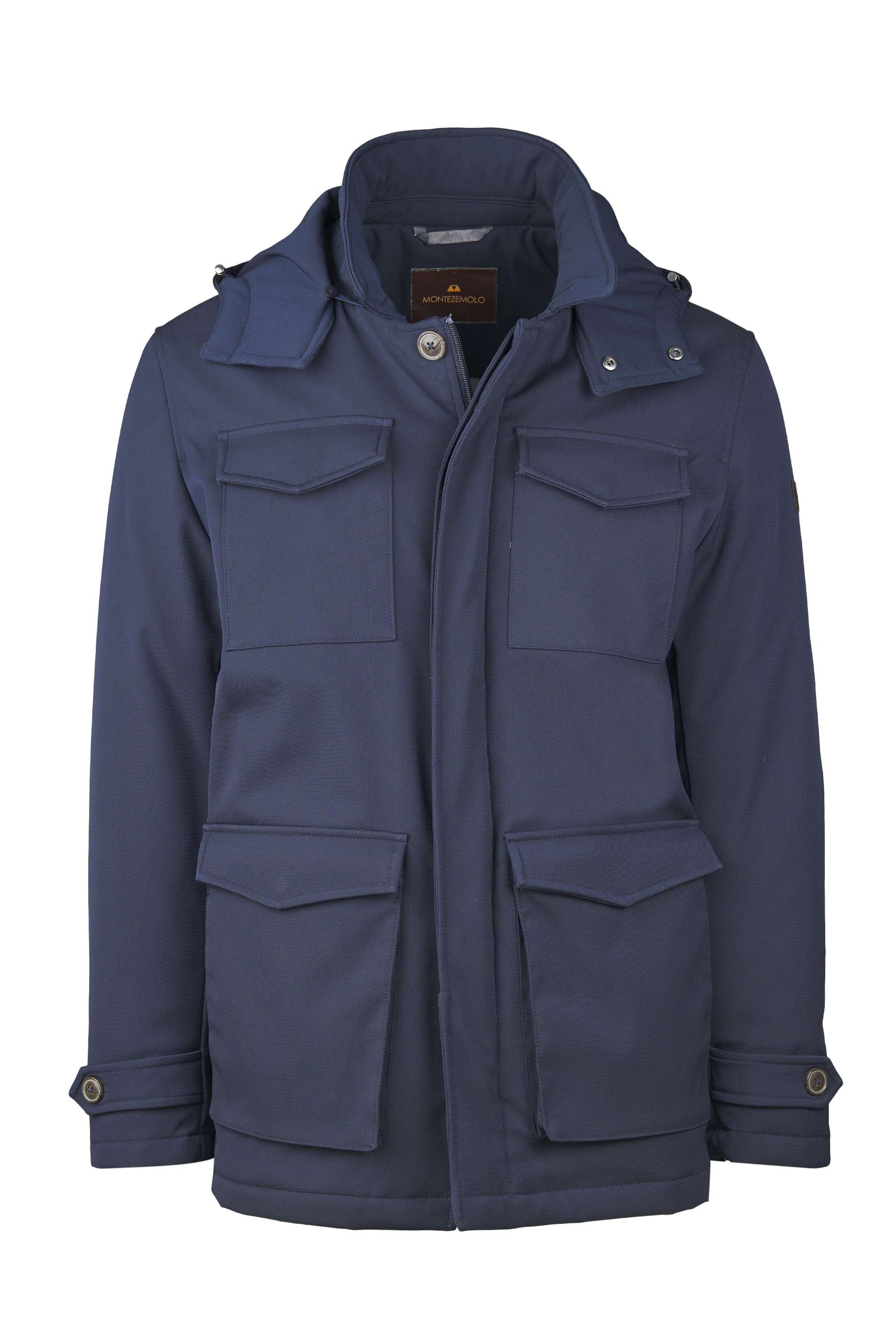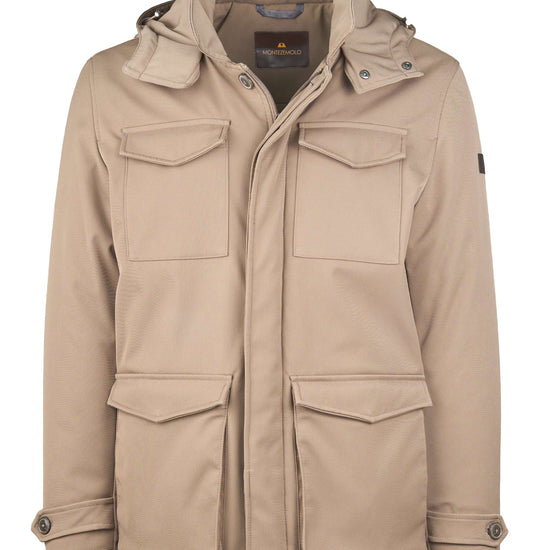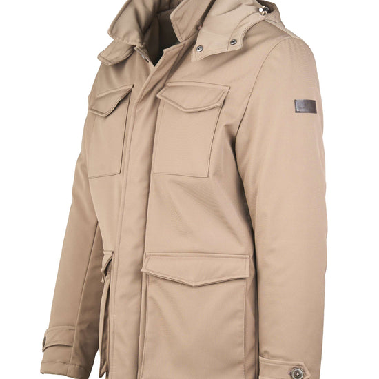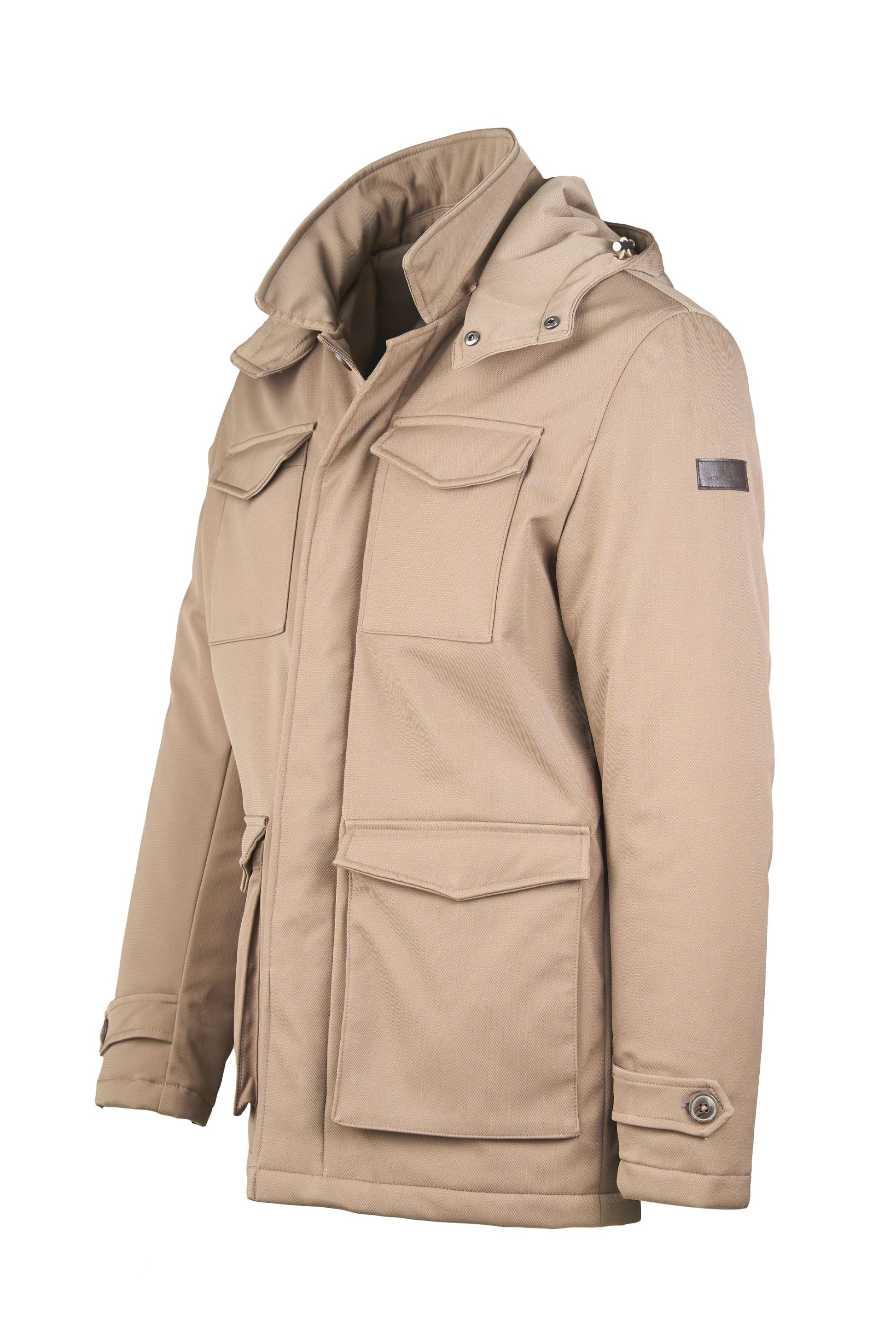Inspired by classic military field wear, this jacket blends everyday protection with a clean, functional look. The compact outer fabric has a firm, even hand, while the polyester-fiber padding delivers lightweight warmth without bulk. A wind-blocking stand collar integrates a detachable hood secured with snap buttons; the front closes with a concealed zipper and snap-storm placket to keep out drafts and light moisture. Four generous flap pockets—two on the chest and two at the hips—carry your essentials in style. Adjustable tab cuffs, a straight, balanced hem, crisp top-stitching and a subtle sleeve logo patch round off a practical, versatile piece that pairs effortlessly with denim, chinos or technical trousers.