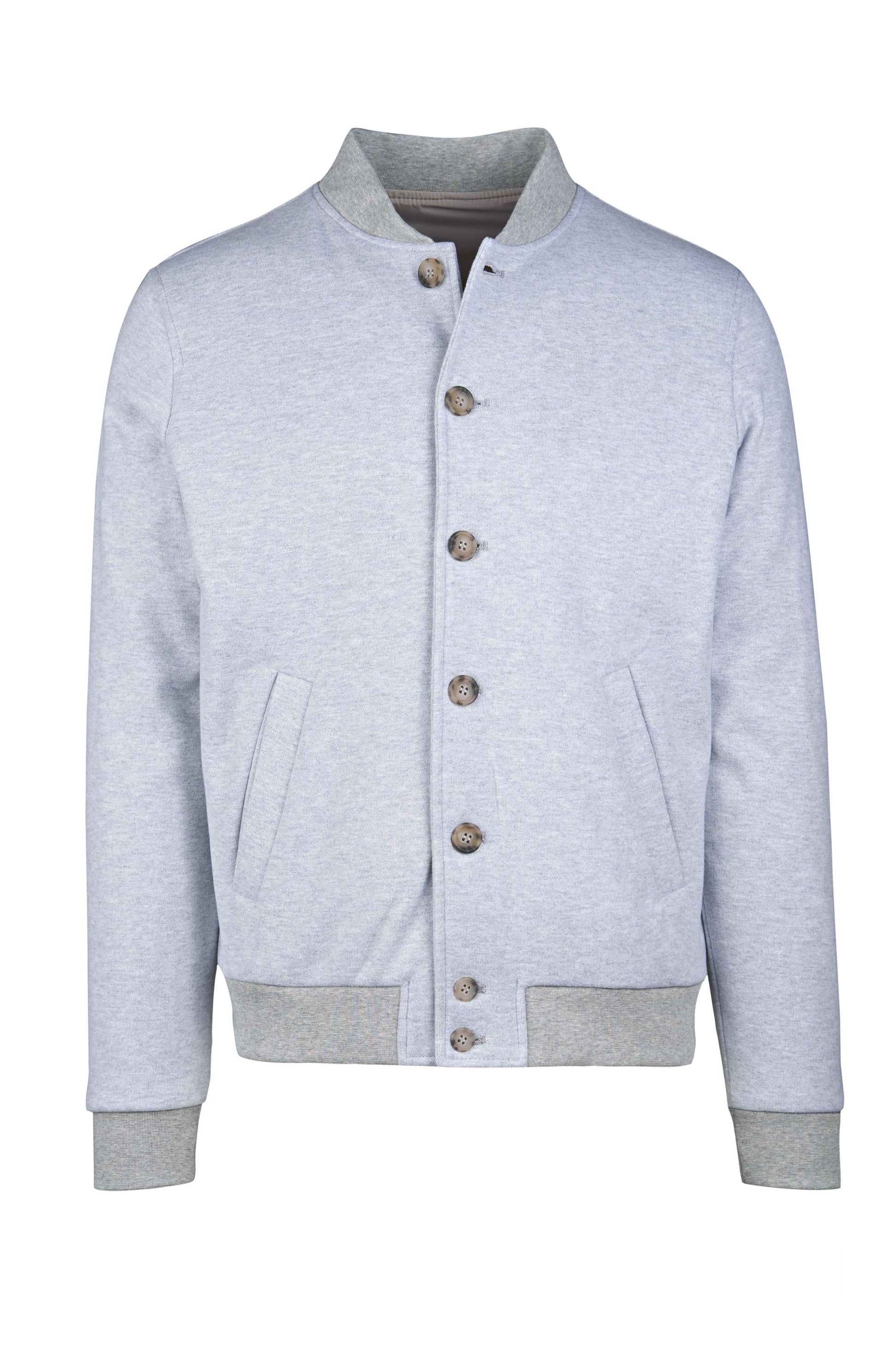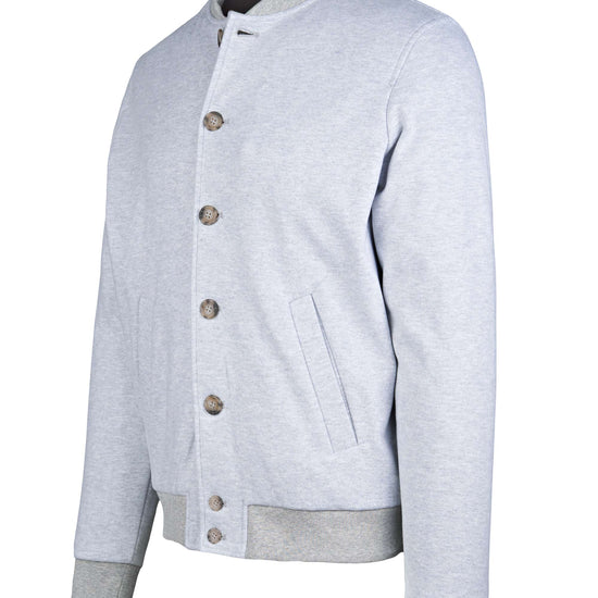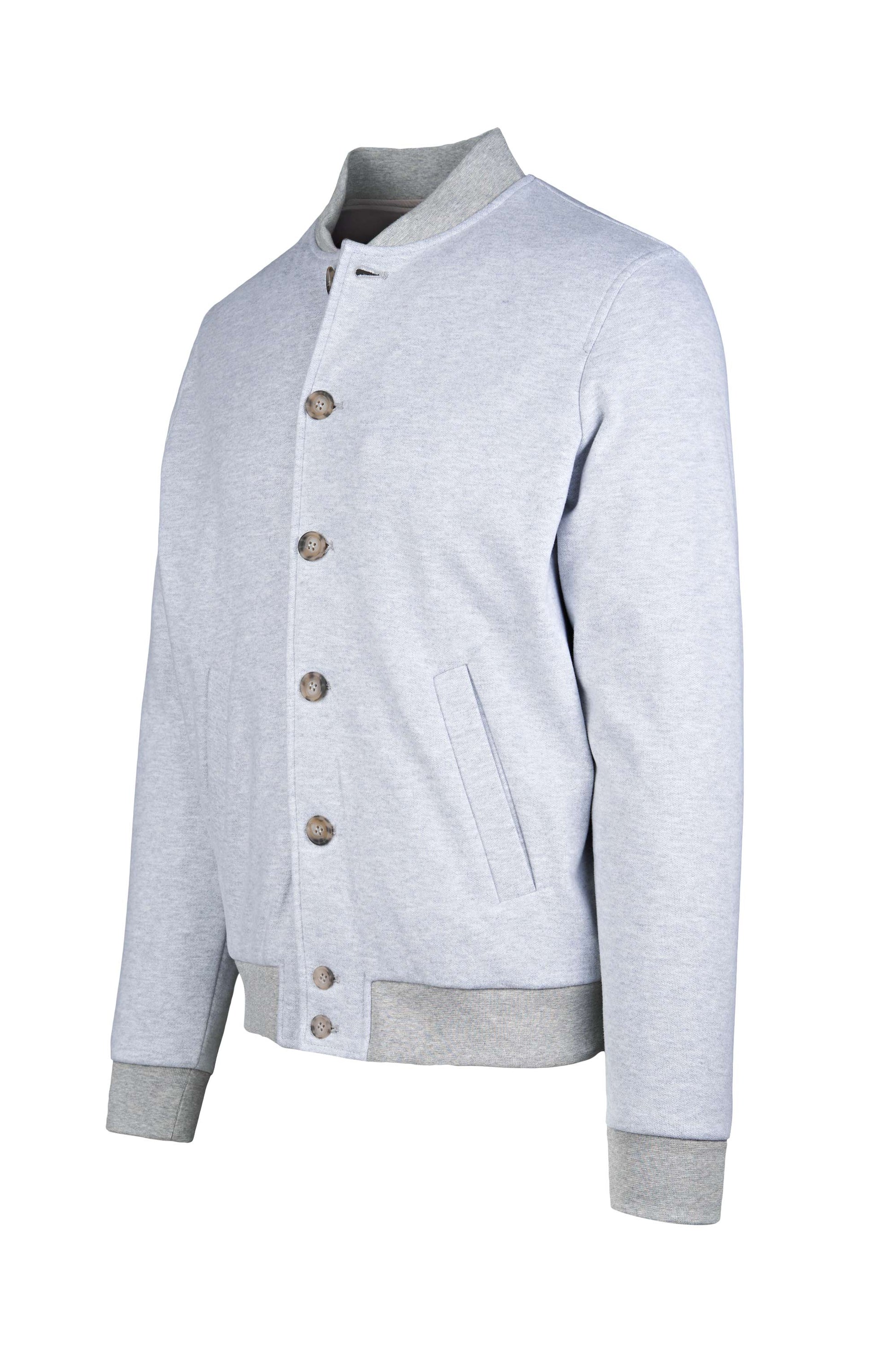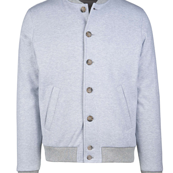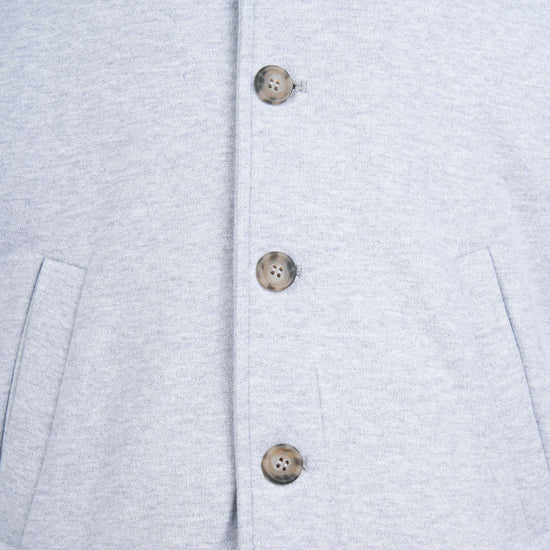 Jacket crafted from winter-weight PIMA cotton jersey with a rich melange texture and a light padded fill that delivers cosy warmth without bulk. The clean bomber-inspired build features a short rib-knit collar, a full front button closure with horn-effect buttons and two slanted welt hand pockets. Ribbed hem and cuffs keep warmth in and sharpen the silhouette. The versatile heather grey hue makes it an easy pairing with denim, chinos or joggers for refined off-duty wear.
